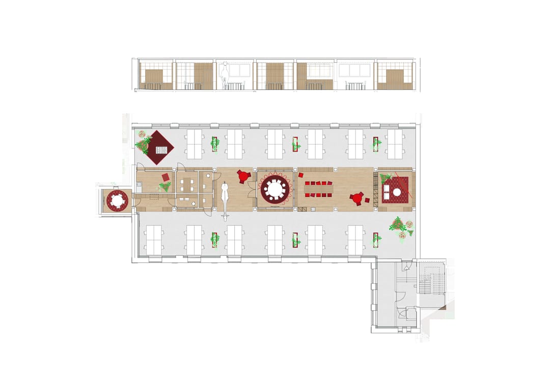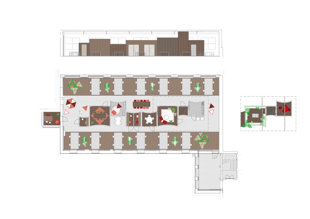 - Op verdieping 2 gebouw 4 en gebouw 6 samenvoegen: in totaal ca. 946 m² kantoorruimte