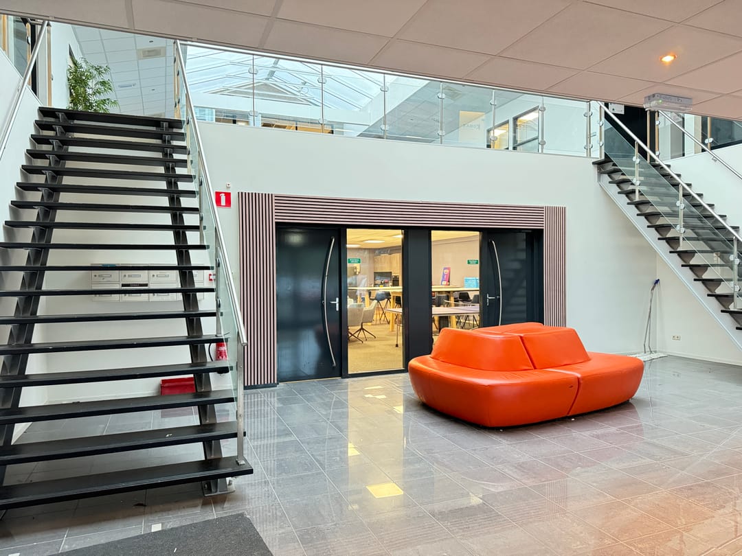 Entreedeur op de begane grond met trap naar de eerste verdieping. Vanaf is de eerste verdieping is een trap naar de tweede verdieping waar vier kantoorruimtes en vier toiletten zijn.
