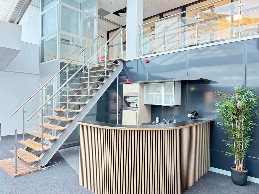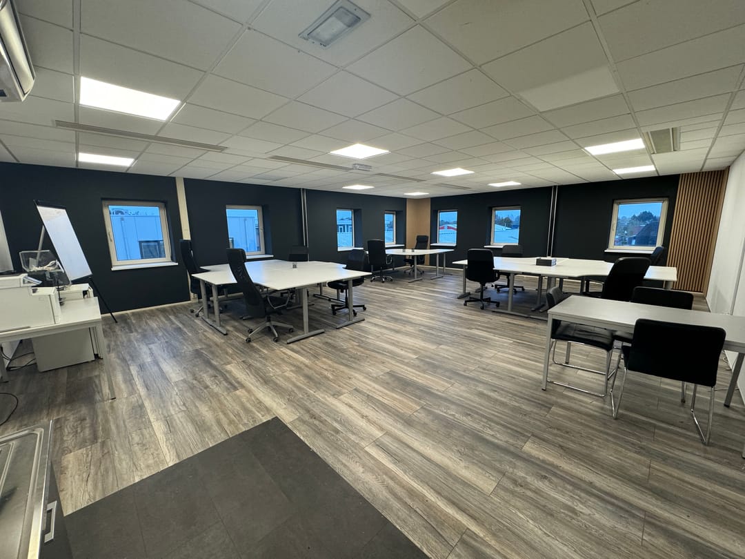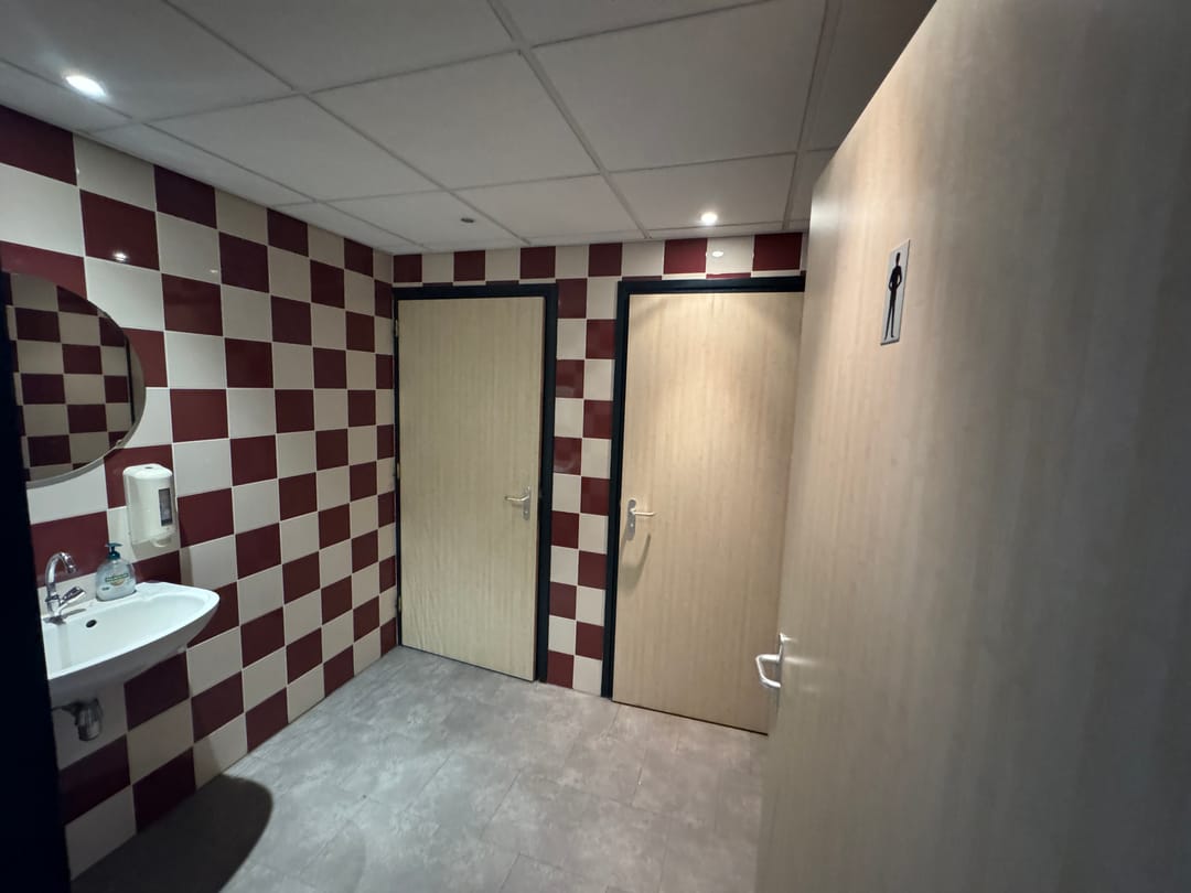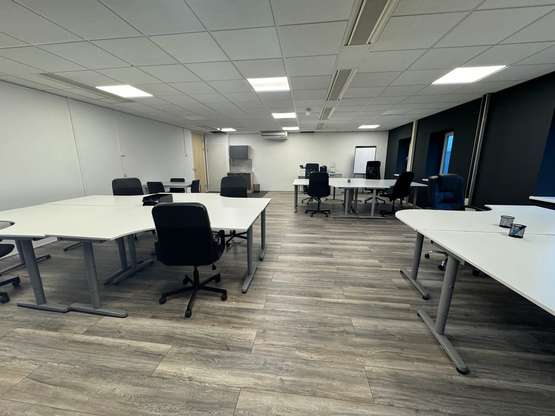Systeemplafond met verlichting, laminaat, airco, voldoende stroompunten, eigen pantry en vier gedeelde toiletten met fontein.