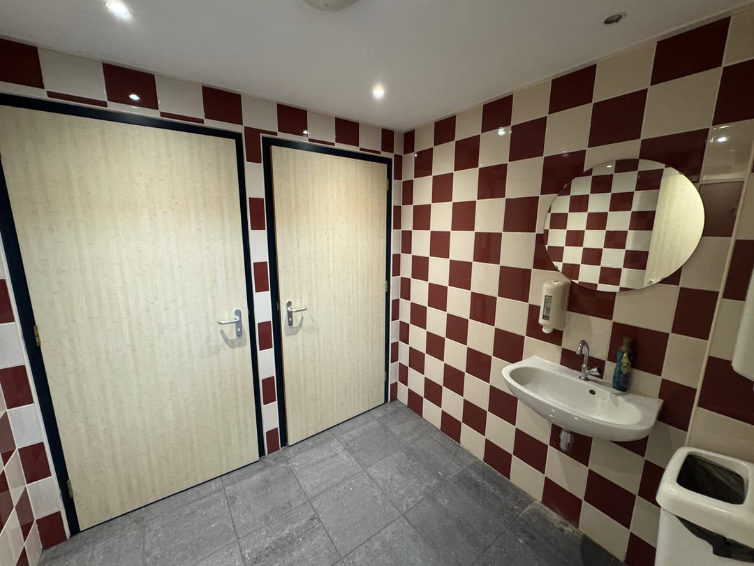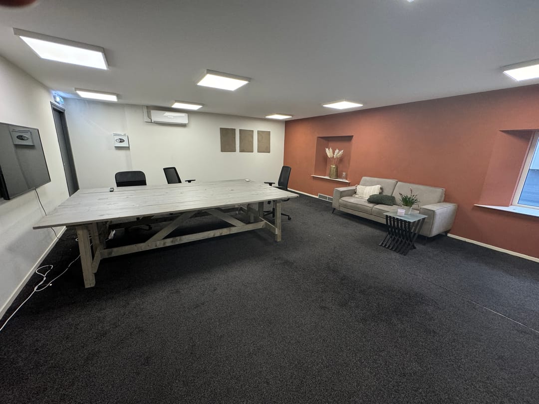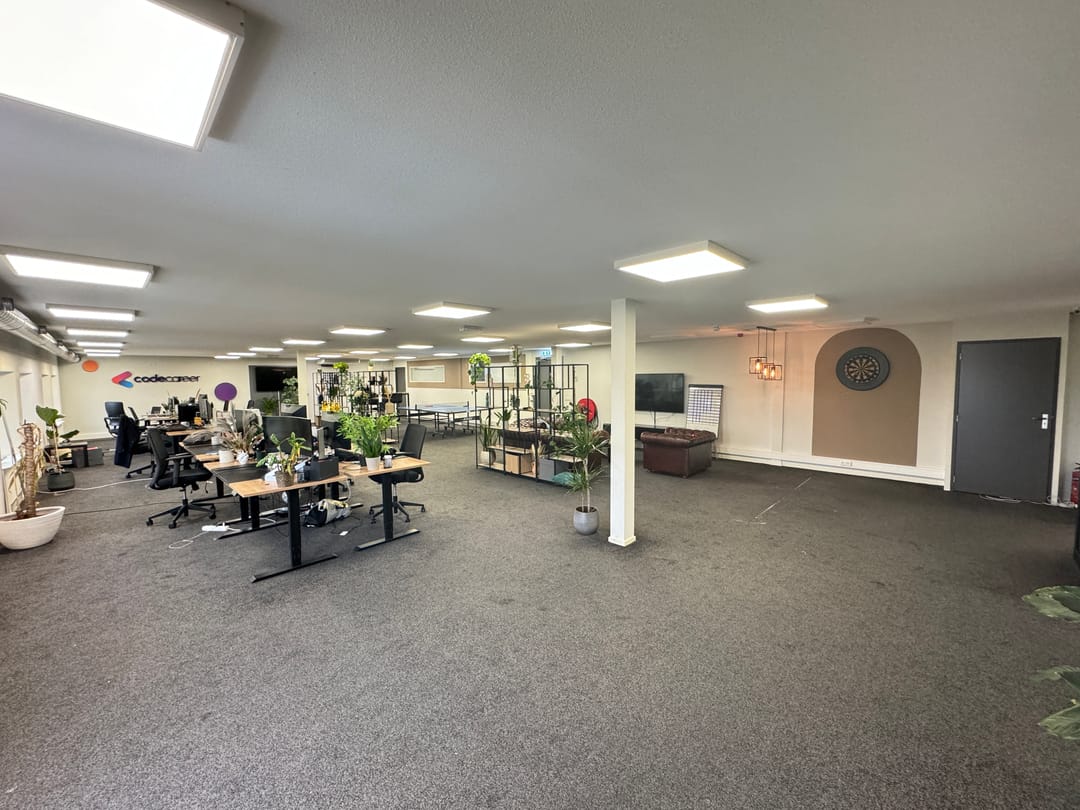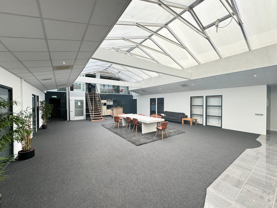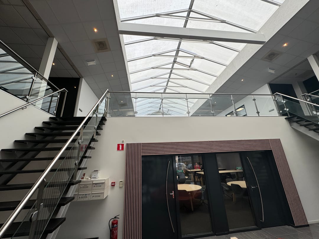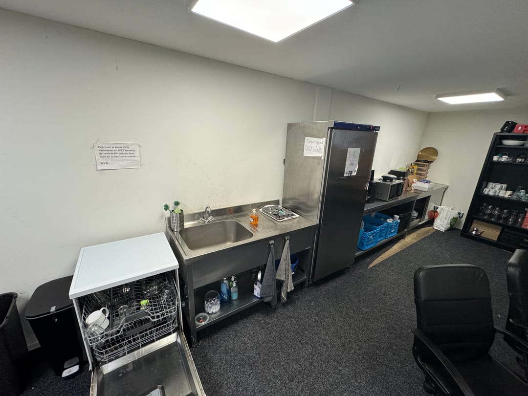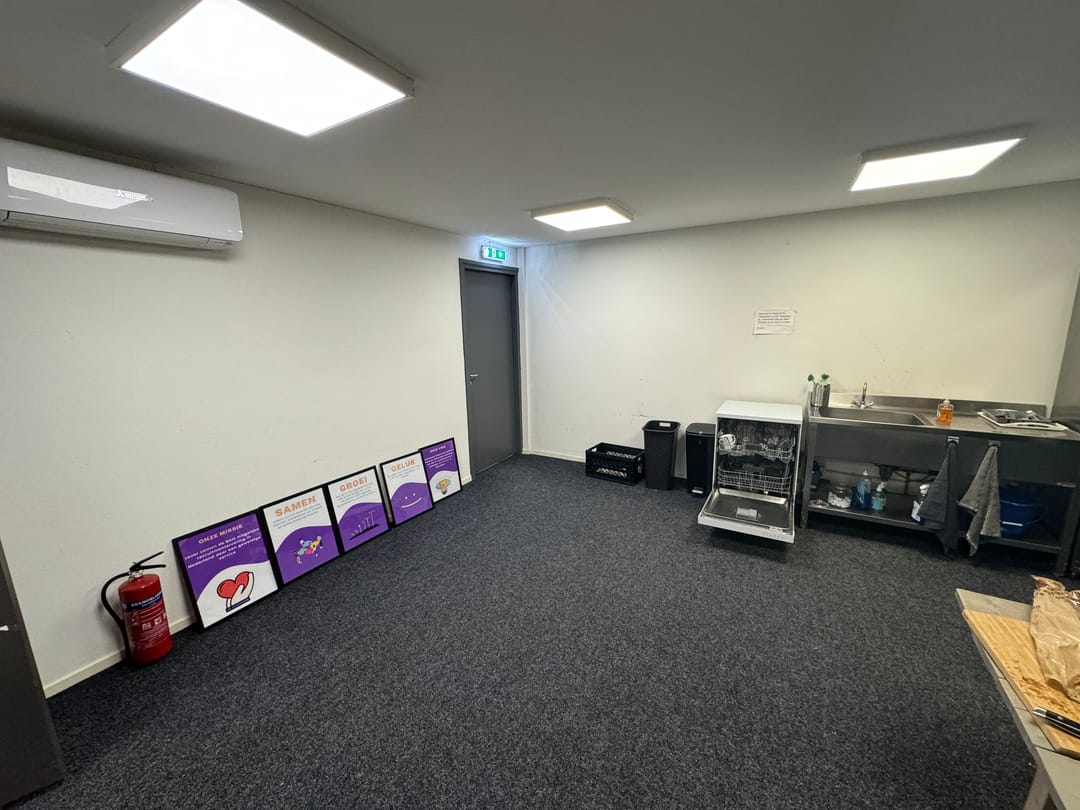 Systeemplafond, vloerbedekking, kantine, toilet en airconditioning.