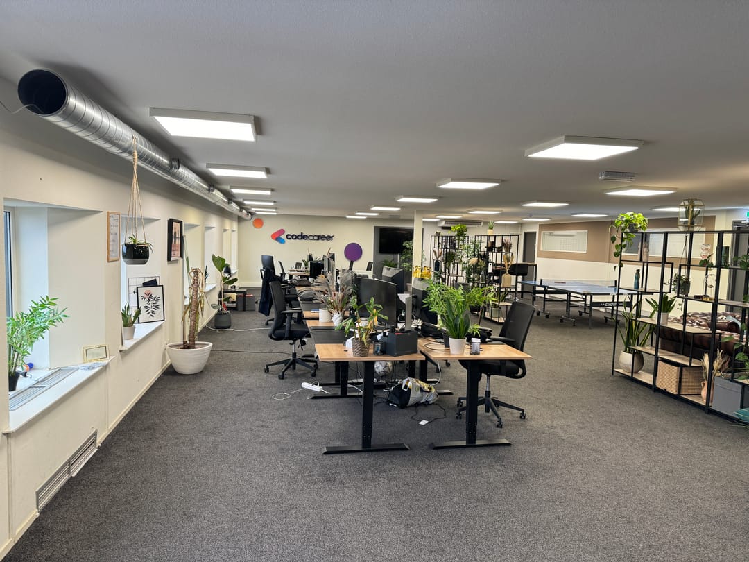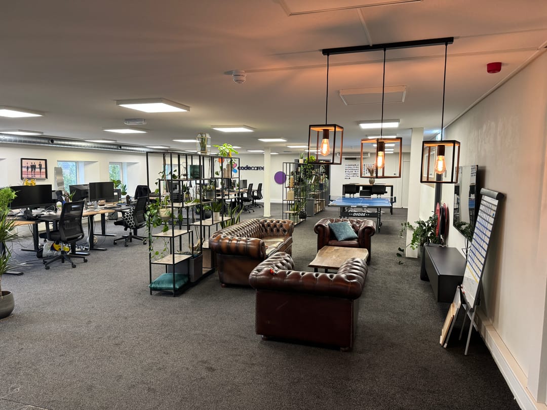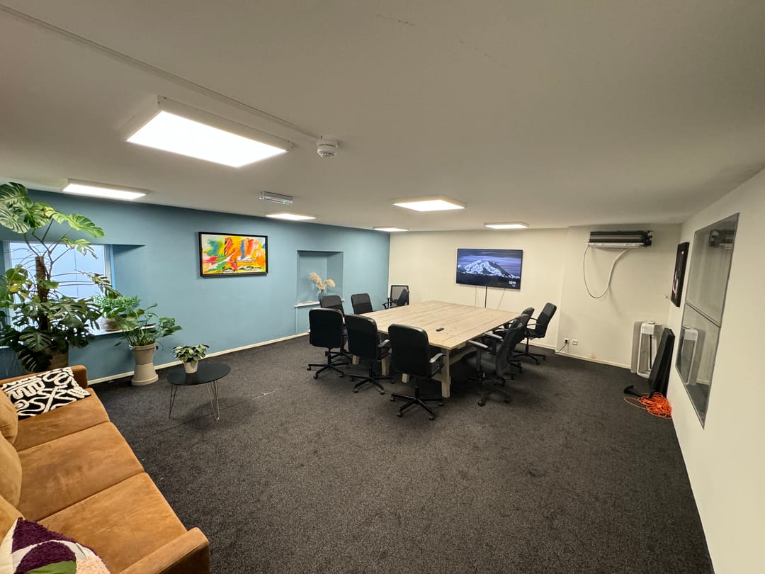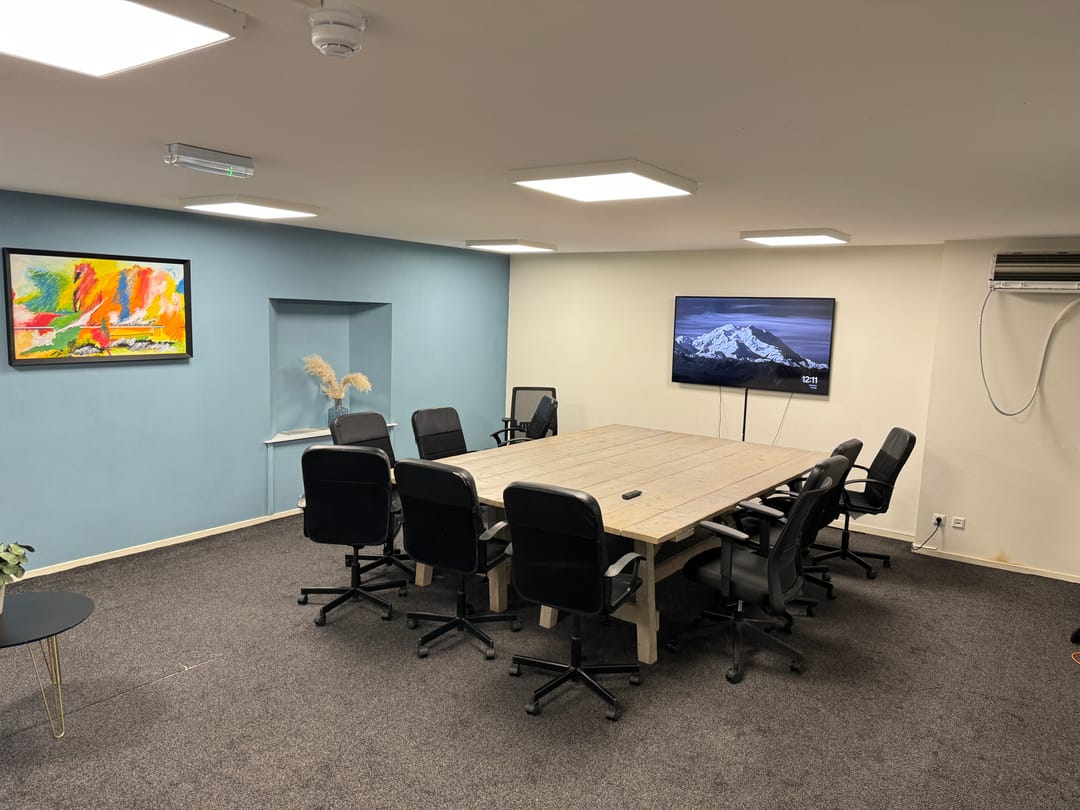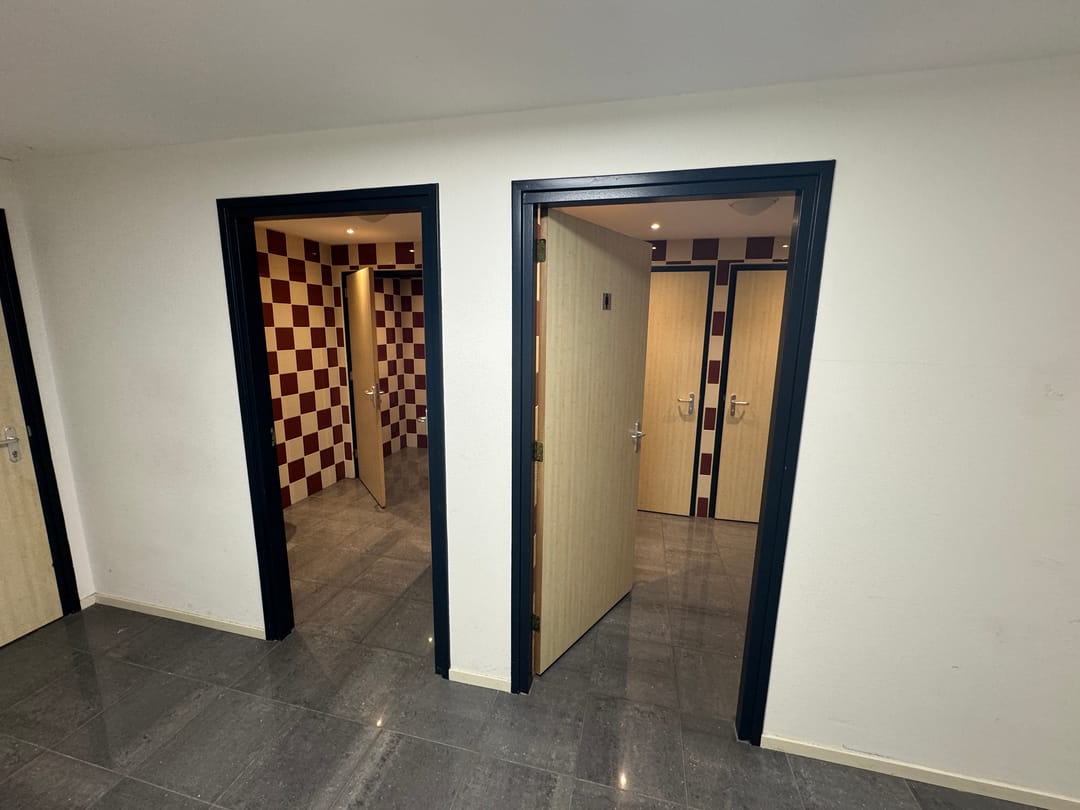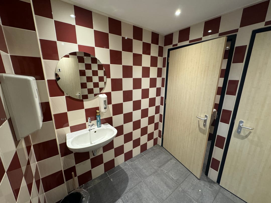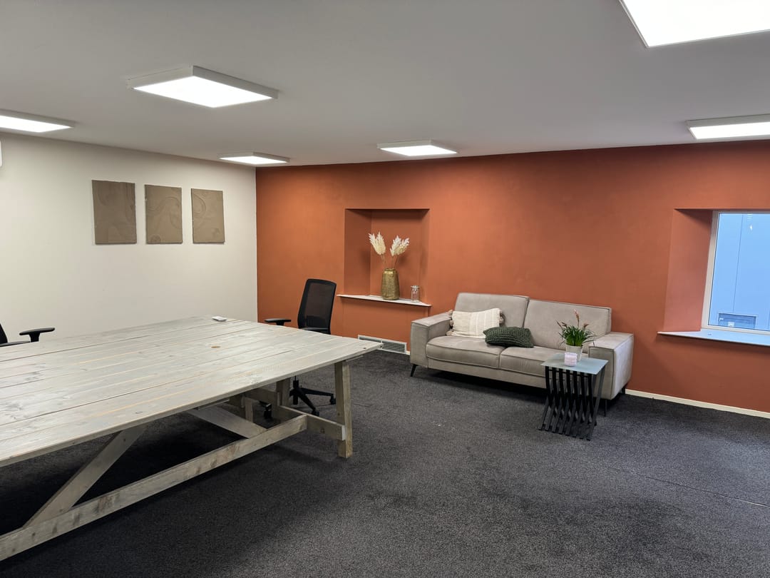 Systeemplafond, vloerbedekking, kantine, toilet en airconditioning.