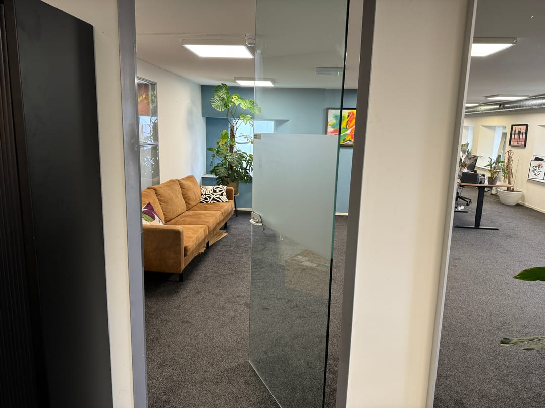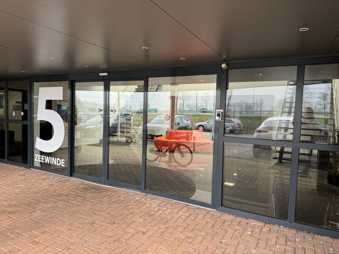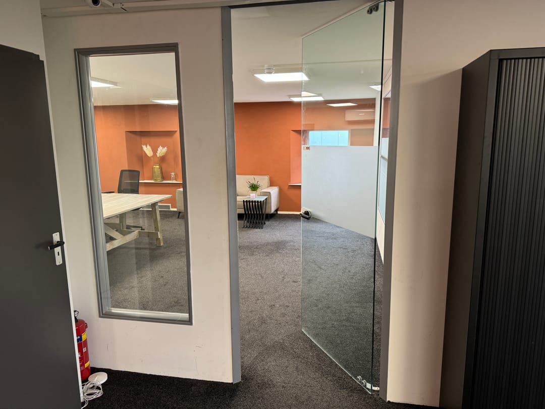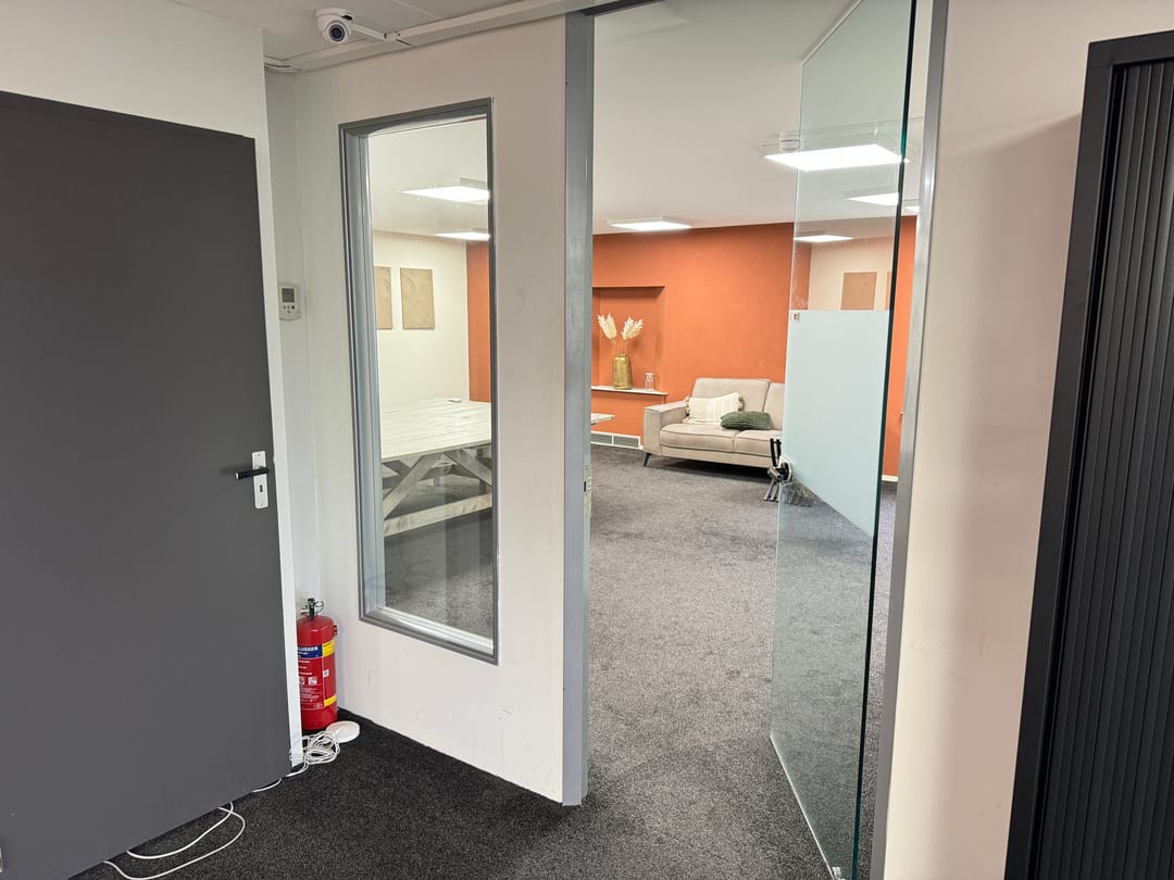 Entreedeur naar de ruime kantoorruimte, vanuit hier zijn links twee spreekruimtes en rechts is de kantine.