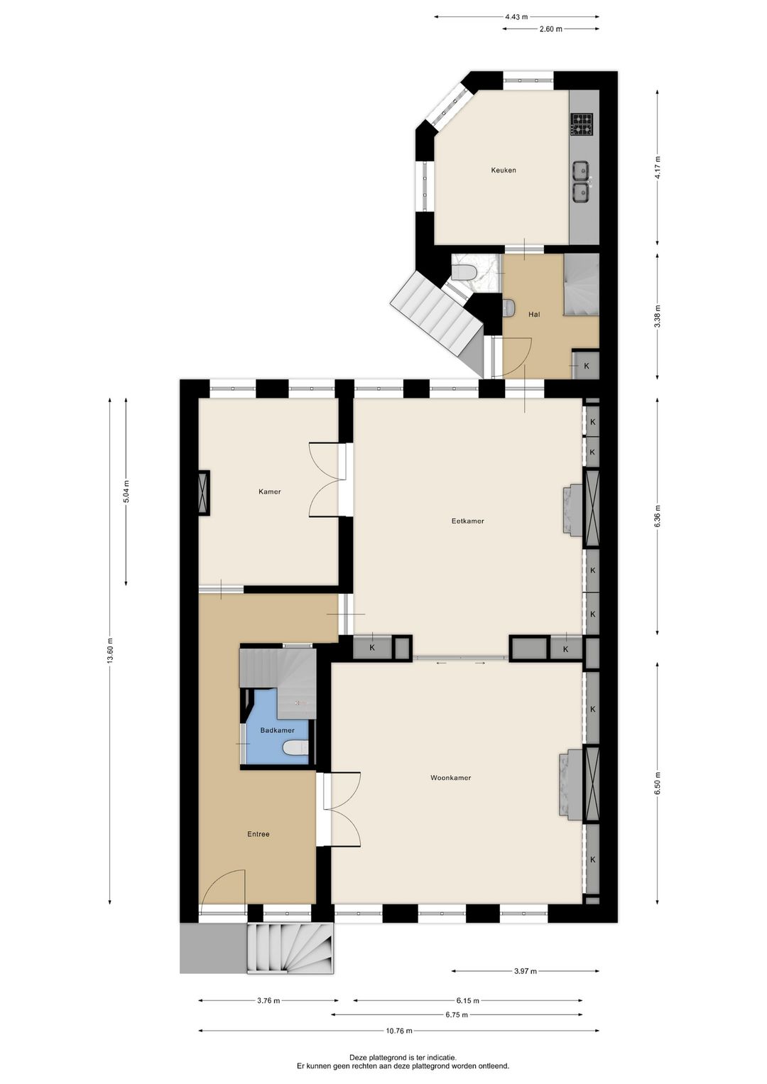 Statige entree, lichte hal met marmeren vloer en toilet, dubbele deuren naar een indrukwekkende en royale kamer-en-suite (totaal 80m²) met imposante schuifdeuren, rijk geornamenteerde plafonds en twee rijk uitgevoerde schouwen. Dubbele deuren, geven toegang naar een zijkamer/werkkamer (ca. 19m²). Via de achterkamer(ca. 41m²) van de kamer-en-suite kom je in een tussengelegen hal met achterdeur naar de tuin, toilet, trap naar het ondergelegen souterrain en doorloop naar de achteruitbouw met woon/eetkeuken (ca. 18m²). De keuken is heerlijk licht door de hoge ramen en voorzien van een fraai geornameenteerd plafond.