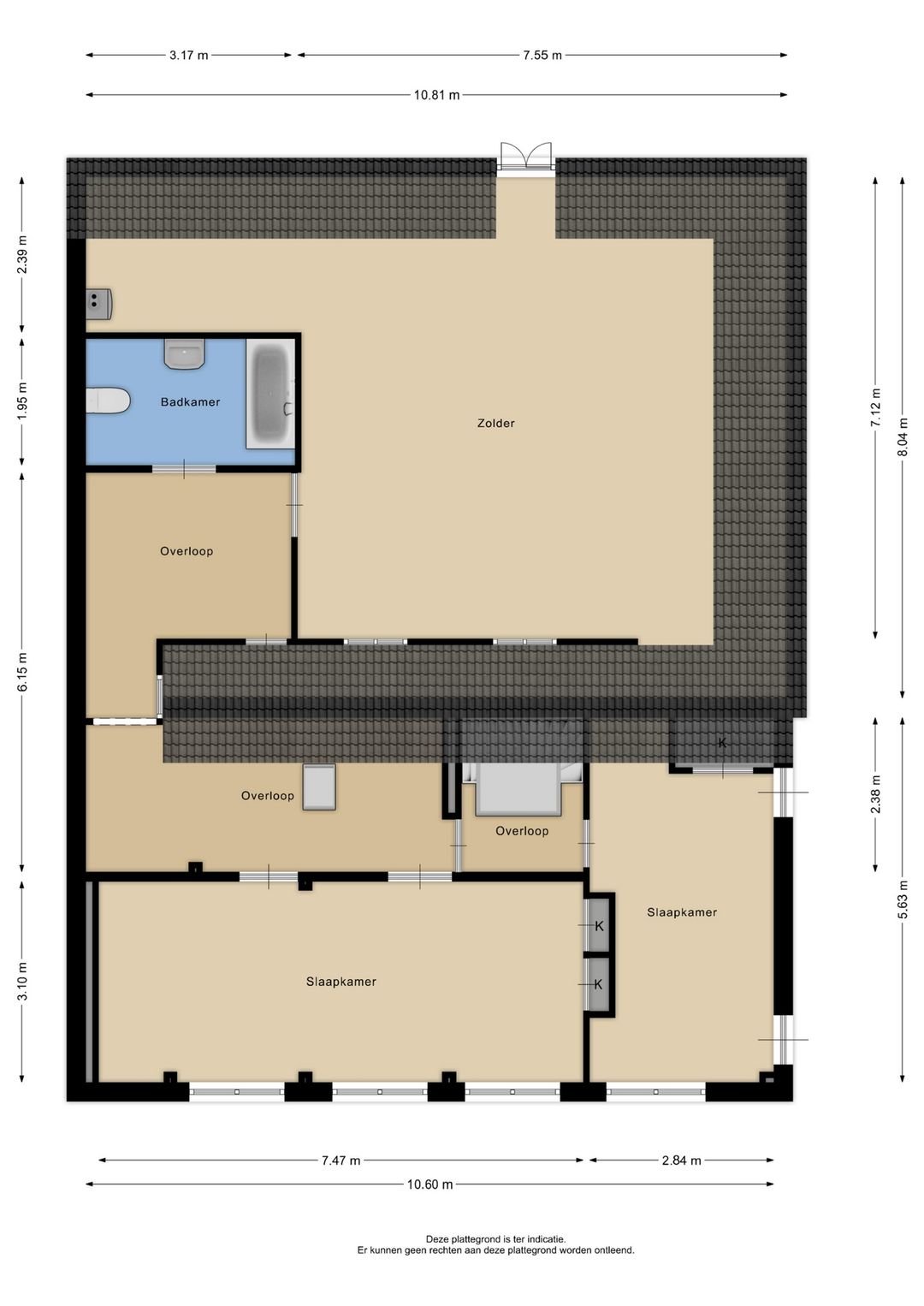 Onder de voorste van de twee dwarskappen is een grote kamer (ca. 23m²) (voorheen twee kamers) een bergzolder en overloop met doorgang naar de achterste dwarskap. Onder de tweede dwarskap aan de achterzijde bevindt zich een overloop, badkamer en een reusachtige zolderverdieping (ca. 70m²) vloeroppervlak met vele mogelijkheden.