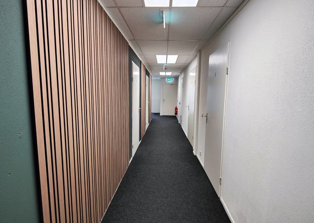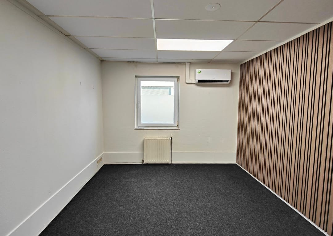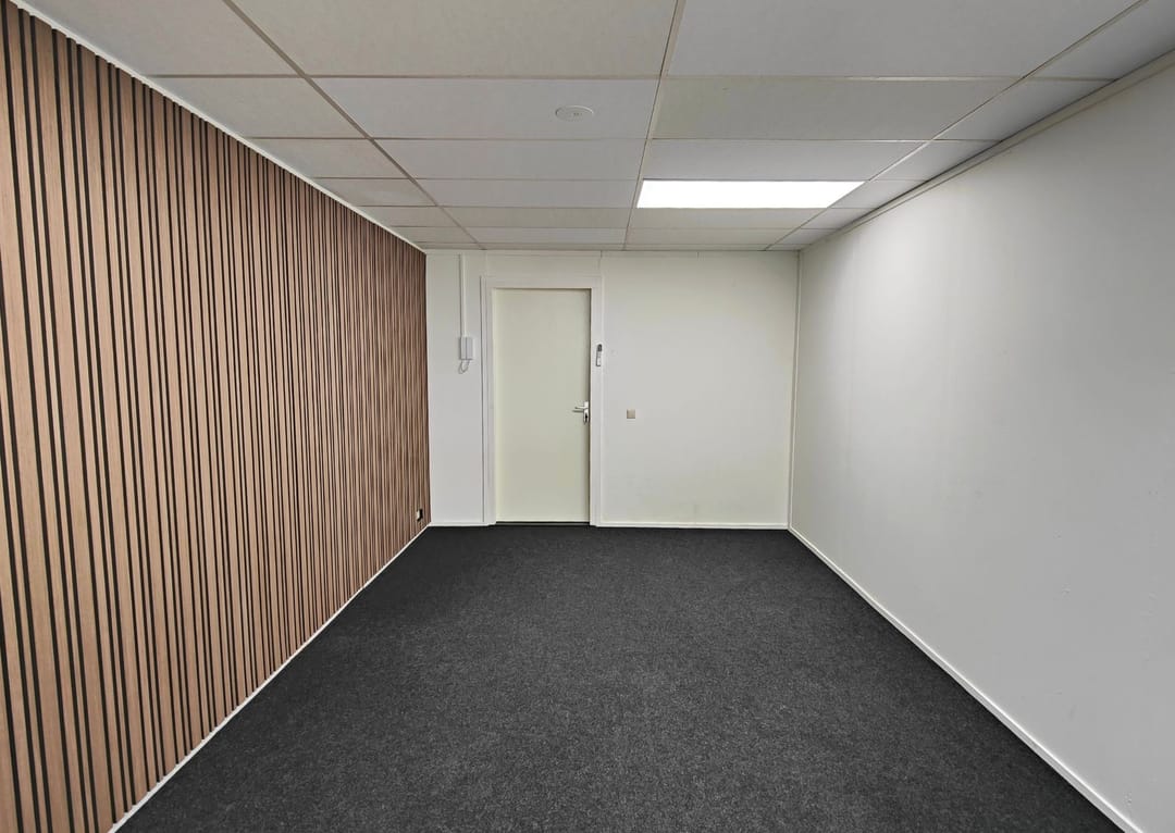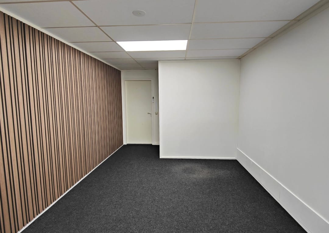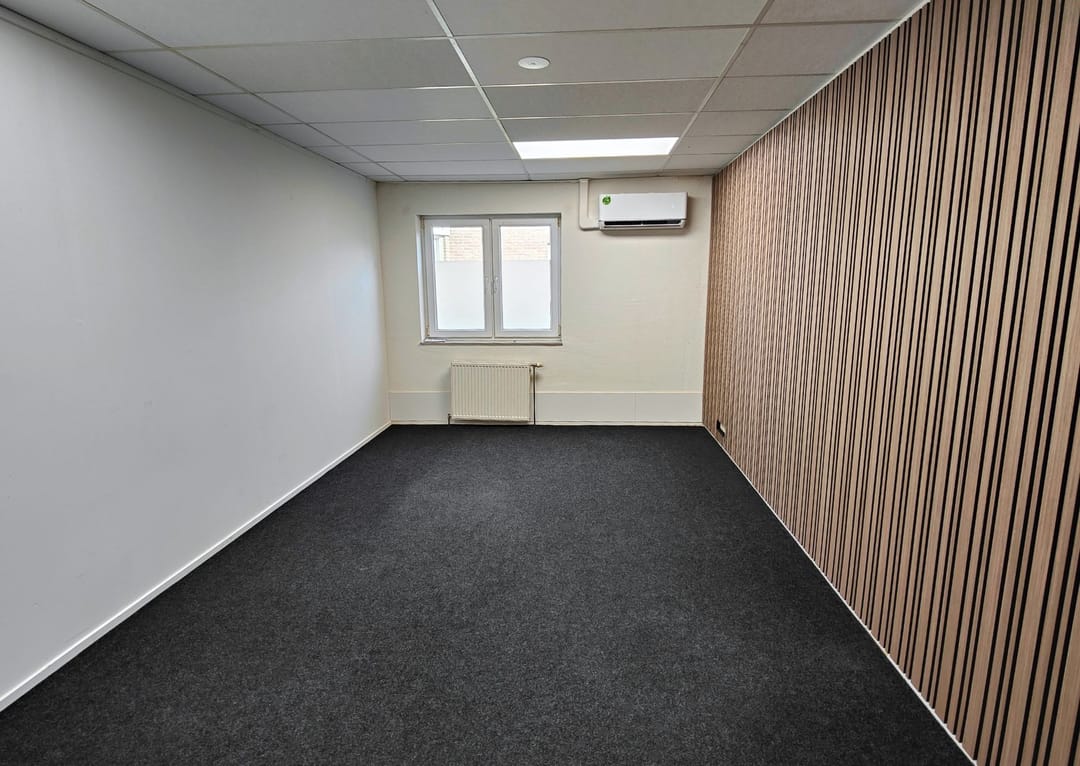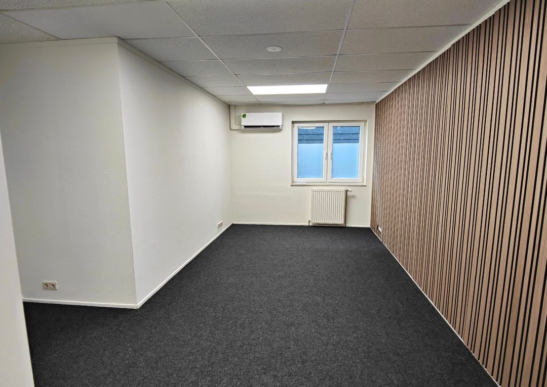 Alle kantoorruimtes zijn afgewerkt met grijze vloerbedekking en nette wandafwerking met latten, wat bijdraagt aan een representatieve uitstraling. De ramen zijn voorzien van melkfolie ten behoeve van privacy en kunnen wijd worden geopend voor natuurlijke ventilatie. Daarnaast beschikt iedere ruimte over een eigen aircosysteem waarmee zowel gekoeld als verwarmd kan worden, wat zorgt voor een aangenaam werkklimaat gedurende het gehele jaar.