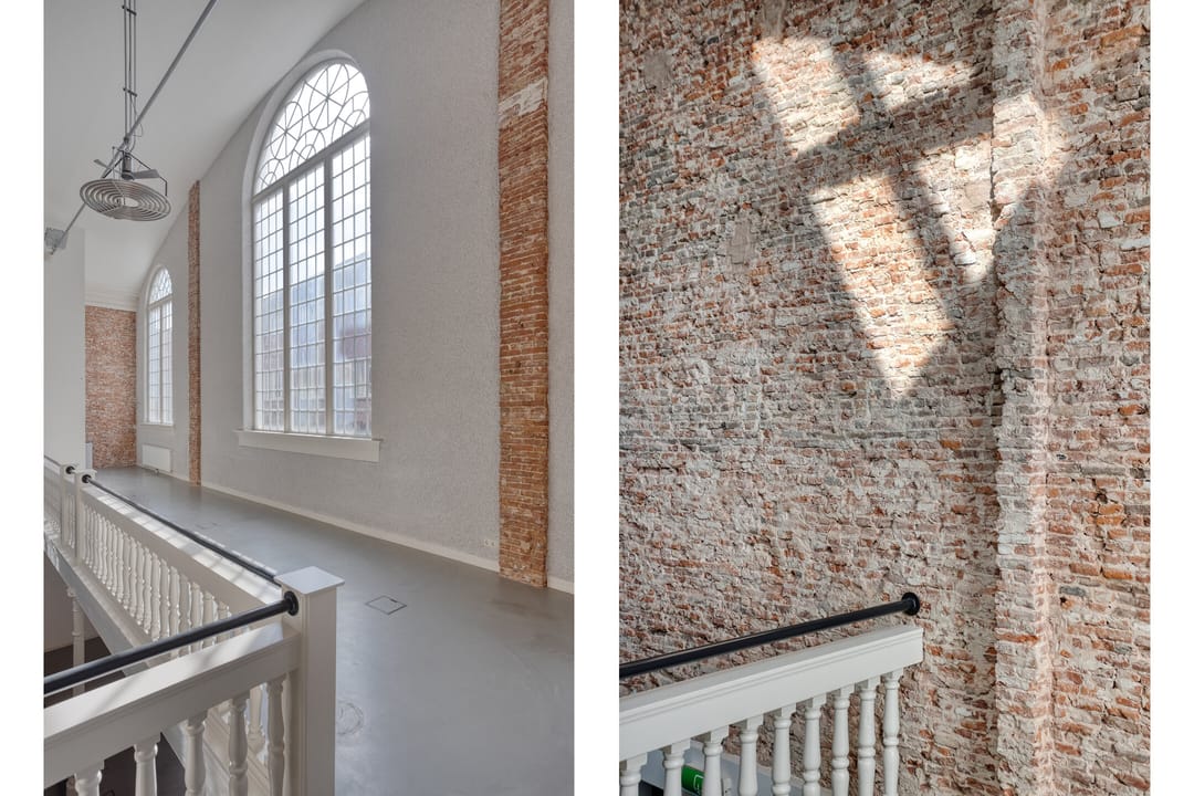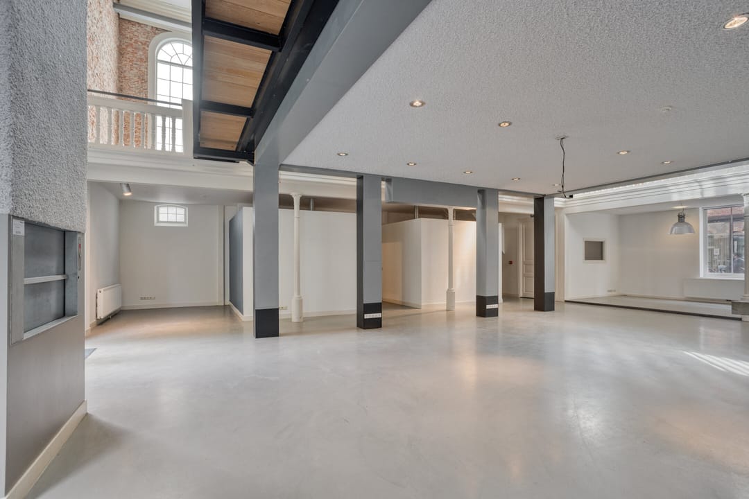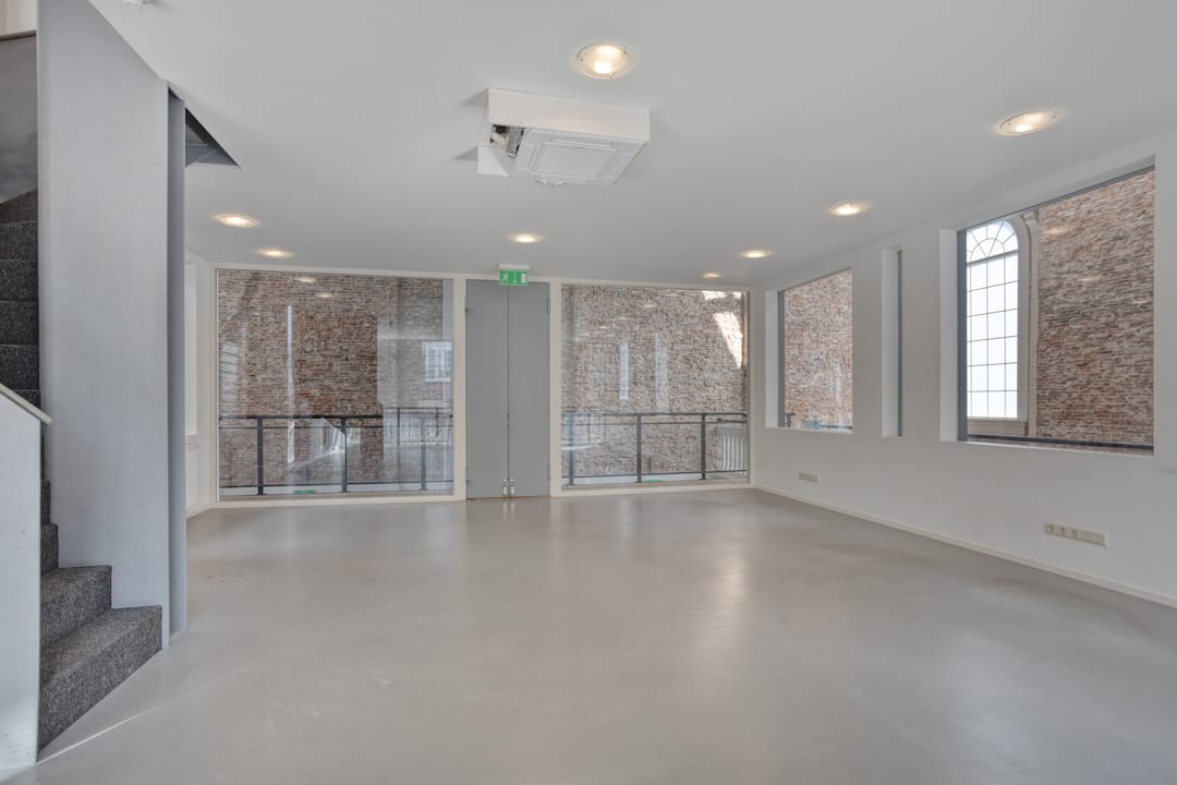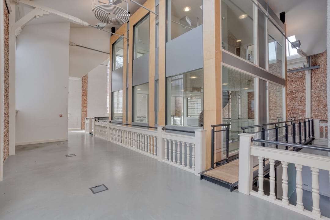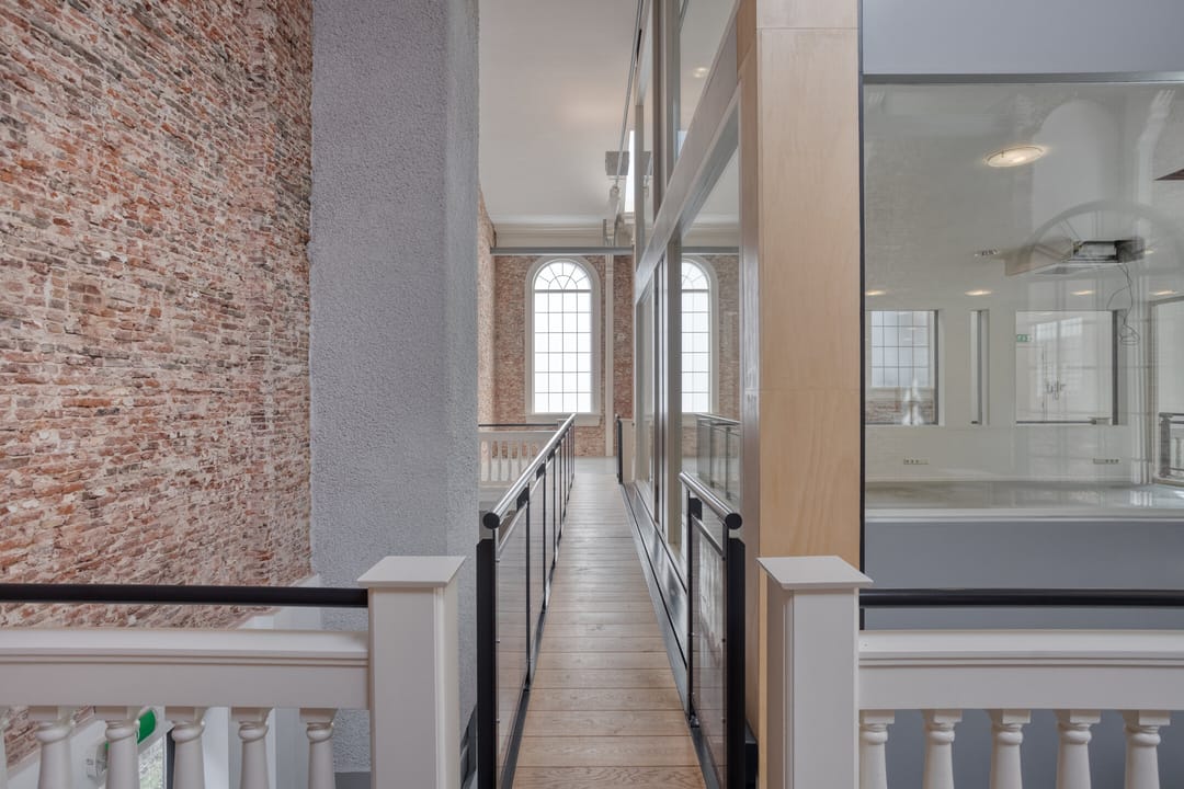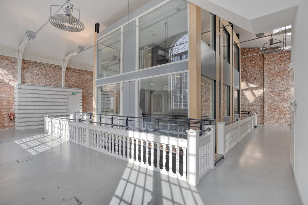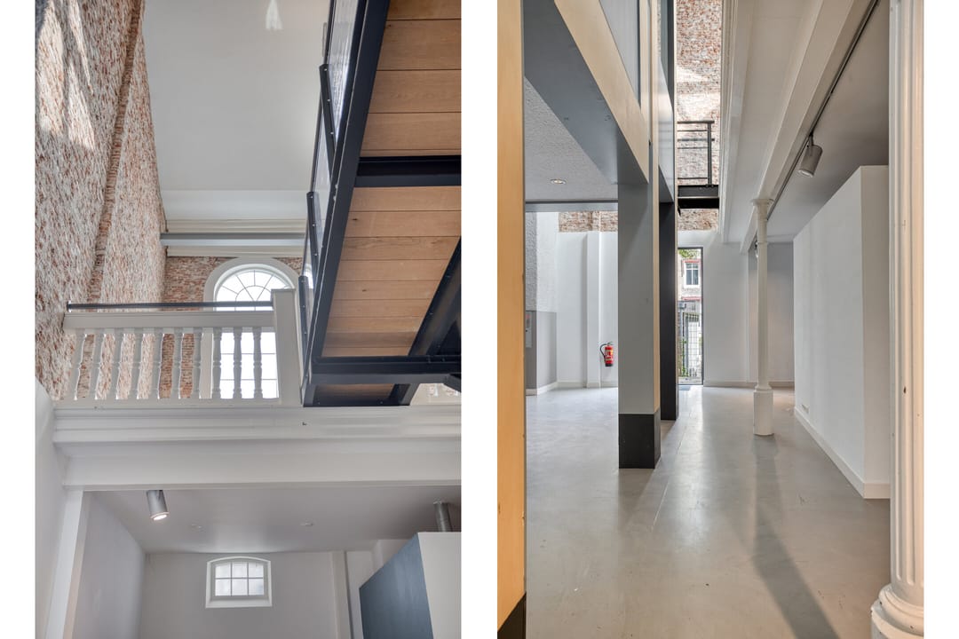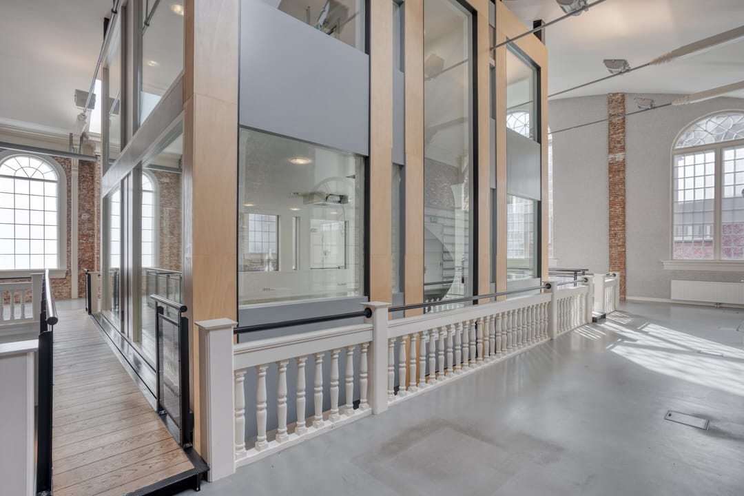 Aan beide zijden van het pand bevindt zich een trap naar de eerste verdieping, waar je uitkomt op een ruime balustrade. In het hart van het gebouw, vanaf de eerste verdieping, bevindt zich een zwevende kantoorunit met ruimte voor drie afzonderlijke vergader- of kantoorruimtes. De grote, hoge ramen zorgen voor een prachtige lichtinval en benadrukken het ruimtelijke monumentale gevoel van het pand. De inrichting combineert industriële materialen zoals staal, beton, glas en ruwmetselwerk voor een moderne en rustieke uitstraling. Er is tevens geïnvesteerd in onder andere 50 zonnepanelen, muurisolatie en een hybride warmtepomp. Hierdoor is het pand niet alleen energiezuinig, maar ook geschikt gemaakt voor veelzijdig en toekomstgericht gebruik.