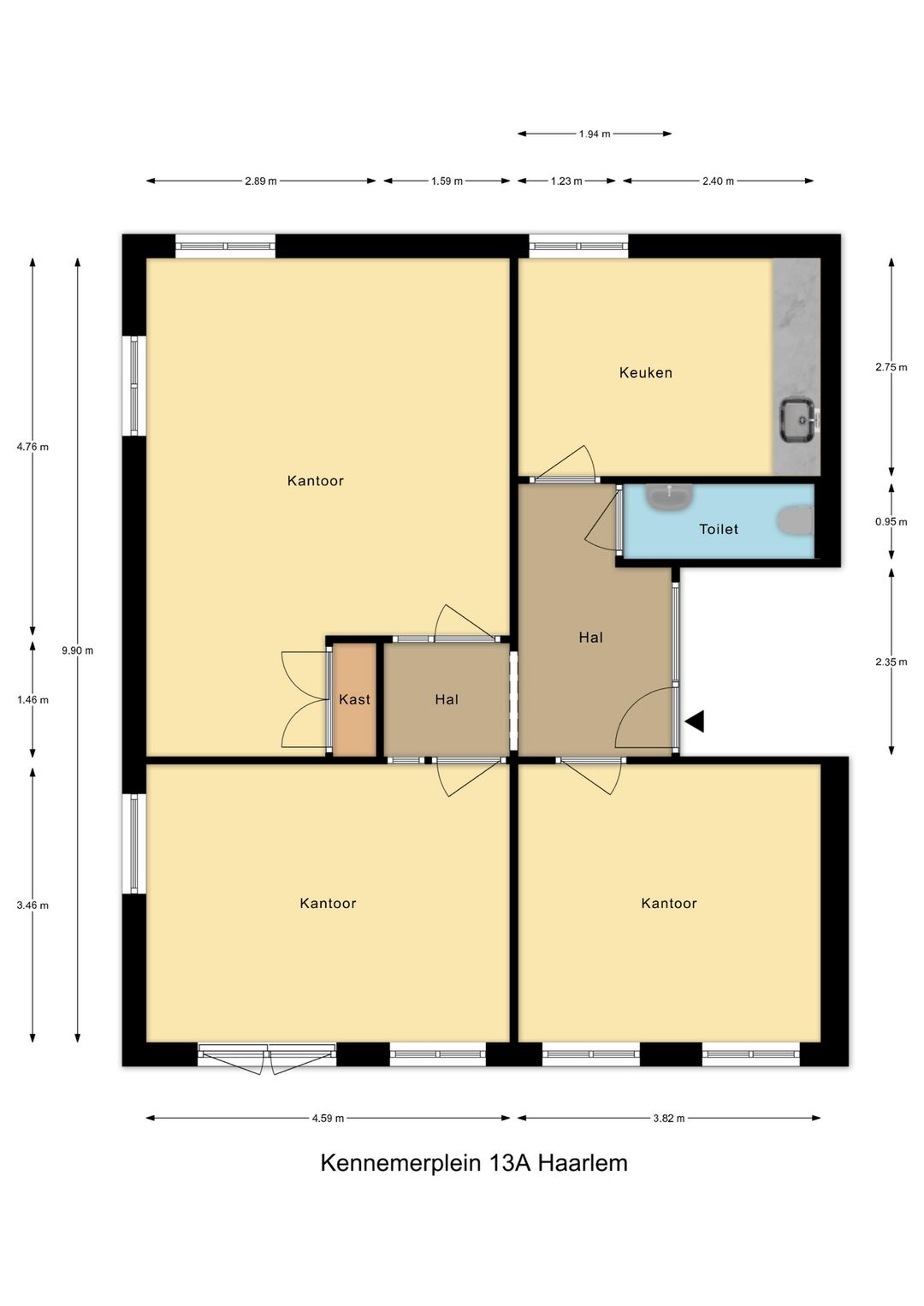 De kantoorruimte is verdeeld over de eerste en tweede verdieping en is bereikbaar via een vaste trap. Dankzij de grote raampartijen geniet u van een uitzicht over het kennemerplein, waar altijd wel wat te zien is. Op de bovenste verdieping bevinden zich twee kantoorruimtes met een eigen pantry en een gedeelde toiletruimte. De kantoorruimte op de eerste verdieping heeft een eigen keuken en toiletruimte. De kantoorruimtes zijn flexibel in te delen en zowel in zijn geheel als in aparte kantoren te huur, waardoor het geschikt is voor diverse typen organisaties.