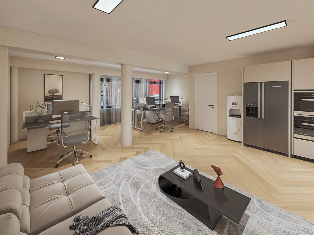 - Topkoeling, inbouwarmaturen, liften, te openen ramen, kabelgoten, systeemplafond, toilet, pantry, verwarming en kamerindeling