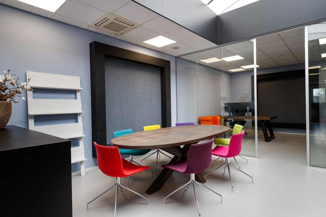 • grote vergadertafel met design stoelen;
