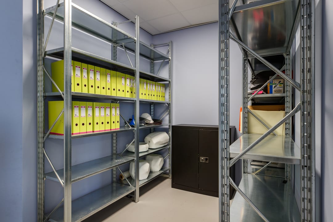 • opslagruimtes met stellingen en voorraad