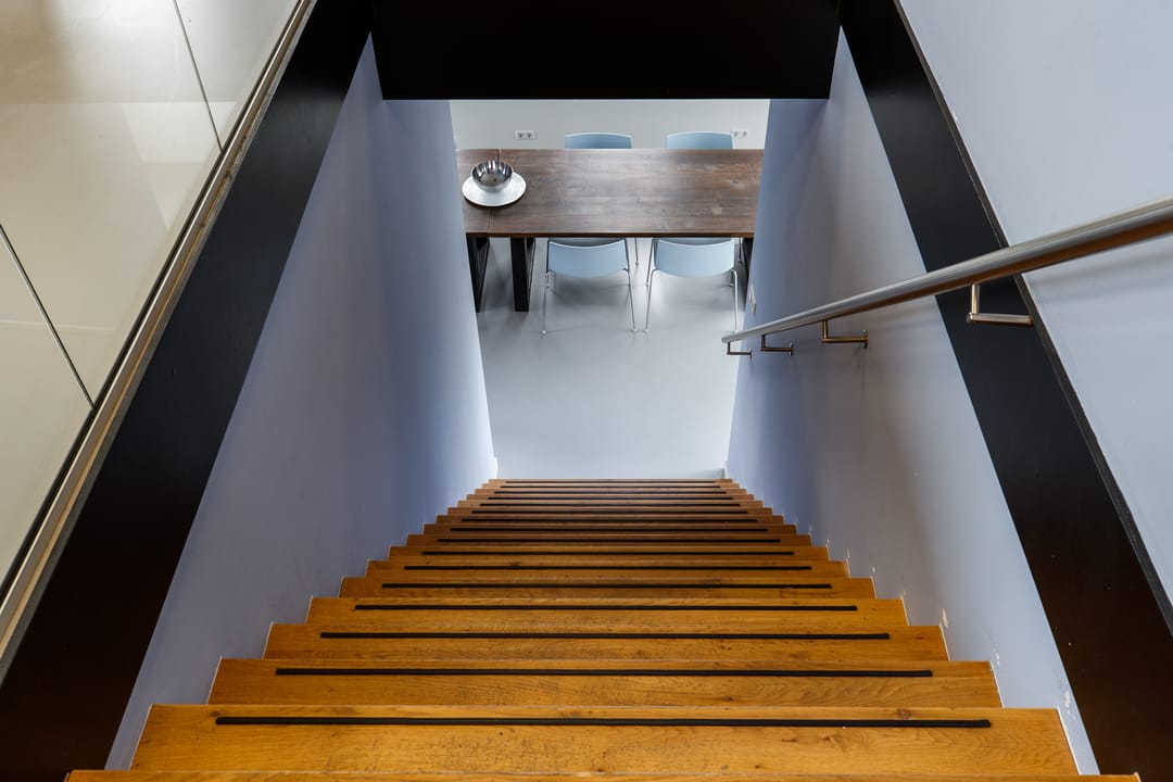 Op de begane grond bevindt zich een centrale ruimte, thans ingericht als ontvangst c.q. lunchruimte. Een aparte deur leidt naar een garderobe met een dames en herentoilet. Via een brede eiken trap komt u op de ‘kantoor’ verdieping met gietvloer en prachtige glazen wanden.