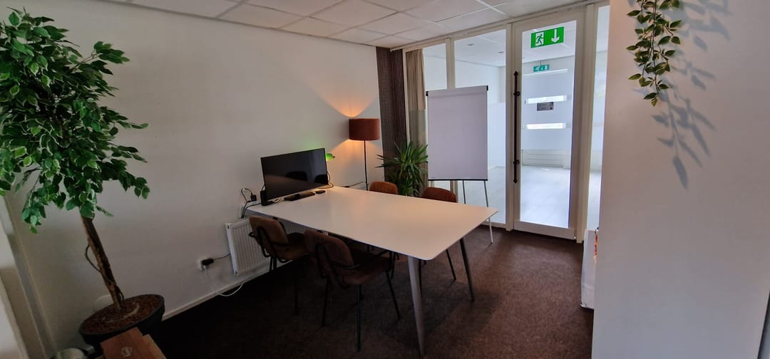 - spreekkamer van 12 m² voorzien van vergadertafel met 4 stoelen en flipover en whiteboard.