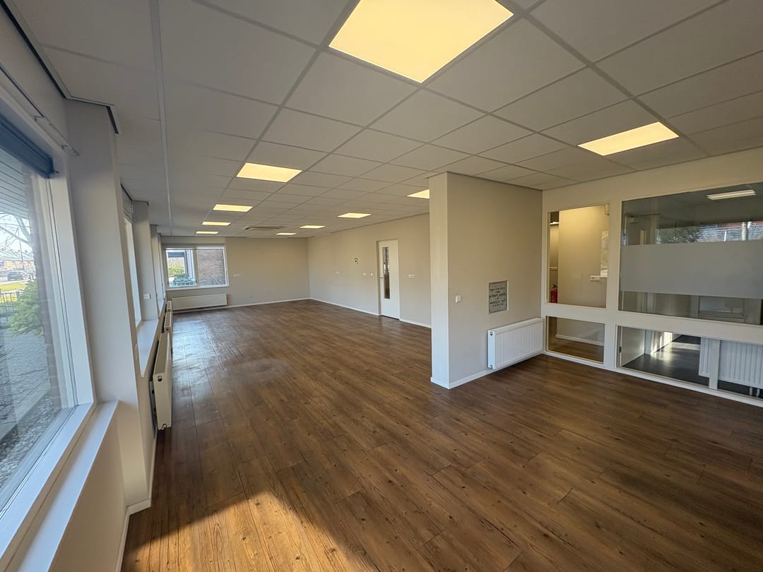 Het betreft de volledige begane grond, welke een lichte uitstraling heeft door de nette vloerafwerking en vele raampartijen rondom. De begane grond beschikt over een representatieve entree, 3 kantoorruimtes, een opslag-/archiefruimte, hal, pantry en modern toilet.