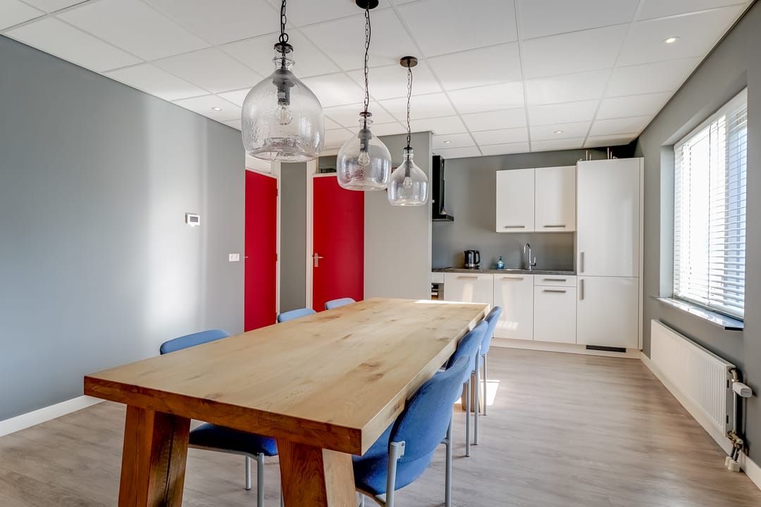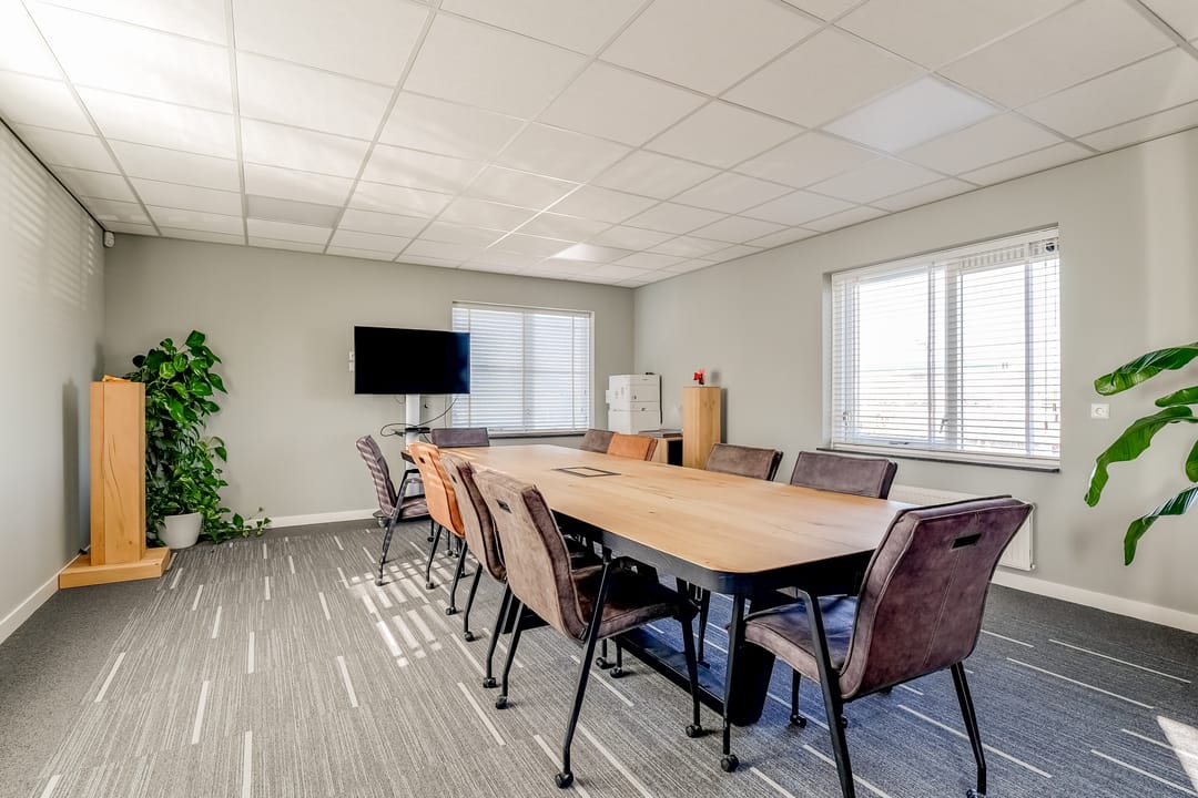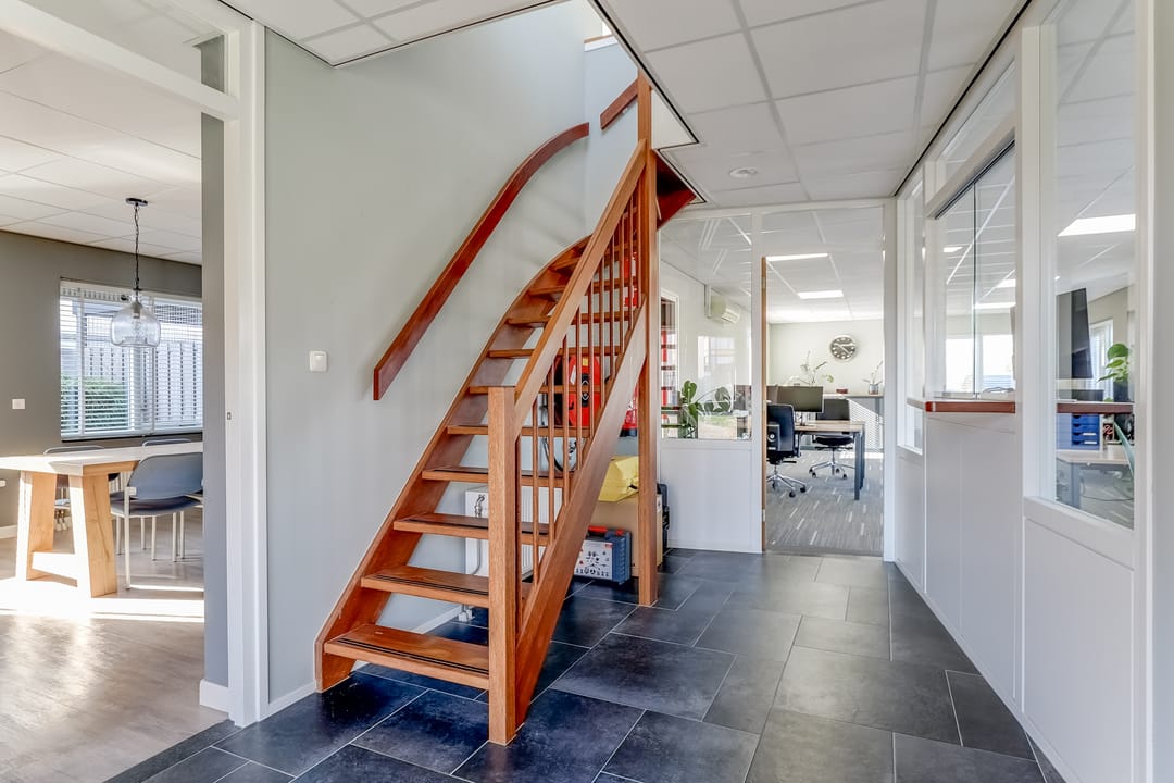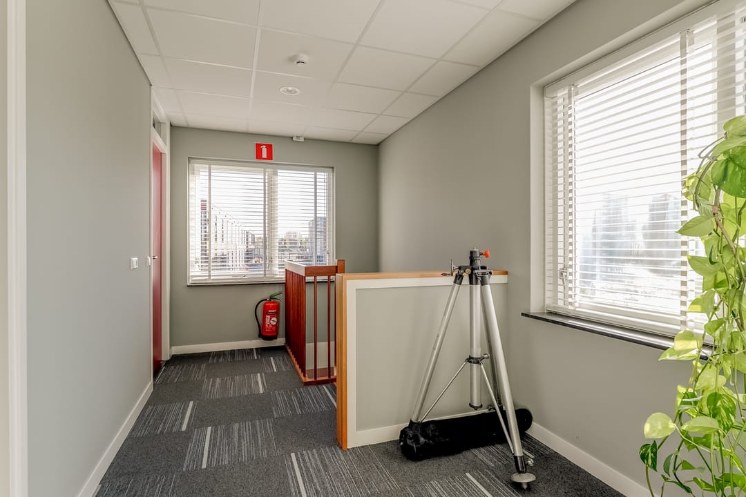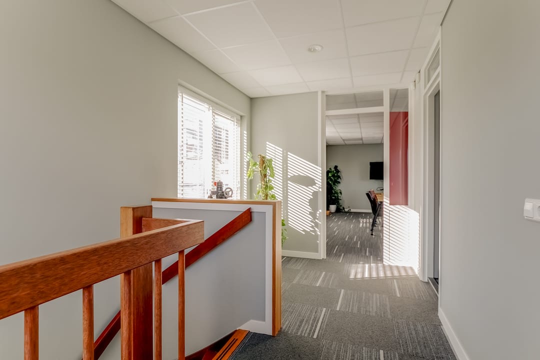 Via de vaste trap bereik je de overloop op de verdieping met toegang tot een kantoorruimte/vergaderruimte, badkamer en technische ruimte. Ook deze verdieping is verzorg en turnkey ingericht. De badkamer is voorzien van een douche, wastafel en toilet.