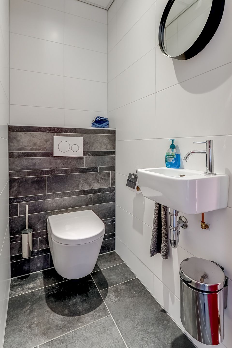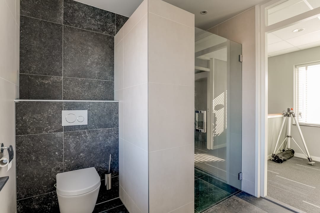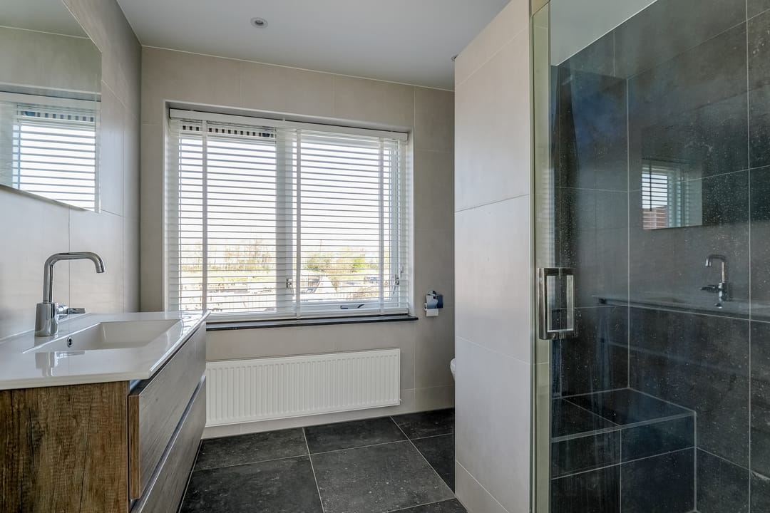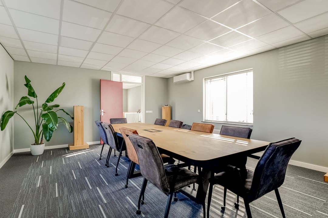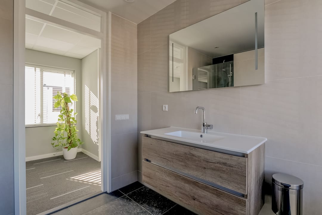 Via de vaste trap bereik je de overloop op de verdieping met toegang tot een kantoorruimte/vergaderruimte, badkamer en technische ruimte. Ook deze verdieping is verzorg en turnkey ingericht. De badkamer is voorzien van een douche, wastafel en toilet.