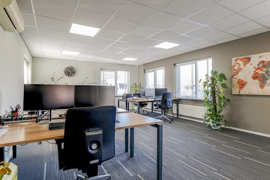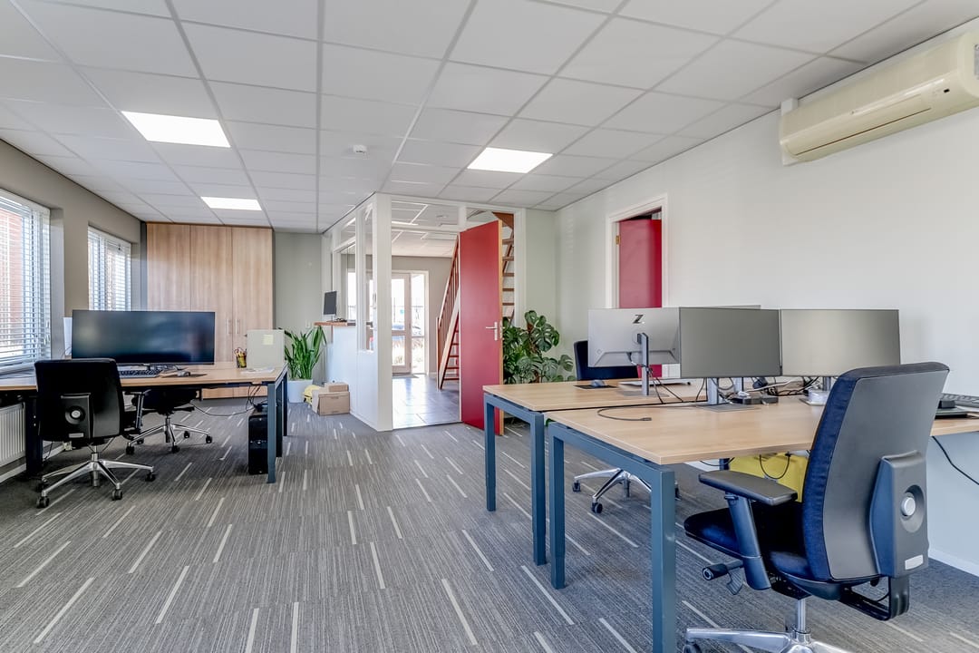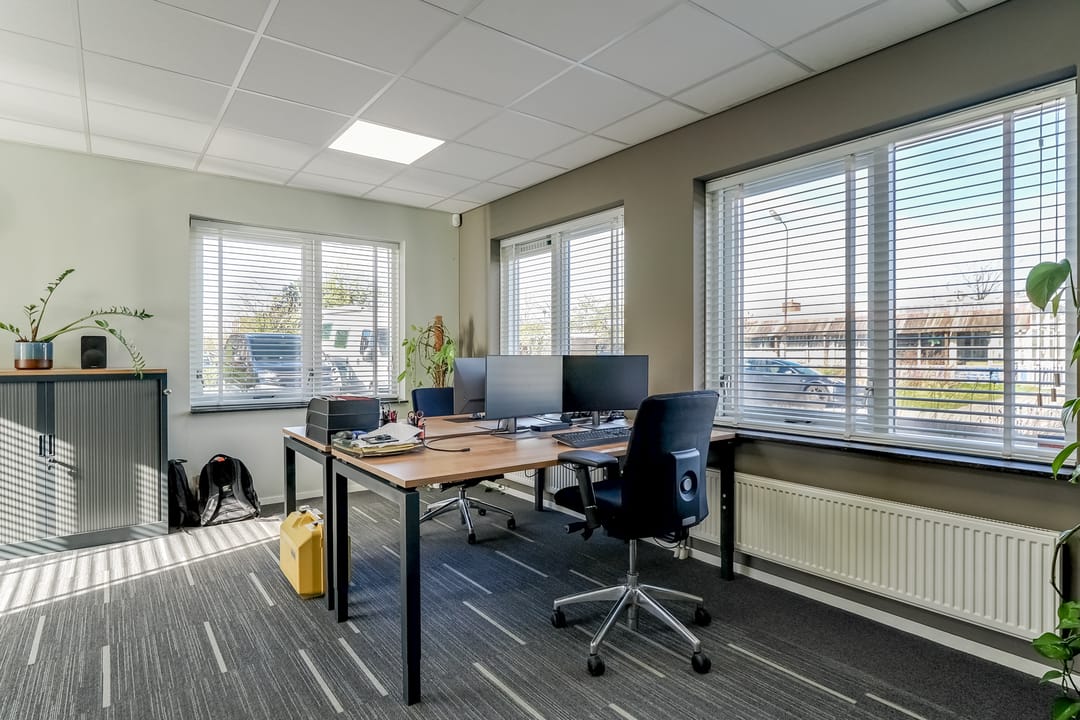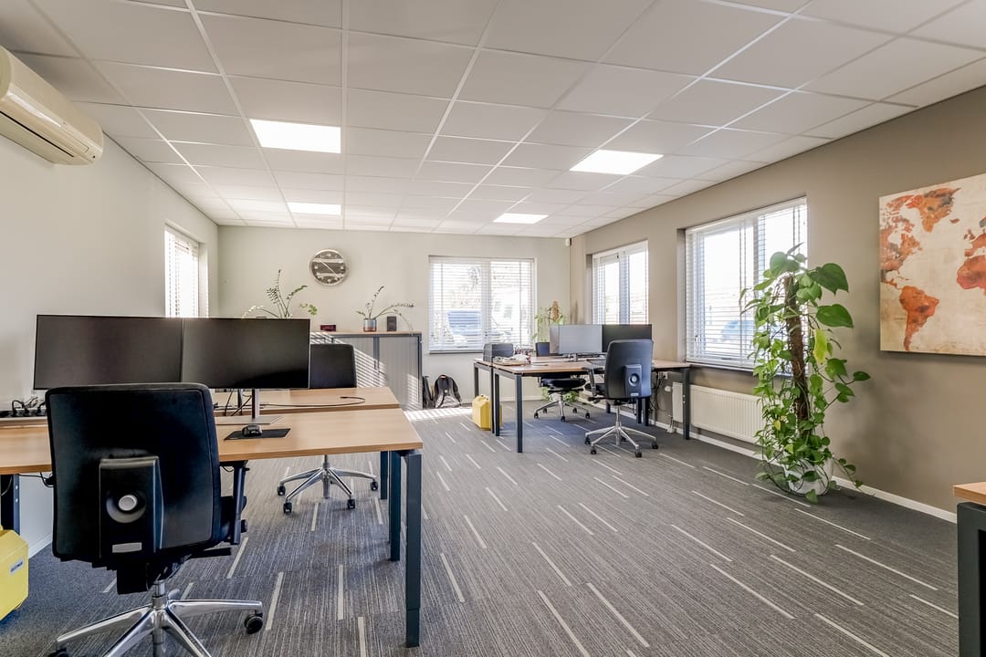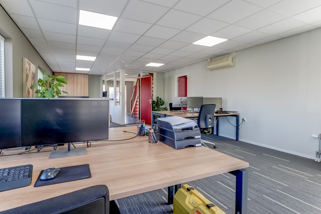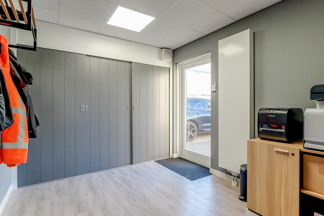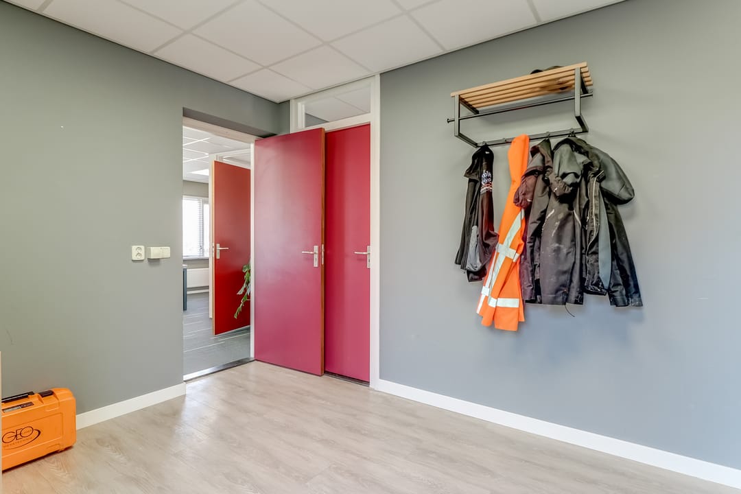 Entree/hal met meterkast, verzorgd dames en heren toilet, trapopgang naar de eerste verdieping en toegang tot kantine en kantoren. De kantoorruimten zijn allen voorzien van een turnkey indeling en o.a. systeemplafond met ledverlichting, verwarming middels radiatoren, een airco etc. De kantine is voorzien van een keuken met koel-/vriescombinatie, combioven, kookplaat met afzuigkap en vaatwasser. Zowel de kantoorruimte en kantine zijn ook bereikbaar via de werkruimte met achter entree.