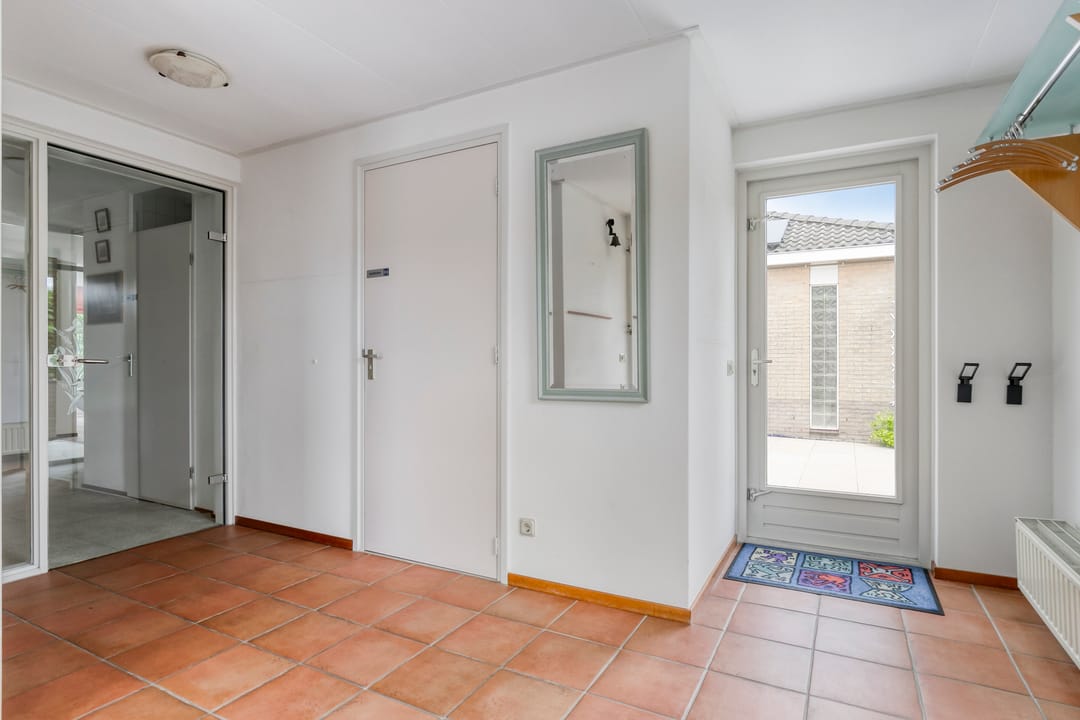 U betreedt de woning via de hal met plavuizen vloer en een loopdeur naar de zijtuin. Vanuit hier heeft u toegang tot een kantoor-/slaapkamer, een volledig betegelde toiletruimte met urinoir, hangend closet en een wastafel.
