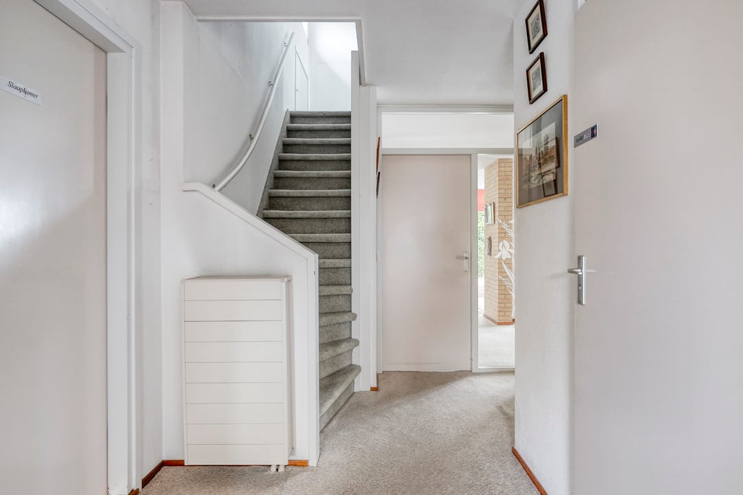 De centrale hal met tapijt en trapopgang leidt naar de woonkamer, een tweede toiletruimte (volledig betegeld, met fonteintje en staand closet) en de technische kast met de opstelling van de cv-ketel (Nefit 2017).