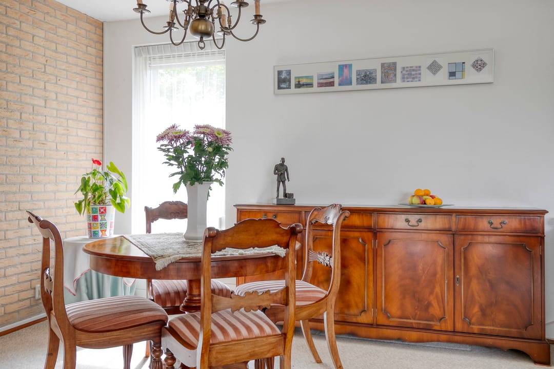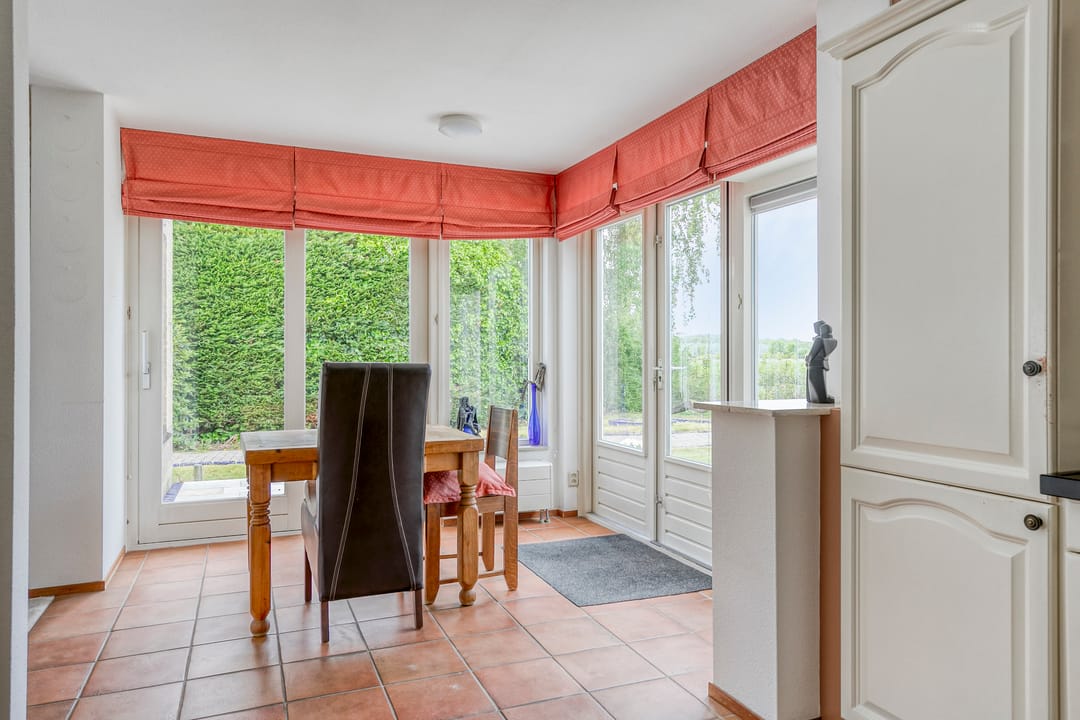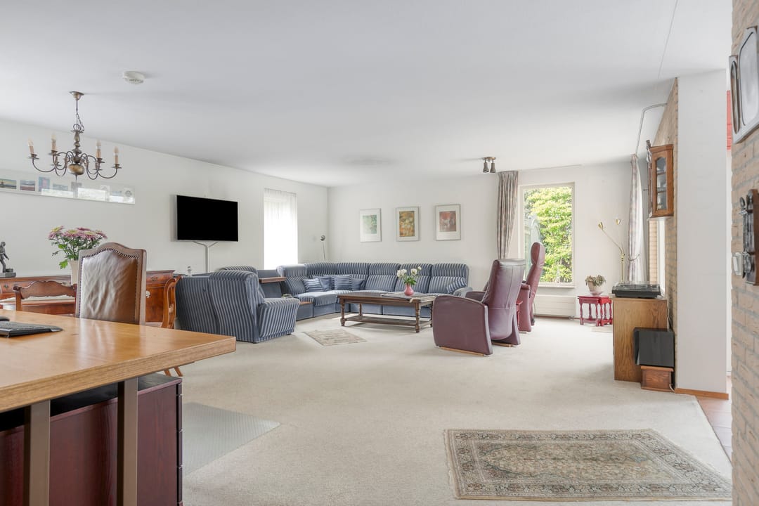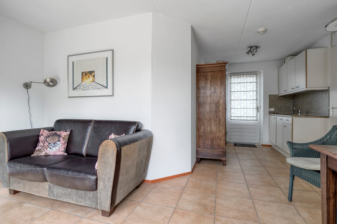 De woonkamer met open keuken is royaal van opzet en beschikt over een trapkast, dubbele openslaande deuren naar de tuin en een schuifpui voor toegang tot het terras. De keuken in L-opstelling is voorzien van een koel-/vriescombinatie, keramische kookplaat, oven, vaatwasser, rvs spoelbak en composiet werkblad.