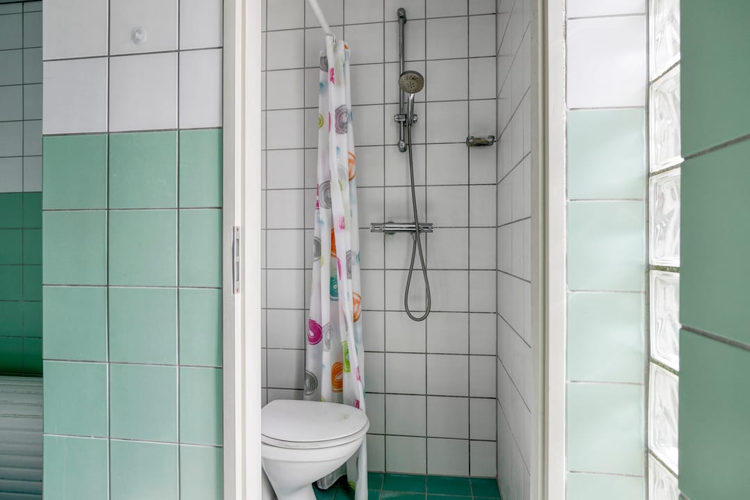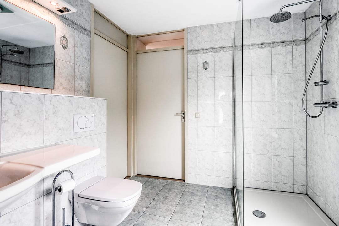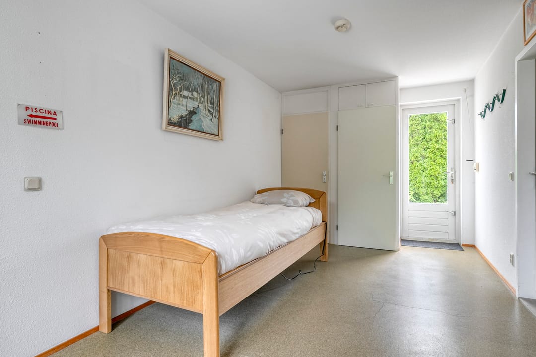 Via een tussenhal bereikt u de badkamer en een ruimte die geschikt zou kunnen zijn als slaapkamer of werkkamer. In twee vaste kasten bevindt zich de opstelling van de warmtepomp en een tweede cv-ketel. Tevens is hier een deur naar buiten en toegang naar het binnenzwembad. De badkamer is volledig betegeld en voorzien van een inloopdouche, wastafelmeubel, aansluiting voor wasmachine en droger, mechanische ventilatie en dubbele plaatradiator met convector.