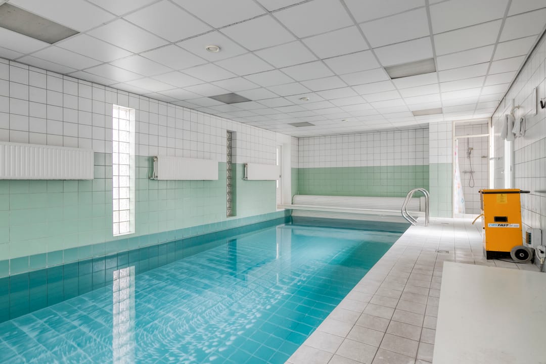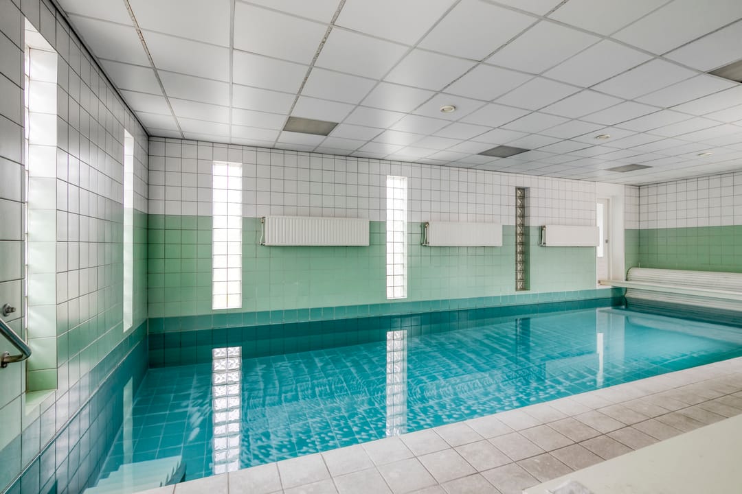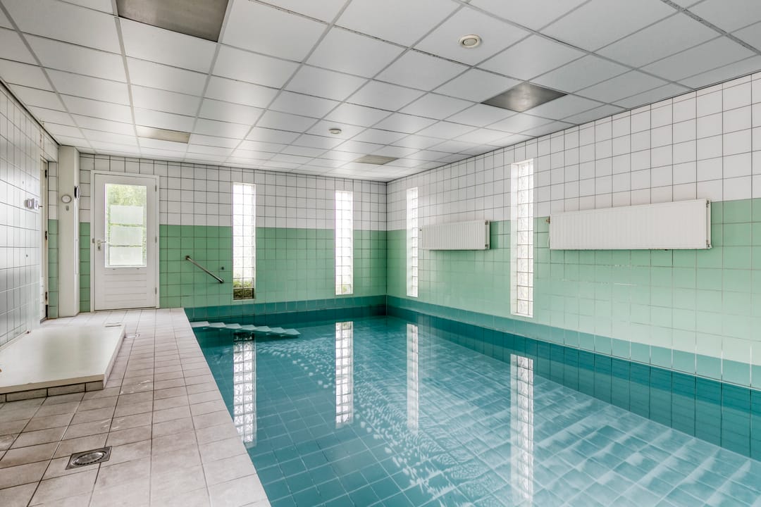 Een van de unieke kenmerken van deze woning is het verwarmde binnenzwembad, bereikbaar vanuit binnen en buiten. De ruimte is volledig betegeld, heeft glazen bouwstenen ramen en diverse ventilatiepunten. Er is een aparte doucheruimte met hoekdouche en staand closet. Tevens bevindt er zich een kelderruimte met opstelling van de pomp apparatuur t.b.v. het zwembad.