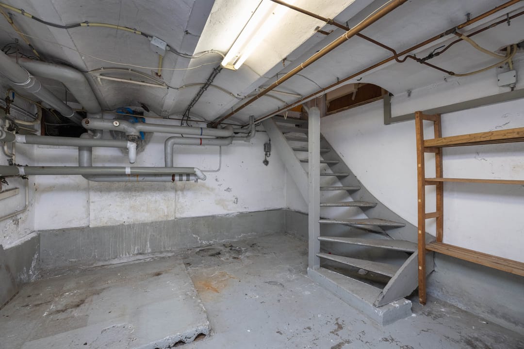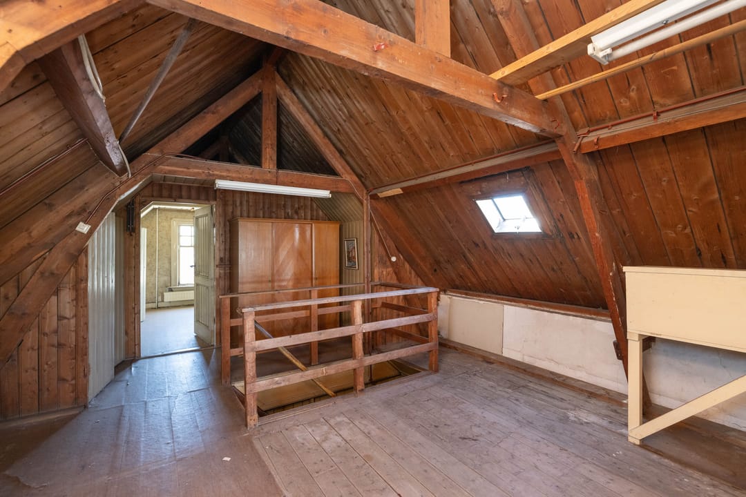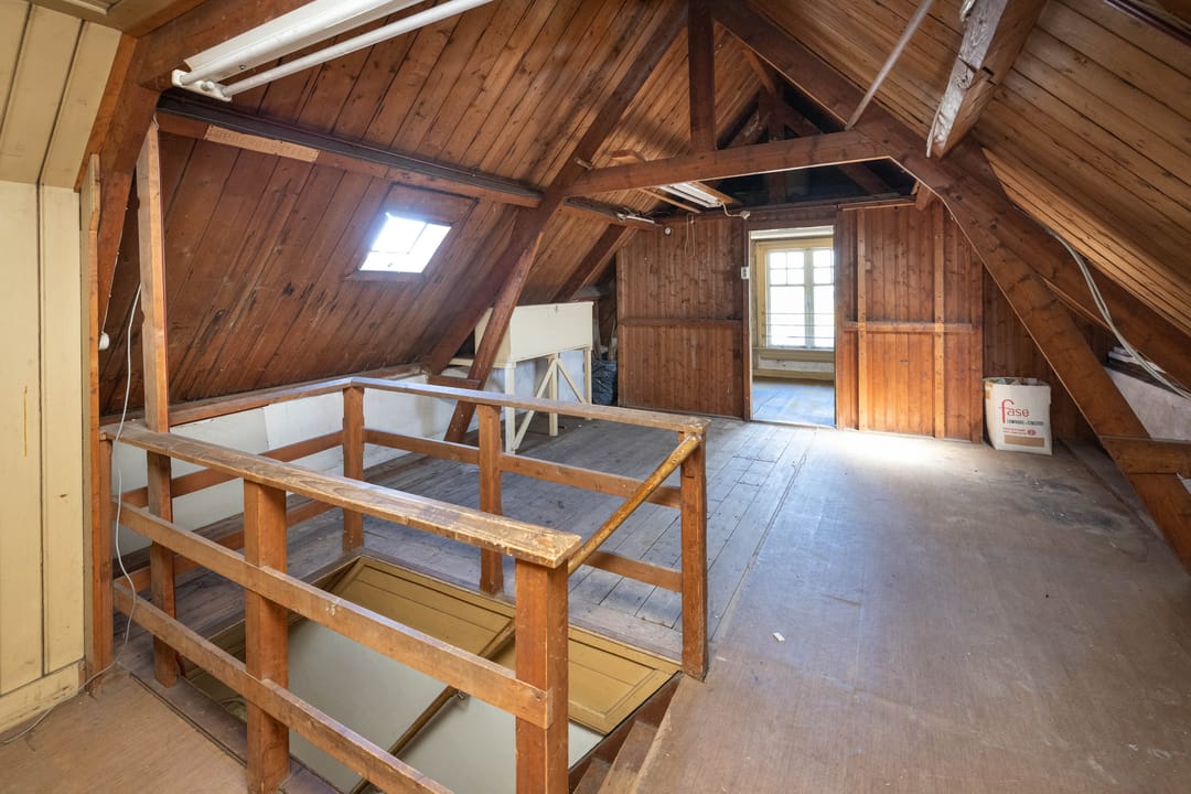 Een vaste trap geeft toegang tot een grote bergzolder met de mogelijkheid voor twee extra slaapkamers en bergruimte.