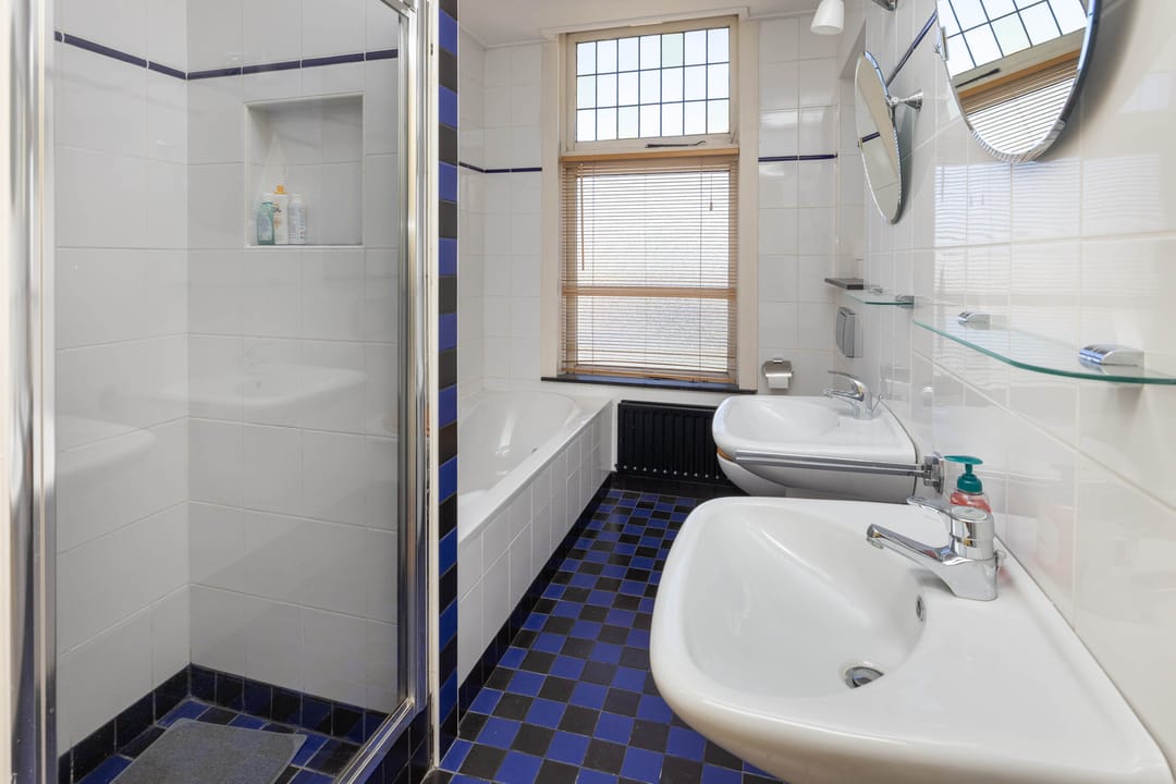 Overloop, twee slaapkamers, waarvan een met vaste kasten en klein balkon, badkamer met ligbad, douche, toilet en dubbele wastafel.