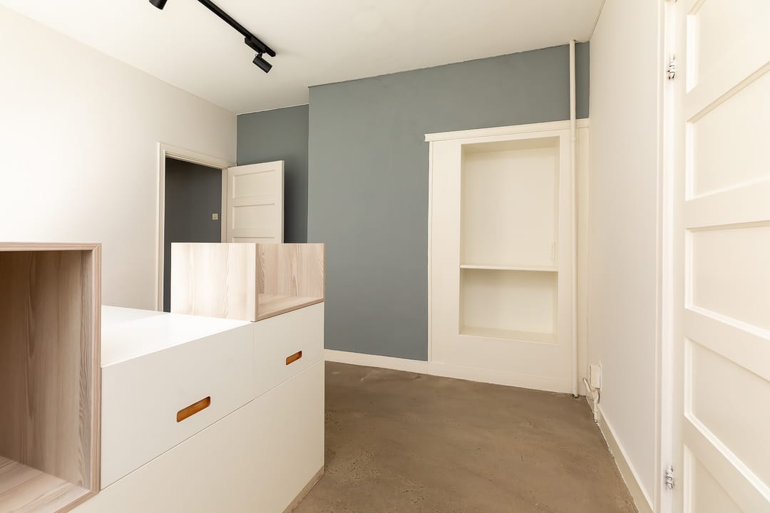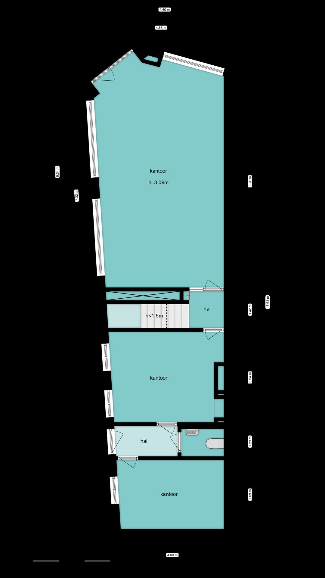 Aangrenzend bevindt zich een klein halletje met toegang tot de trap naar het souterrain, een tweede kantoorruimte, aaneensluitend een halletje met een ruim toilet voorzien van een wastafel met fontein en nog een derde kantoorruimte. De indeling maakt deze verdieping zeer geschikt voor open werkplekken, ontvangstruimtes of gescheiden kantoorfuncties.