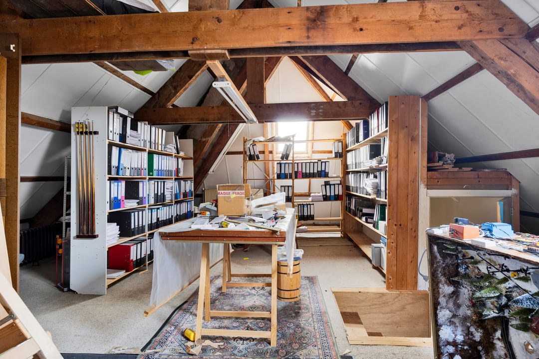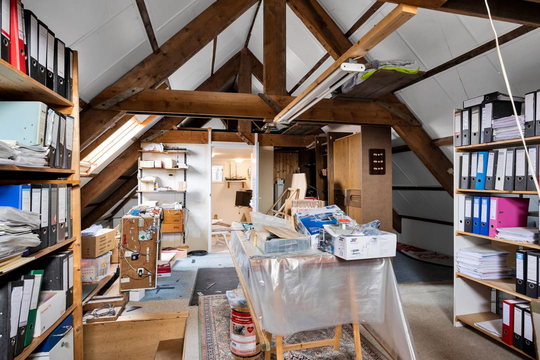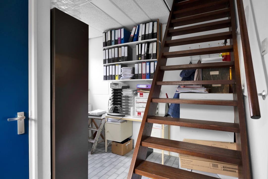 Pantry (bijna 13 m²) met toilet, bergruimte en vaste trap naar de 1e verdieping.