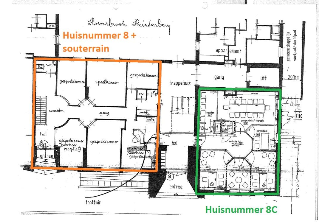 Huisnummer 8 is circa. 190 m² groot en bestaat uit zes spreekkamers op de begane grond variërend in oppervlakte. Daarnaast heeft het een multifunctionele ruimte (circa 60 m²) in het souterrain. Huisnummer 8C meet circa 63 m² en beschikt over een wachtruimte en vijf spreekkamers op de begane grond.