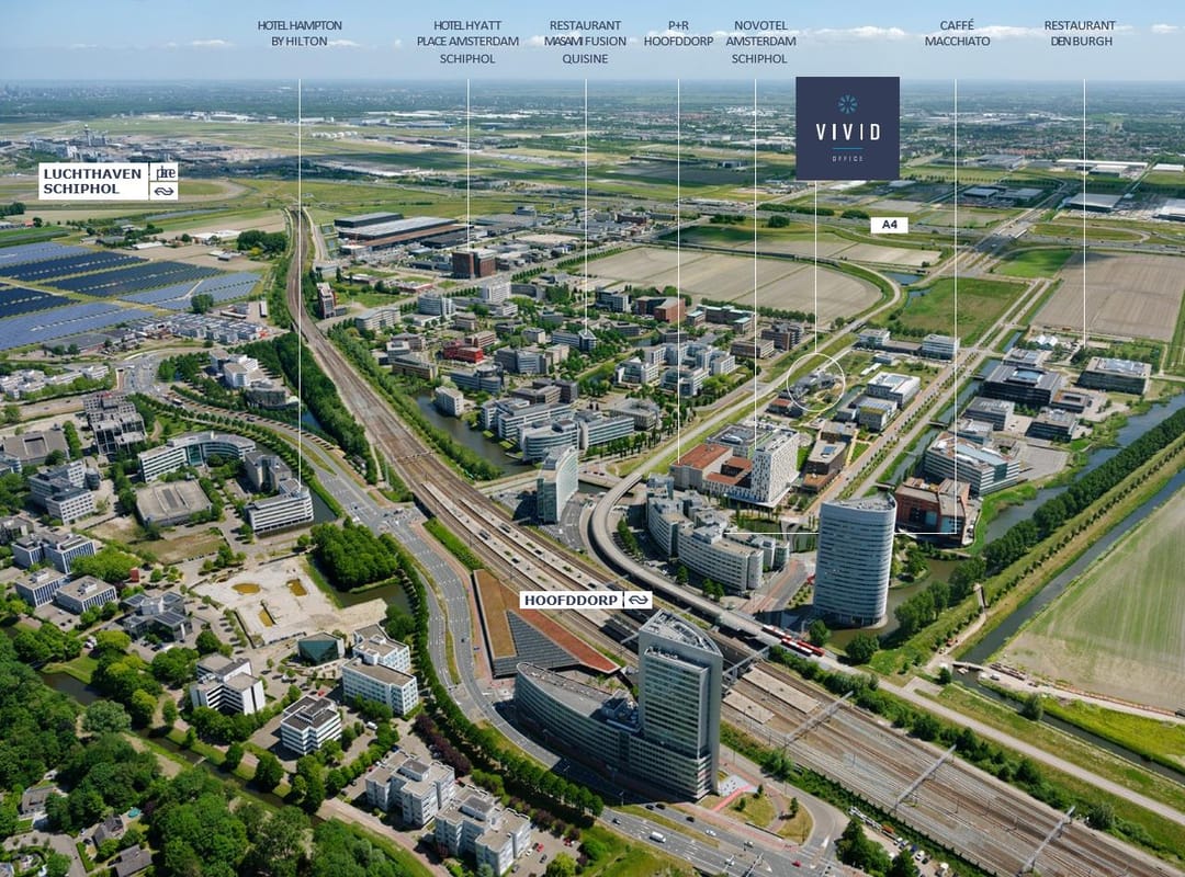 VIVID is uitstekend bereikbaar met zowel de auto als het openbaar vervoer. Het pand ligt direct aan de N201 en is via de A4 en A5 eenvoudig te bereiken vanuit Amsterdam, Haarlem, Leiden en luchthaven Schiphol, ideaal voor nationale en internationale bezoekers. Dankzij de nabijheid van diverse buslijnen is er een goede verbinding met het NS-station Hoofddorp, dat op korte afstand ligt en frequente treinverbindingen biedt richting onder andere Amsterdam, Rotterdam en Den Haag. Voor fietsers zijn er goed aangelegde routes in de regio, waardoor ook woon-werkverkeer per fiets comfortabel en snel verloopt. Kortom: Scorpius 171 combineert een centrale ligging met uitstekende infrastructuur voor alle vormen van vervoer.