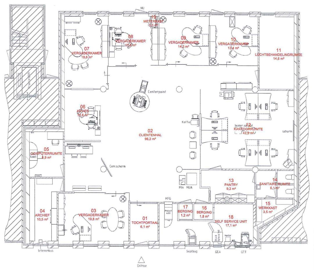 Entree met tochtportaal (v.v. automatische deur), ruimte centrale hal met daaromheen gesitueerd diverse kantoren, vergaderruimten en spreekkamers, keuken, toiletgroep, archief- en technische ruimten. Her geheel beschikt over een eigen achteringang welke toegang geeft tot het afgesloten parkeerterrein met 4 eigen parkeerplaatsen.