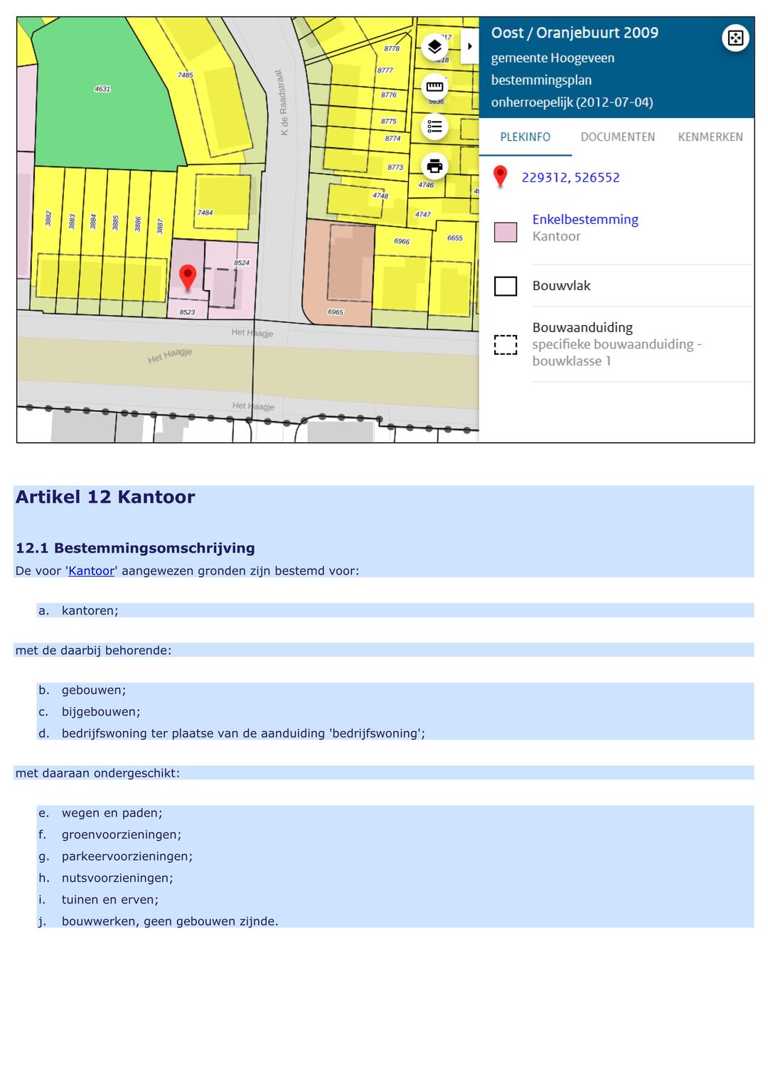 De bestemming is ‘Kantoor’. Als definitie hiervan wordt in de bestemmingsregels aangegeven ‘een gebouw waarvan ten minste 80 % van de vloeroppervlakte wordt gebruikt voor administratieve activiteiten, inclusief daaraan gerelateerde activiteiten, zoals kantine en sanitair’.