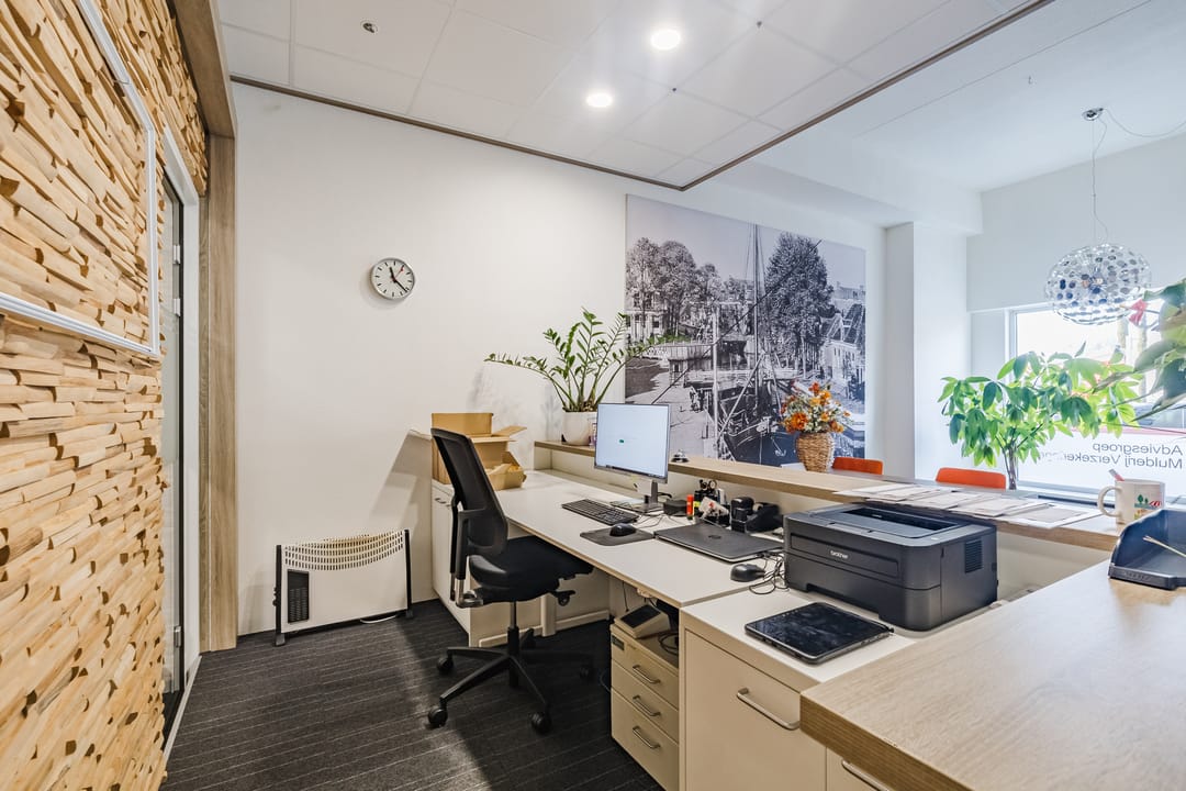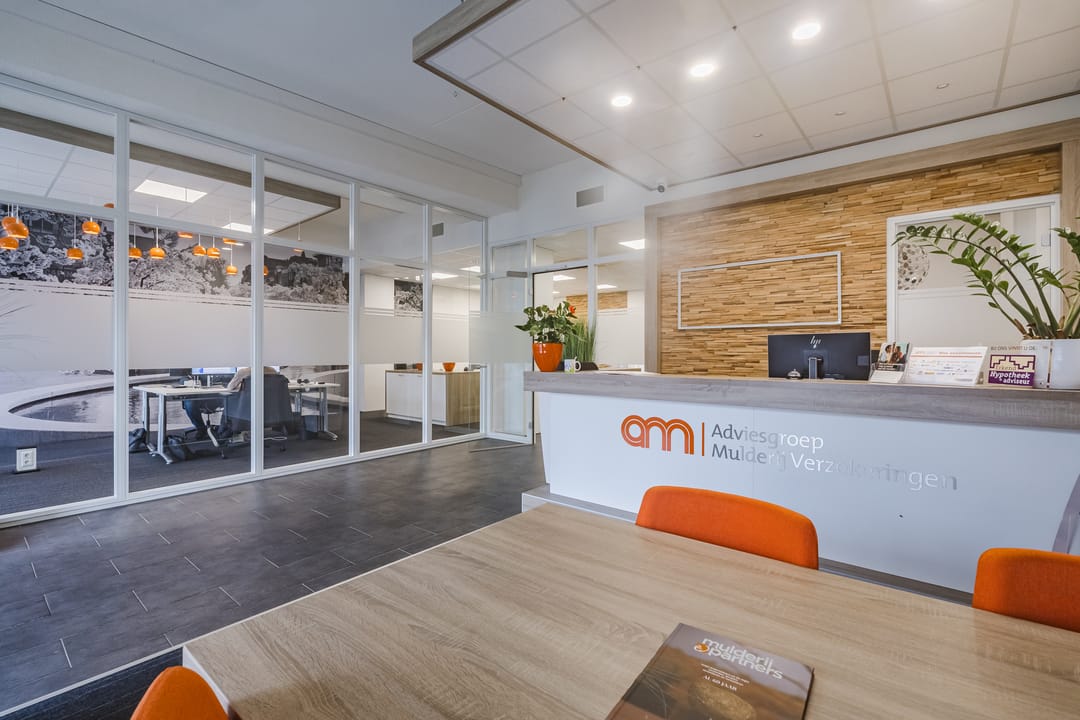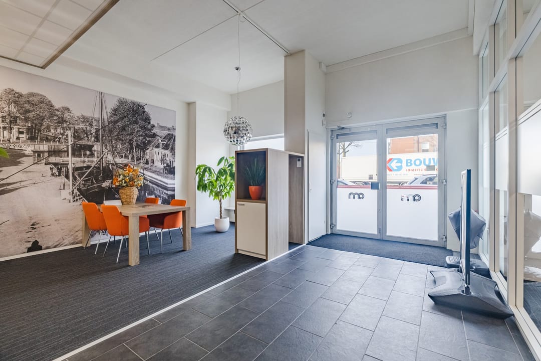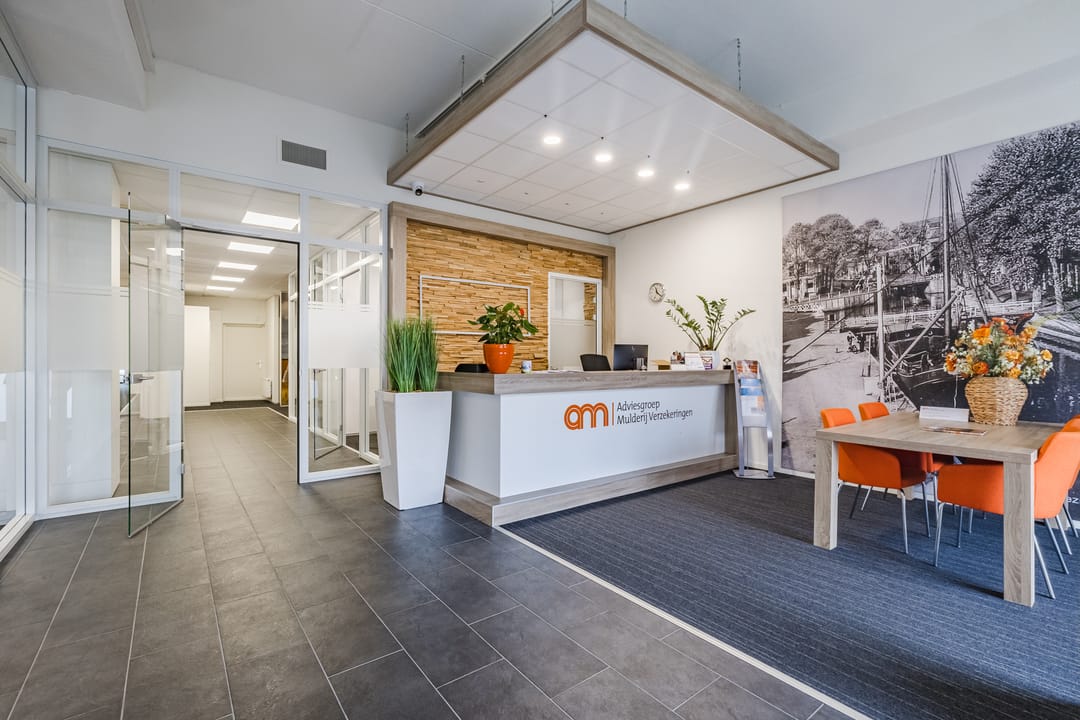 Het pand is ingericht als kantoorruimte met een receptie, open werkruimte, spreekkamers, toilet en open keuken