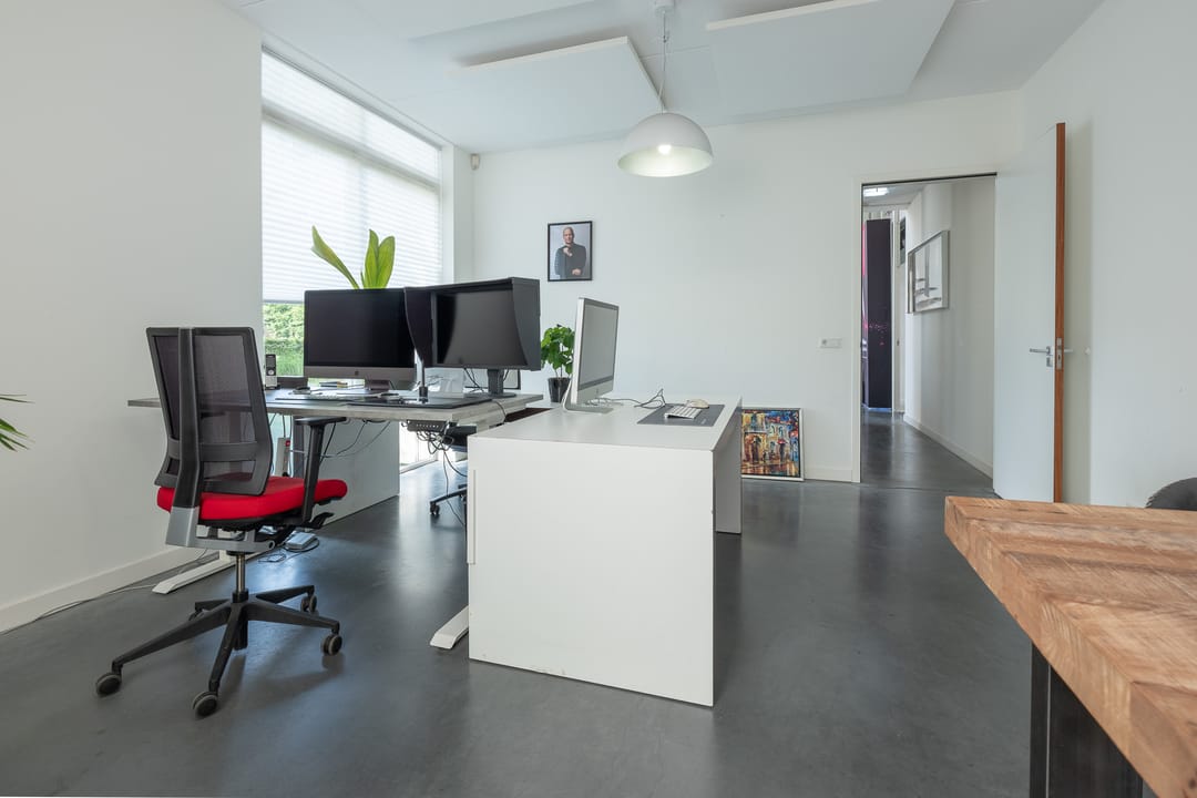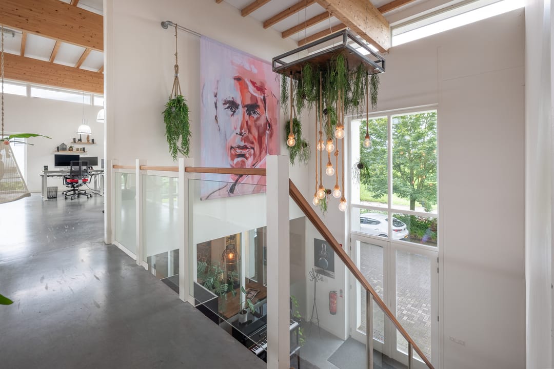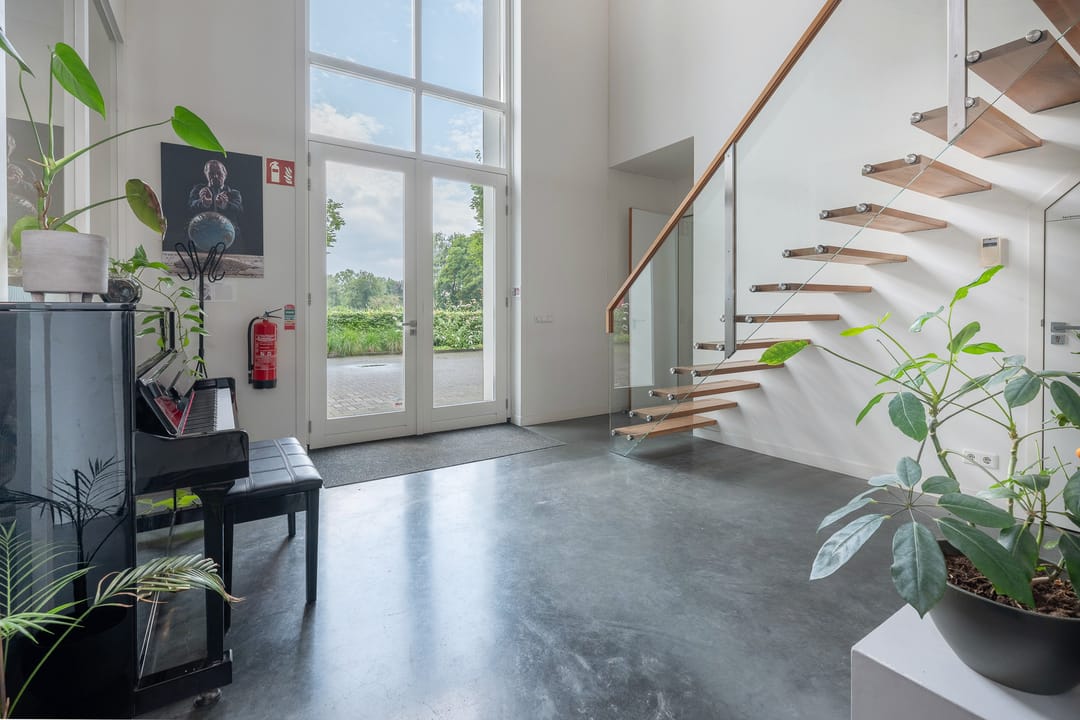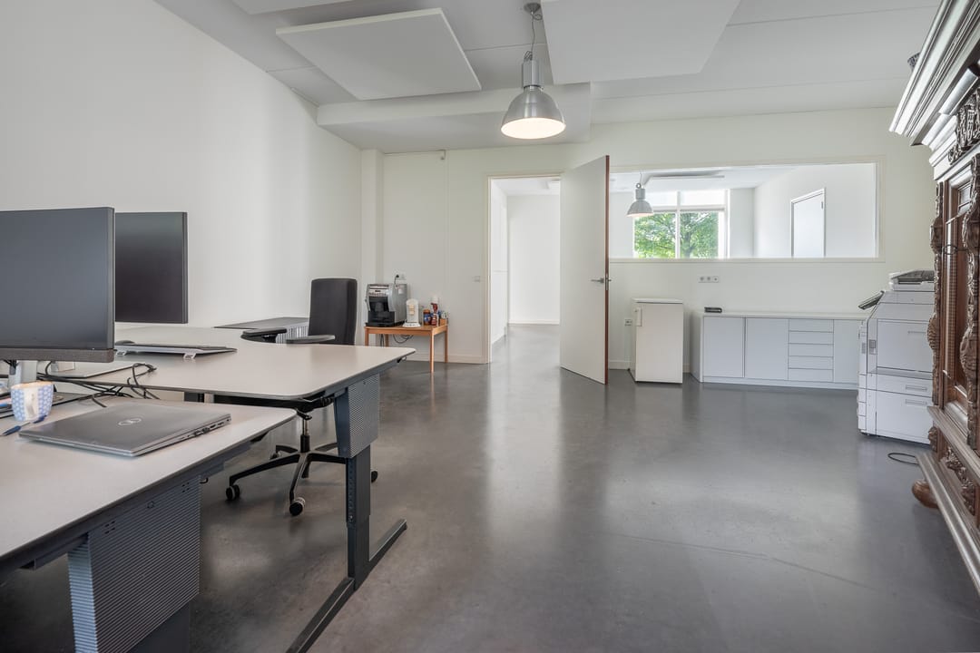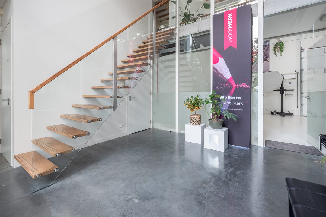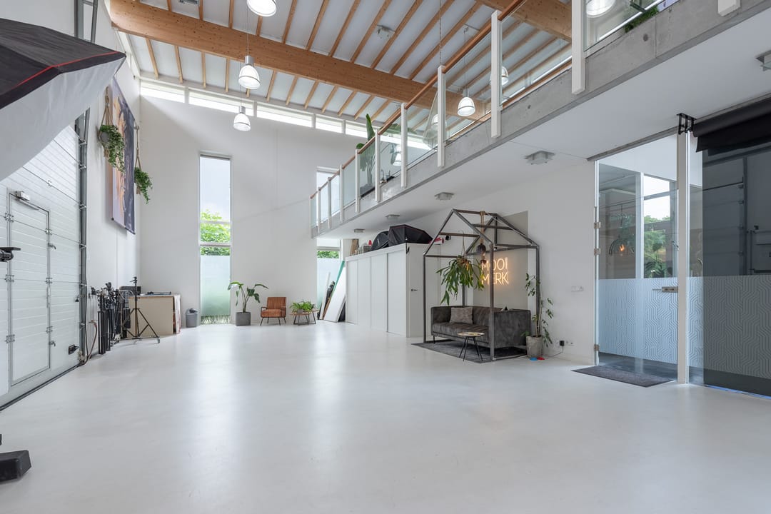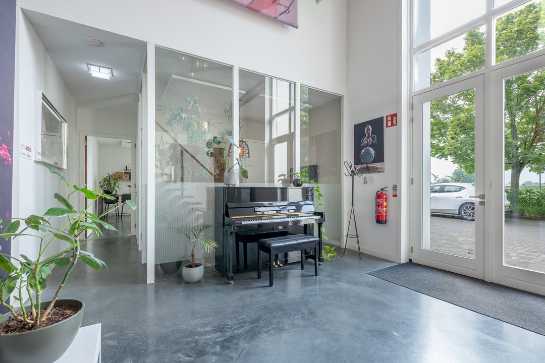 Royale hoofdentree met toegang tot een toilet, technische ruimte en een kantoor- en spreekkamer. Via de hoofdentree is er tevens toegang tot de bedrijfsruimte. Middels een fraaie trapopgang bereikt u de 1e verdieping. Deze verdieping beschikt over een zeer ruime kantoor-/studioruimte, een toilet, een spreekkamer en een ruime kantine. Daarnaast is er een fantastische daglichttoetreding door de grote raampartijen.