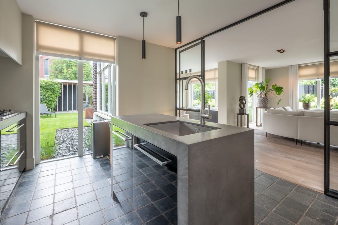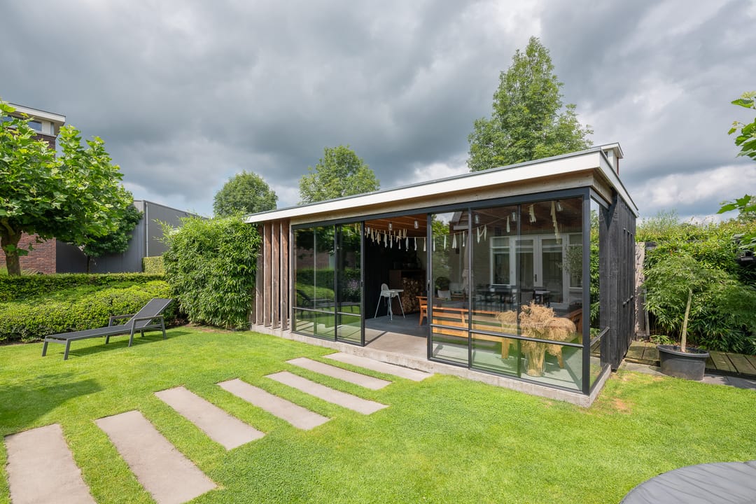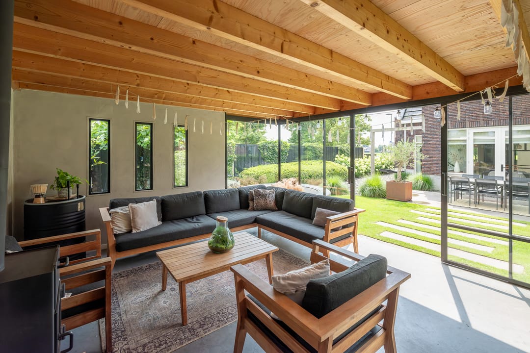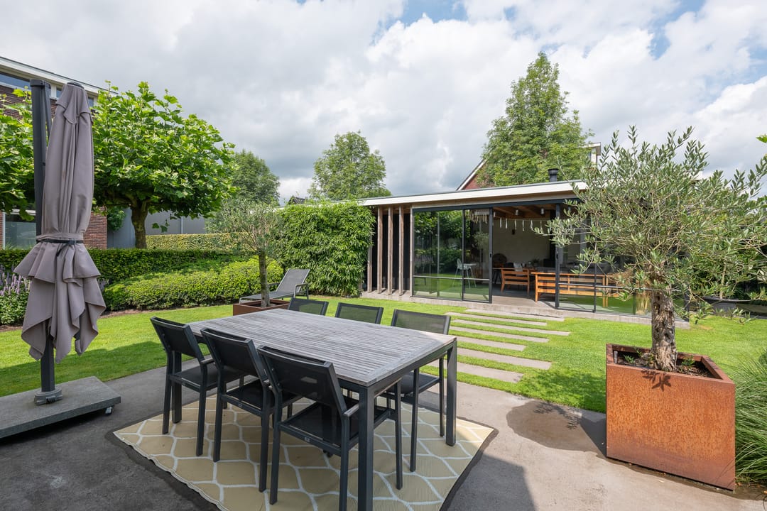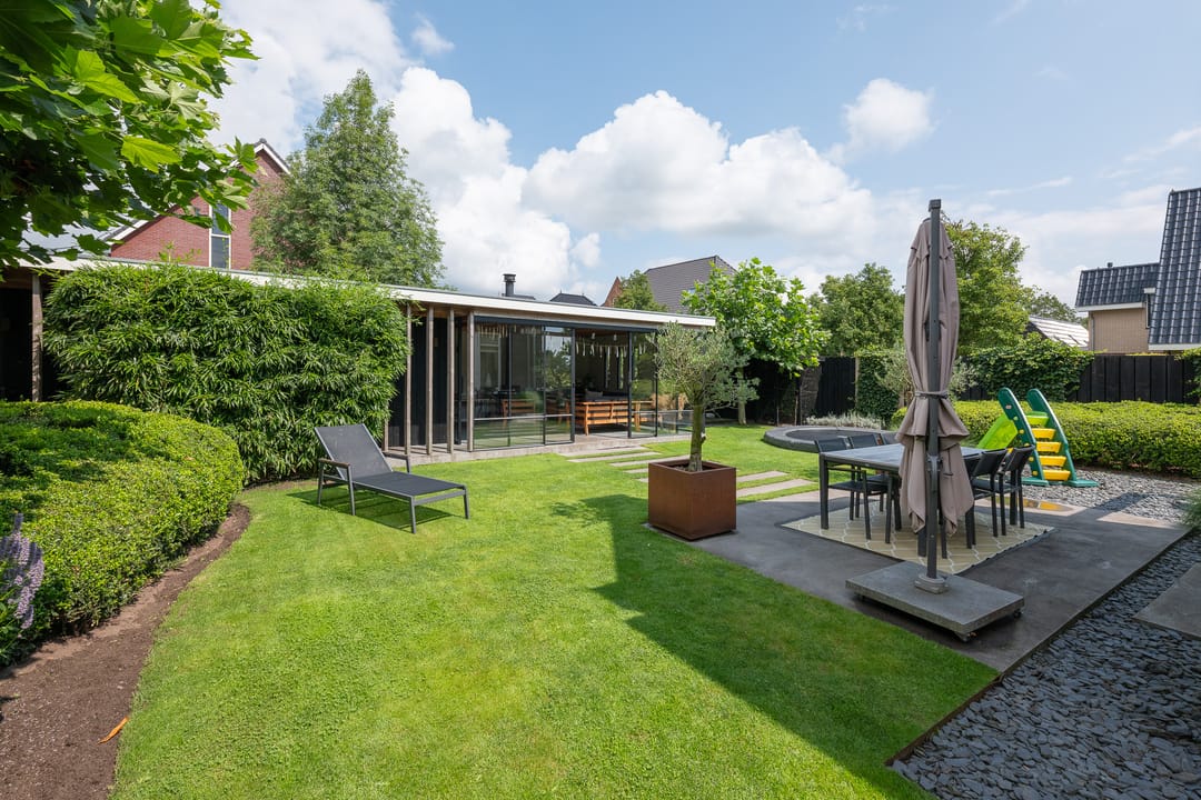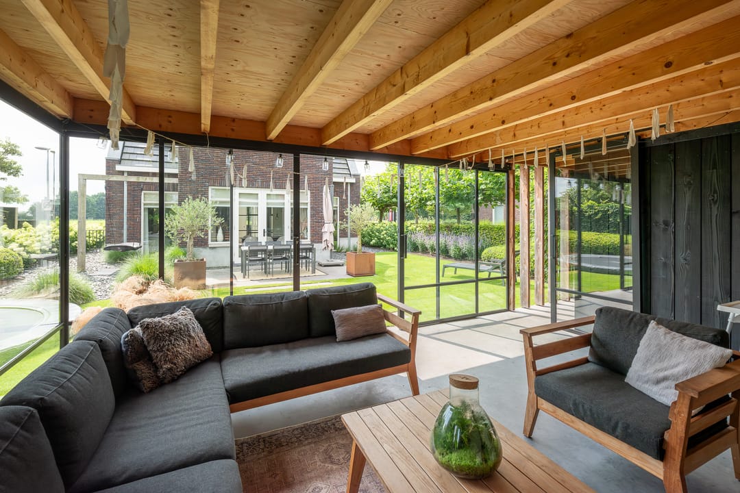 U profiteert binnenshuis van een perfecte afwerking, woonkeuken, vijf slaapkamers, praktische bijkeuken én vloerverwarming-/koeling op de begane grond en de eerste verdieping. Buitenshuis geniet u elke dag opnieuw van de keurig aangelegde achtertuin. Heerlijk op het terras of tot in de late uurtjes in de veranda. Het bedrijfspand en de woning zijn voorzien van een aardwarmtepomp en in totaal 108 zonnepanelen wat resulteert in een uitzonderlijk hoog energielabel. En dus een lage energierekening. Achter in de tuin staat een prachtige veranda/tuinkamer, een echte blikvanger. De veranda is voorzien van softclose, geïsoleerde glazen schuifdeuren, waardoor u hier in alle seizoenen kunt genieten van het buitenleven. In de zomermaanden kunt u de schuifdeuren openen, zodat de veranda en de tuin naadloos in elkaar overlopen.