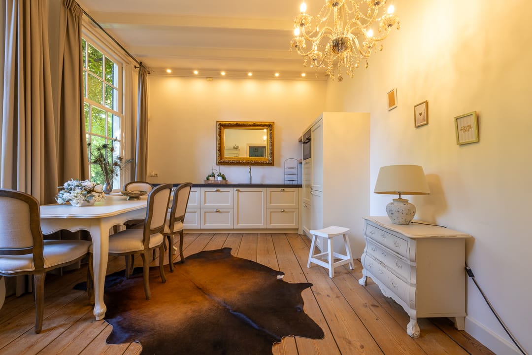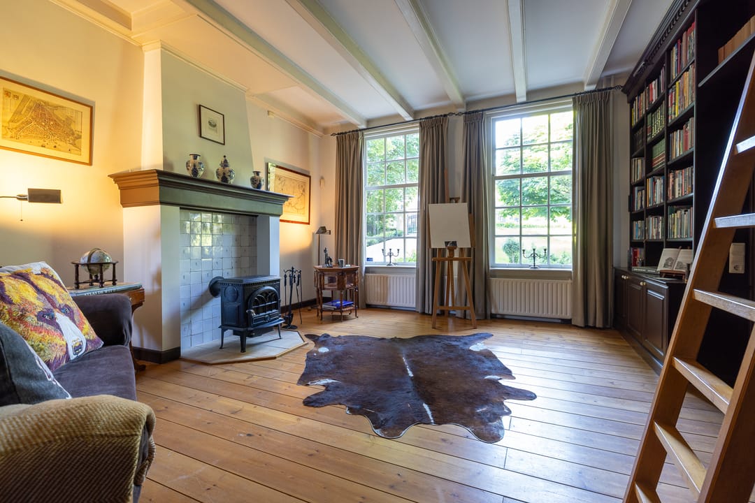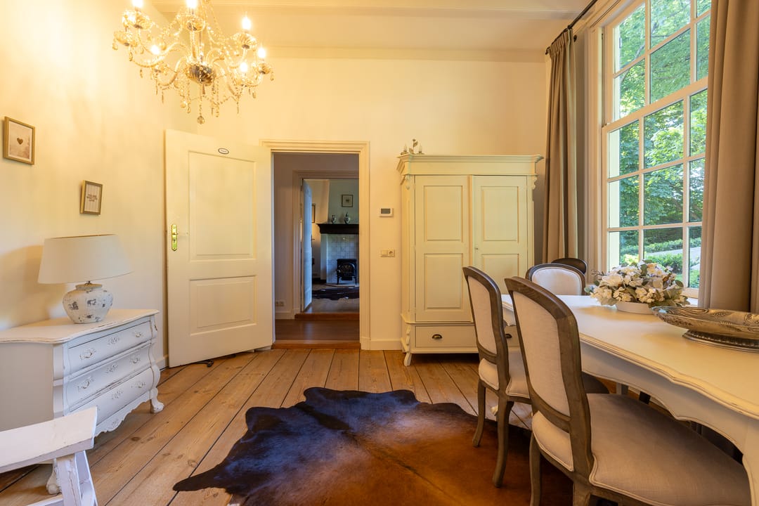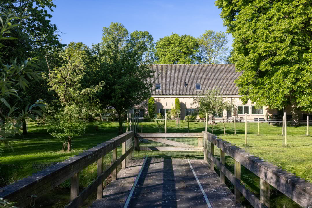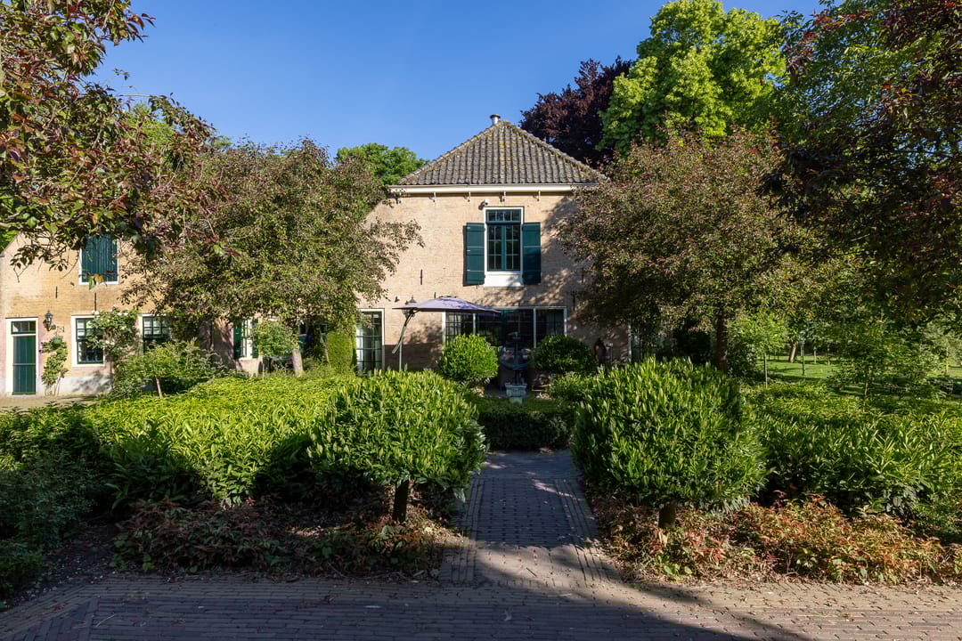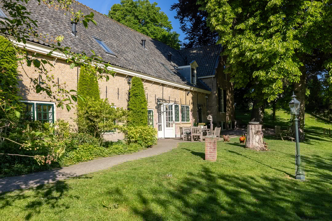 De monumentale opzet, de oude kastanjebomen langs de oprijlaan en de fraaie gevelsteen met jaartal boven de entree zetten direct de toon. Binnen is het oorspronkelijke karakter behouden gebleven, met onder andere estriken vloeren, hoge balkenplafonds, originele paneeldeuren en robuuste gebinten. De voormalige deel (schuur) is smaakvol getransformeerd tot royale living met open haard en stalramen. Aangrenzend ligt de landelijke woonkeuken met kookeiland en uitzicht op de boomgaard. In het voorhuis bevinden zich meerdere sfeervolle vertrekken, waaronder een bibliotheek, een werkkamer en een riante slaapkamer met eigen badkamer en inloopkast.