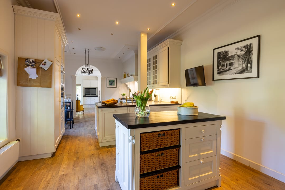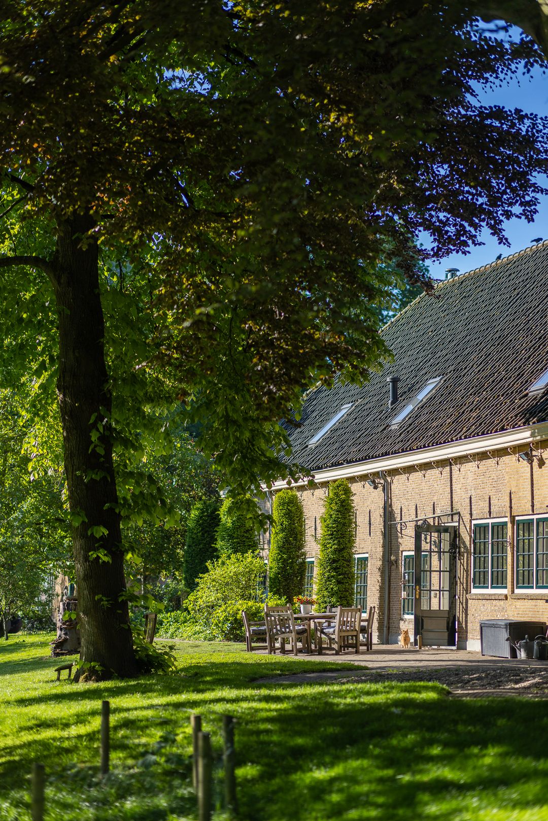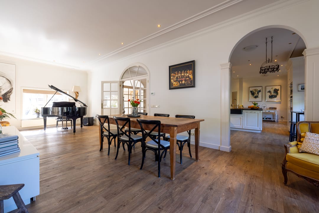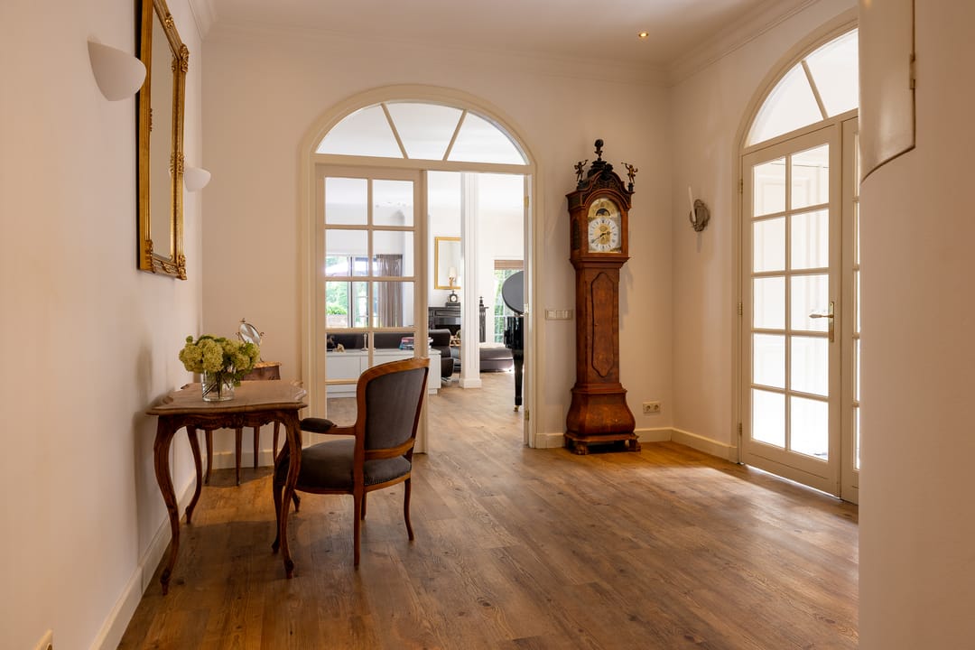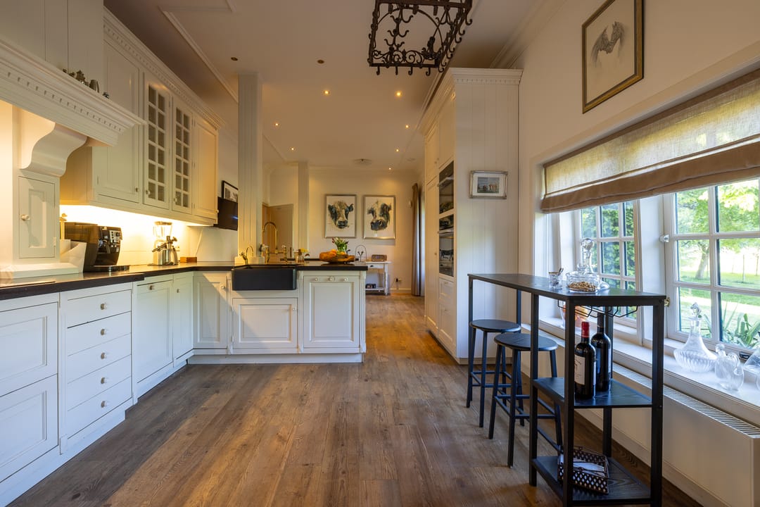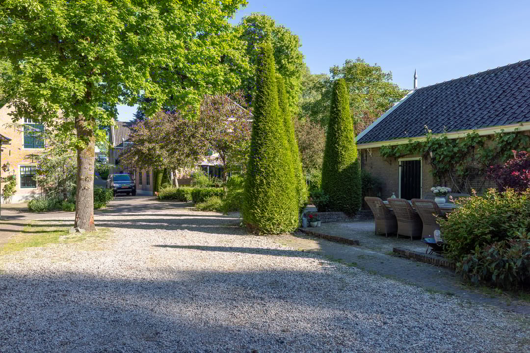 De monumentale opzet, de oude kastanjebomen langs de oprijlaan en de fraaie gevelsteen met jaartal boven de entree zetten direct de toon. Binnen is het oorspronkelijke karakter behouden gebleven, met onder andere estriken vloeren, hoge balkenplafonds, originele paneeldeuren en robuuste gebinten. De voormalige deel (schuur) is smaakvol getransformeerd tot royale living met open haard en stalramen. Aangrenzend ligt de landelijke woonkeuken met kookeiland en uitzicht op de boomgaard. In het voorhuis bevinden zich meerdere sfeervolle vertrekken, waaronder een bibliotheek, een werkkamer en een riante slaapkamer met eigen badkamer en inloopkast.