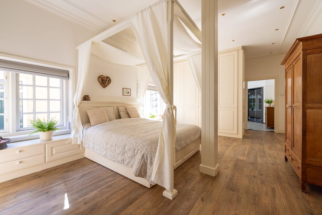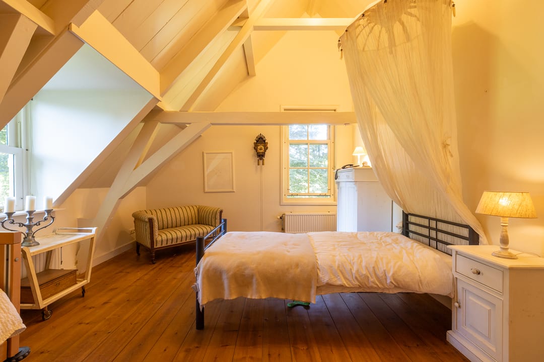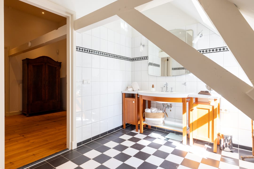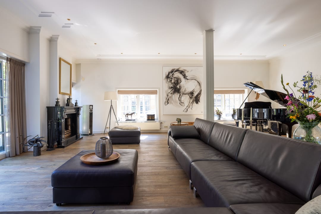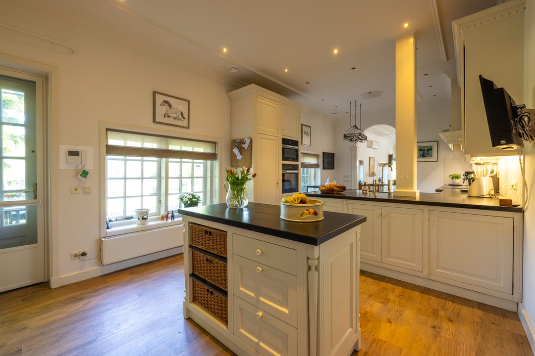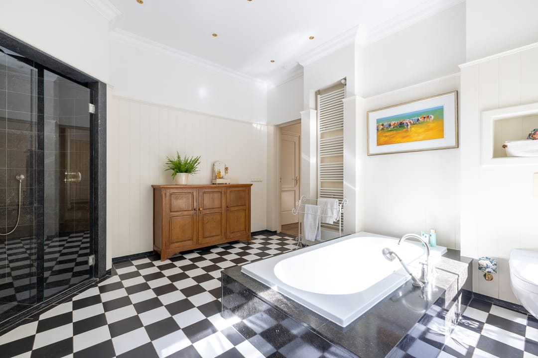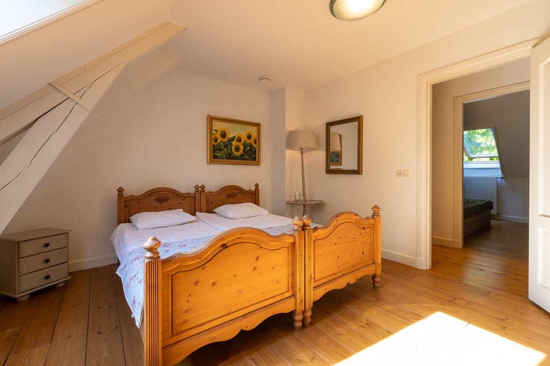 De monumentale opzet, de oude kastanjebomen langs de oprijlaan en de fraaie gevelsteen met jaartal boven de entree zetten direct de toon. Binnen is het oorspronkelijke karakter behouden gebleven, met onder andere estriken vloeren, hoge balkenplafonds, originele paneeldeuren en robuuste gebinten. De voormalige deel (schuur) is smaakvol getransformeerd tot royale living met open haard en stalramen. Aangrenzend ligt de landelijke woonkeuken met kookeiland en uitzicht op de boomgaard. In het voorhuis bevinden zich meerdere sfeervolle vertrekken, waaronder een bibliotheek, een werkkamer en een riante slaapkamer met eigen badkamer en inloopkast.