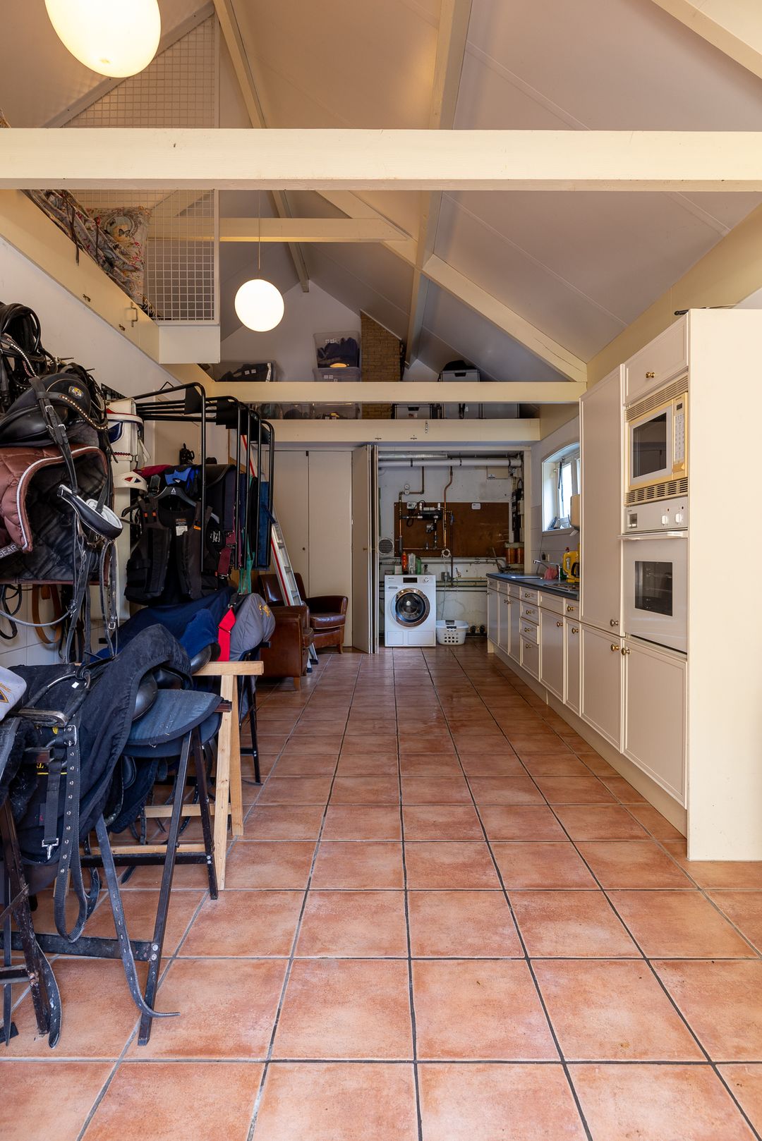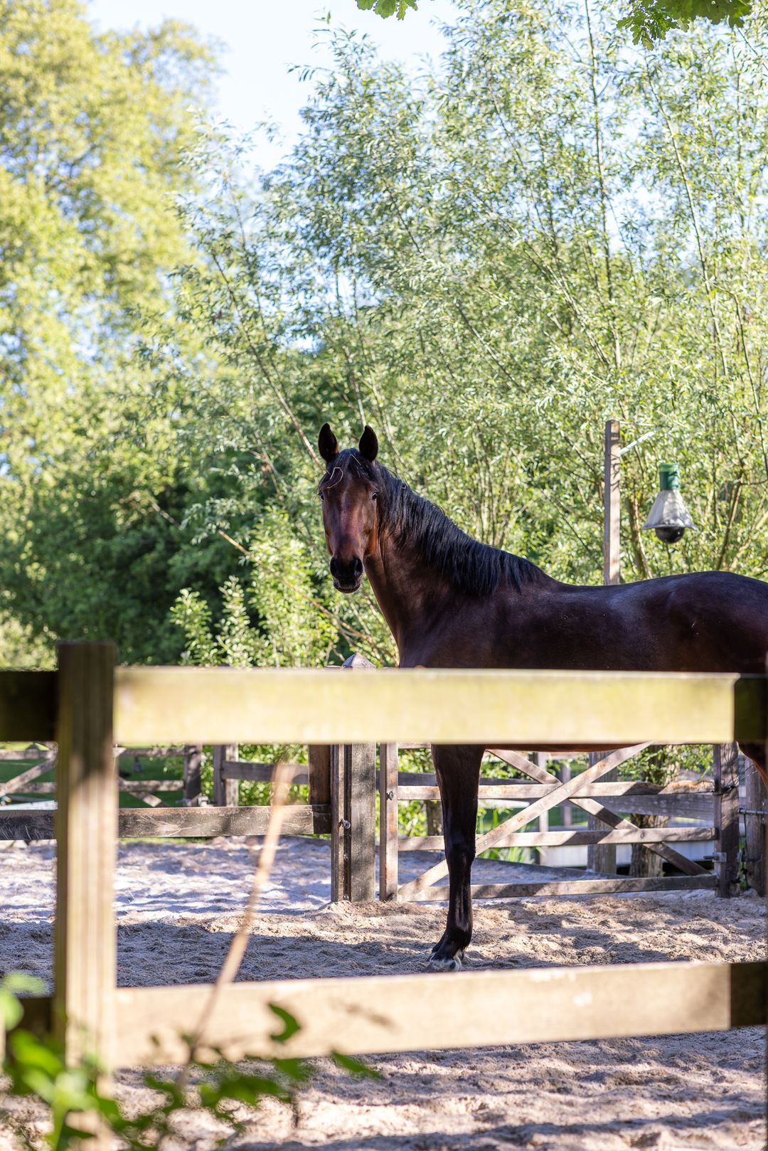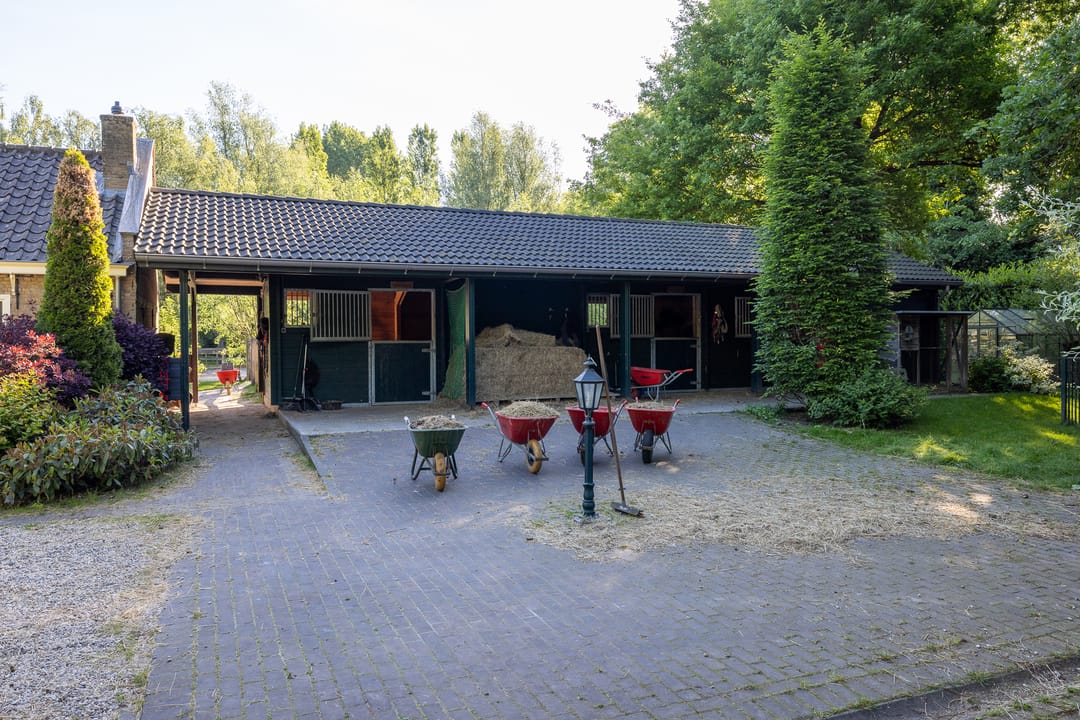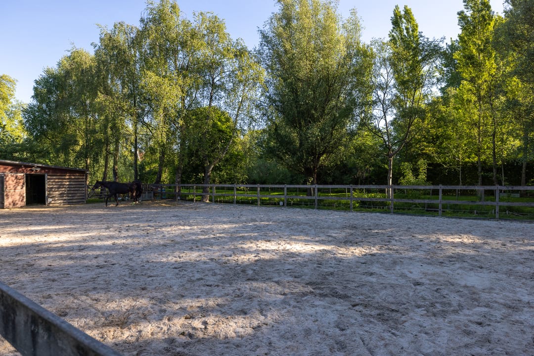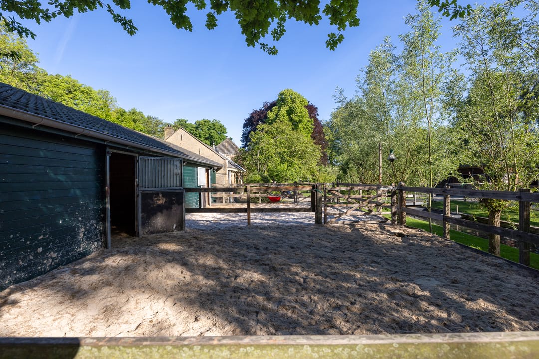 De paardenfaciliteiten zijn compleet en professioneel opgezet: vijf ruime boxen, een zadelkamer, een buitenrijbaan met Agterberg bodem en weiland met omheining. Alles is functioneel én esthetisch ingepast in het geheel, in stijl met de historische gebouwen.
