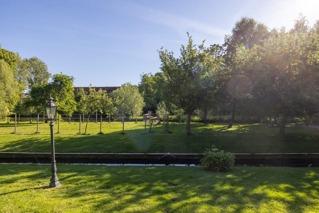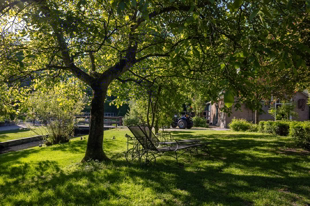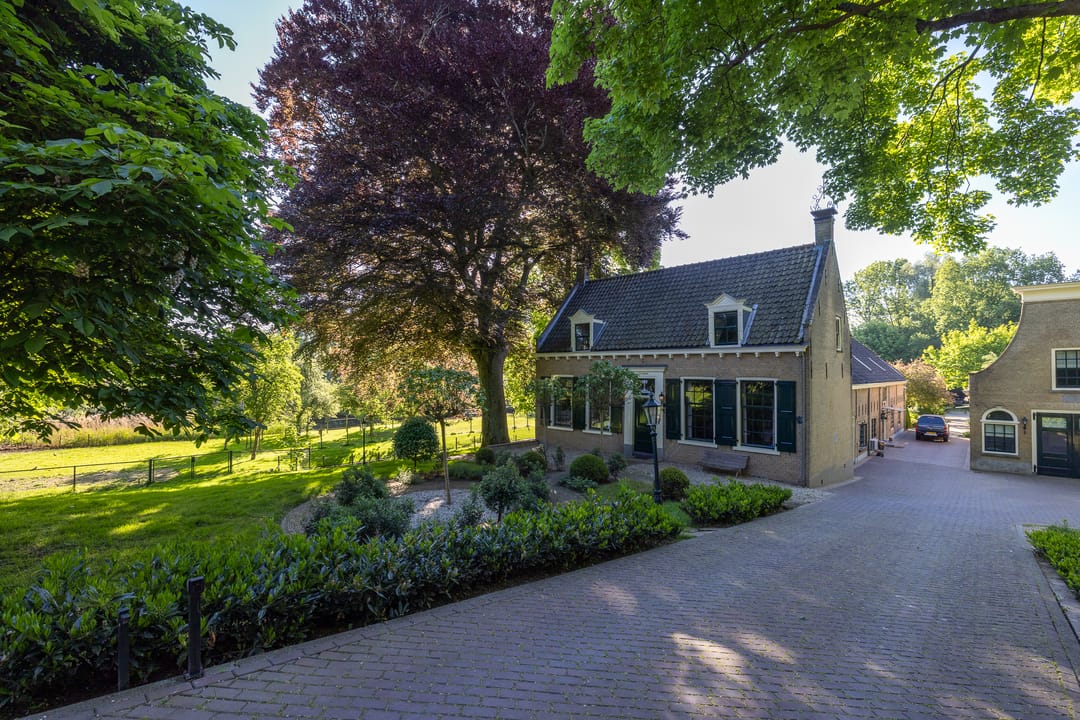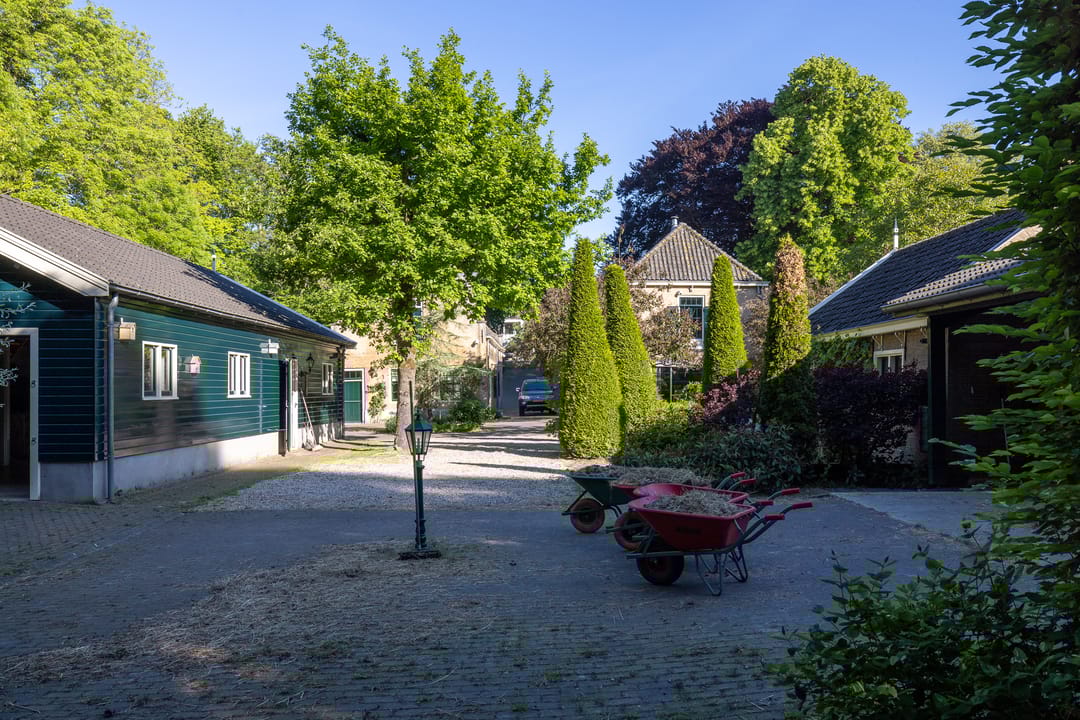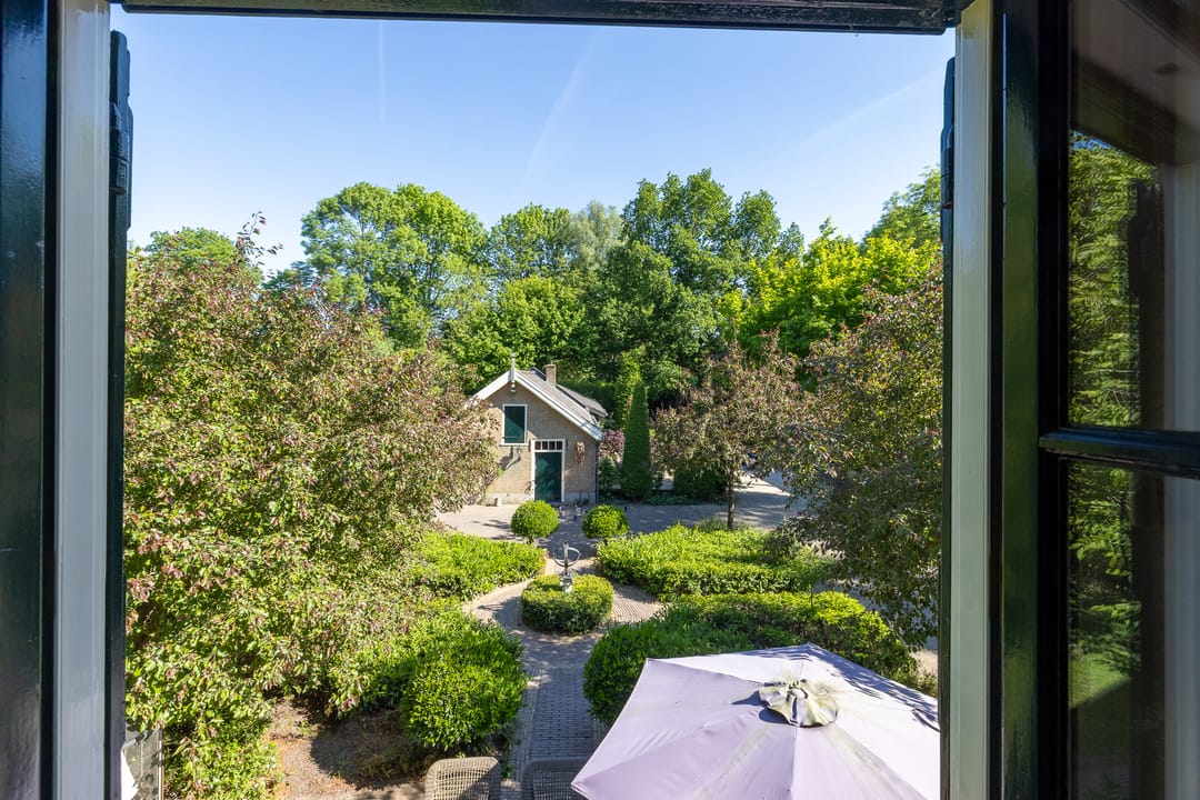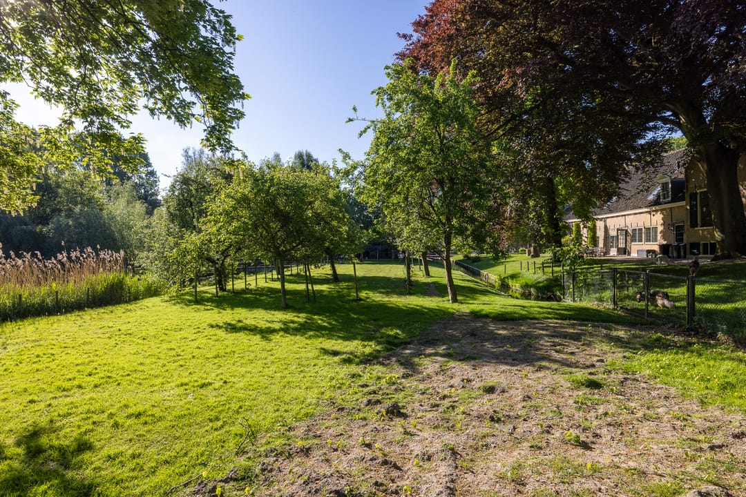 Het erf is parkachtig en biedt rust, privacy en groen in overvloed. De tuin rondom de woning is fraai aangelegd met terrassen, waterpartijen, oude beplanting en uitzicht op de omliggende weilanden. Het vrijstaande koetshuis met boogdeuren is thans in gebruik als kantoor, maar leent zich ook als gastenverblijf, atelier of praktijk aan huis.