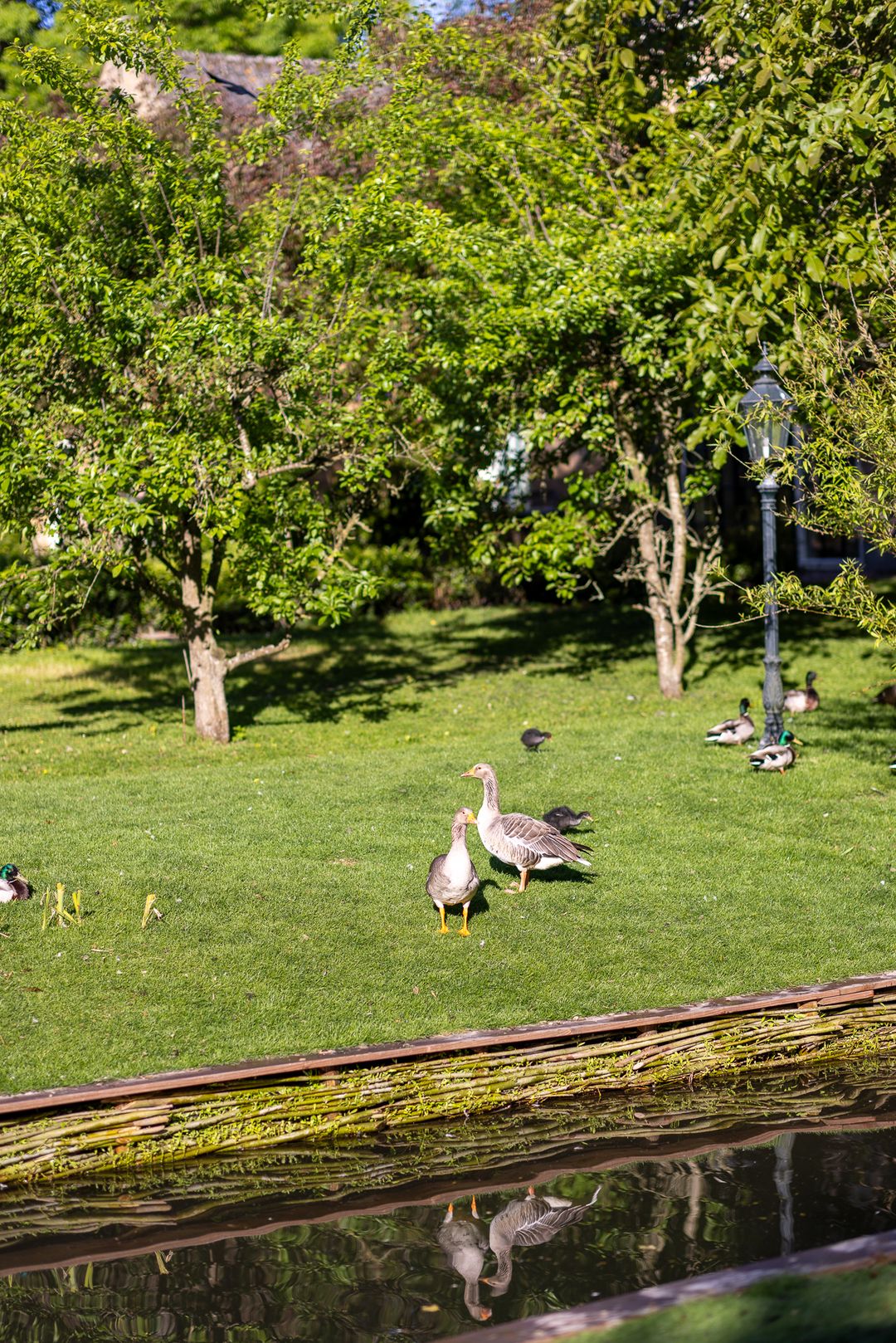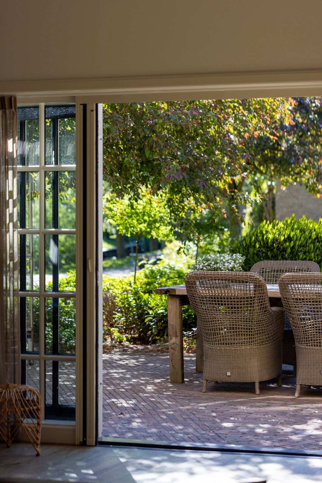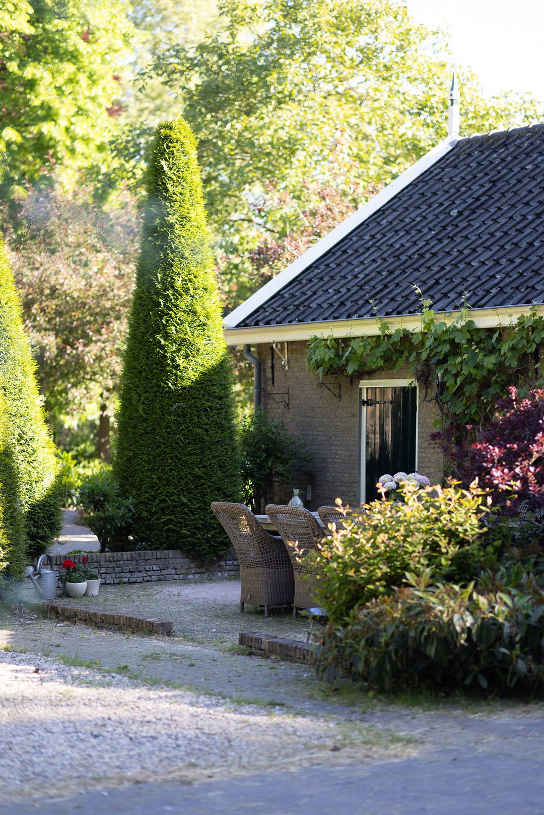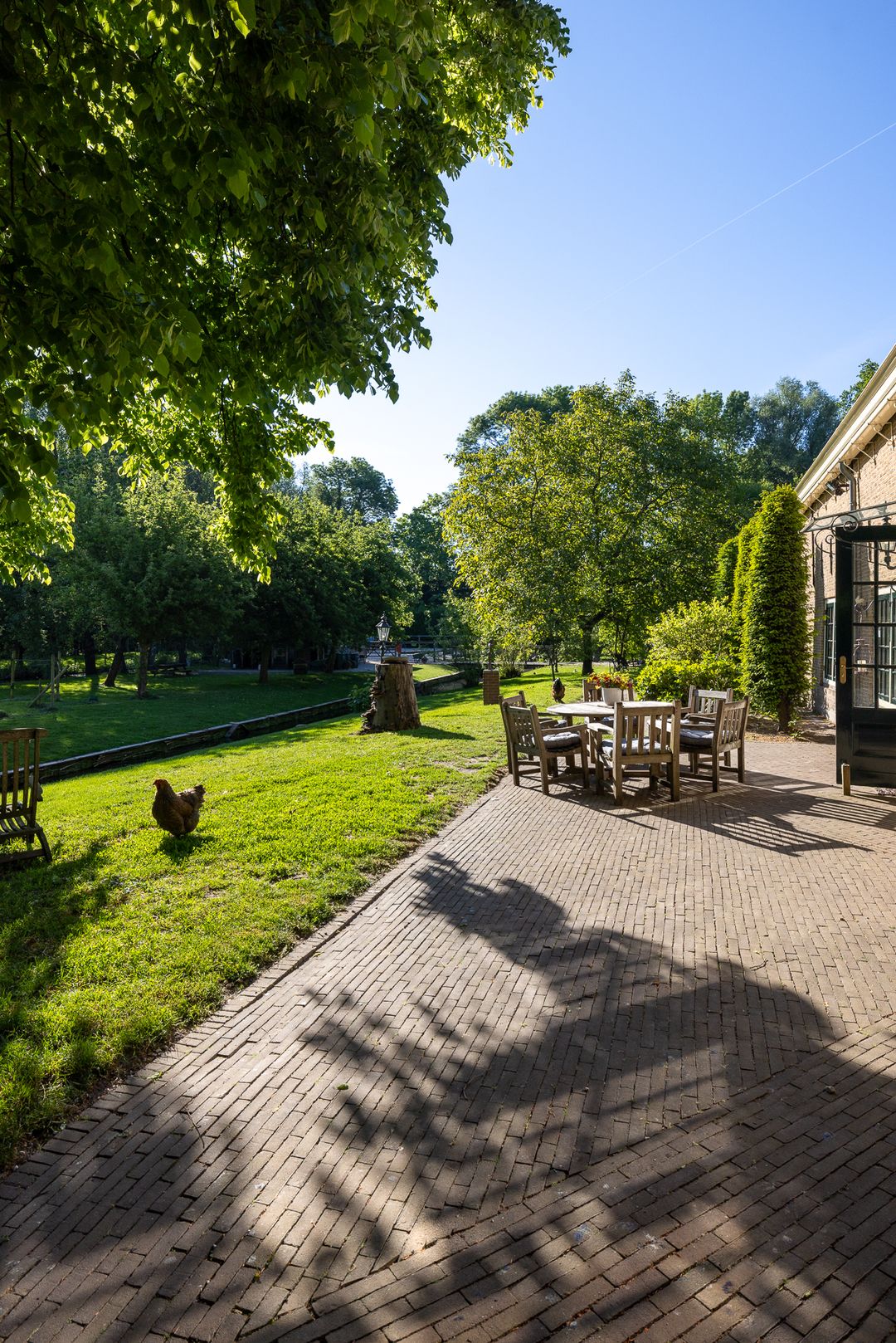 Het erf is parkachtig en biedt rust, privacy en groen in overvloed. De tuin rondom de woning is fraai aangelegd met terrassen, waterpartijen, oude beplanting en uitzicht op de omliggende weilanden. Het vrijstaande koetshuis met boogdeuren is thans in gebruik als kantoor, maar leent zich ook als gastenverblijf, atelier of praktijk aan huis.