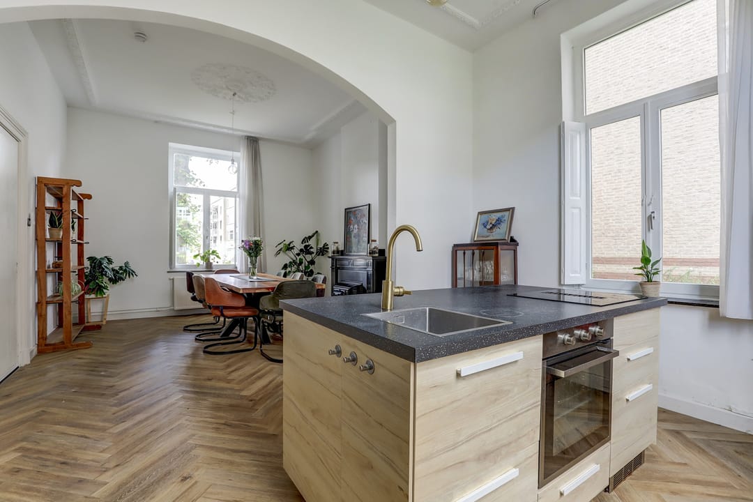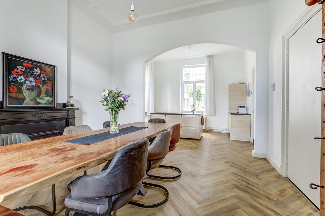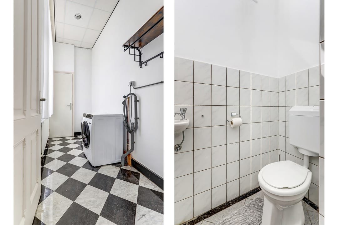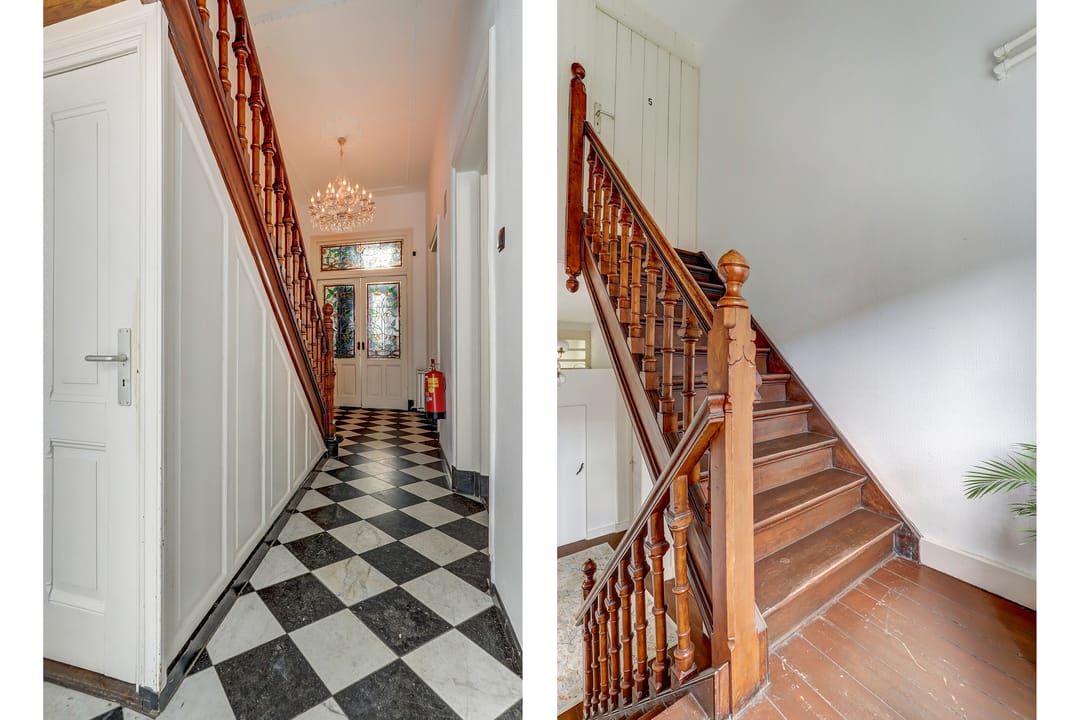 Representatieve entree met authentieke trappartij. De huidige woon- en eetkamers lenen zich uitstekend als kantoorruimtes of spreekkamers. De moderne keuken kan tevens functioneren als kantine of personeelsruimte. Aan de achterzijde bevindt zich een extra hal met wasruimte en separaat toilet.
