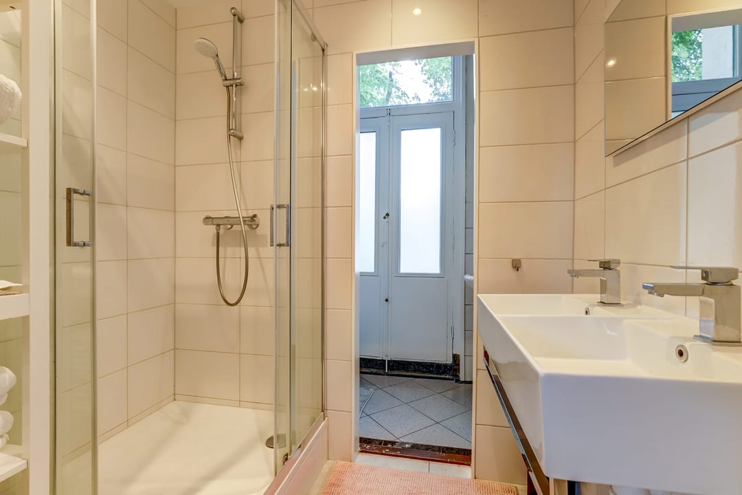 Badkamer met douche, dubbele wastafel, toilet en balkon.