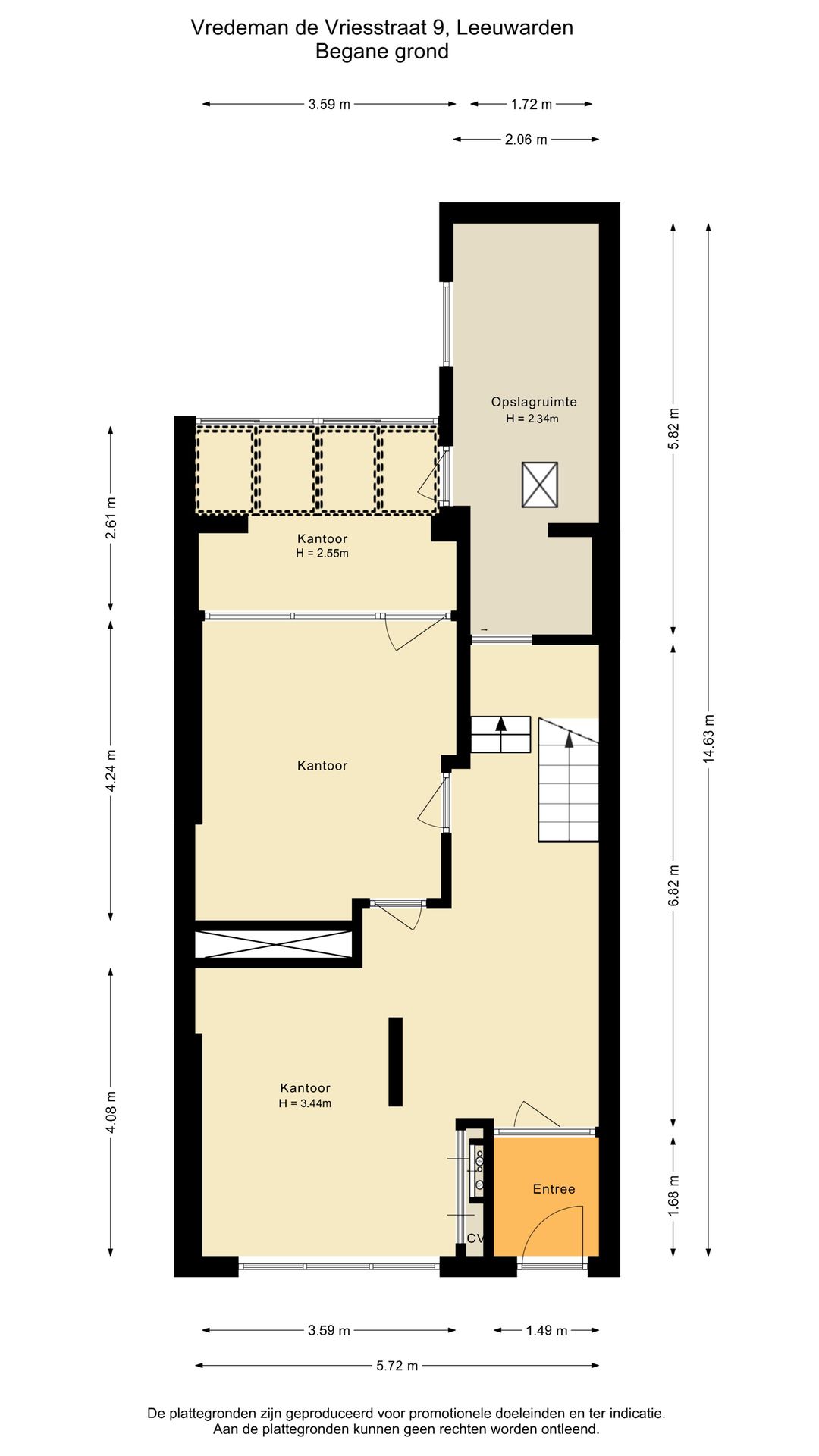 Begane grond: entree met tochtportaal, hal met receptie-/wachtruimte en meterkast, gang met een bordestrap naar de eerste verdieping en toegang tot twee behandelkamers met een verbindende tussenruimte v.v. een schuifpui naar de achtertuin. De c.v.-ketel bevindt zich in de kelder.