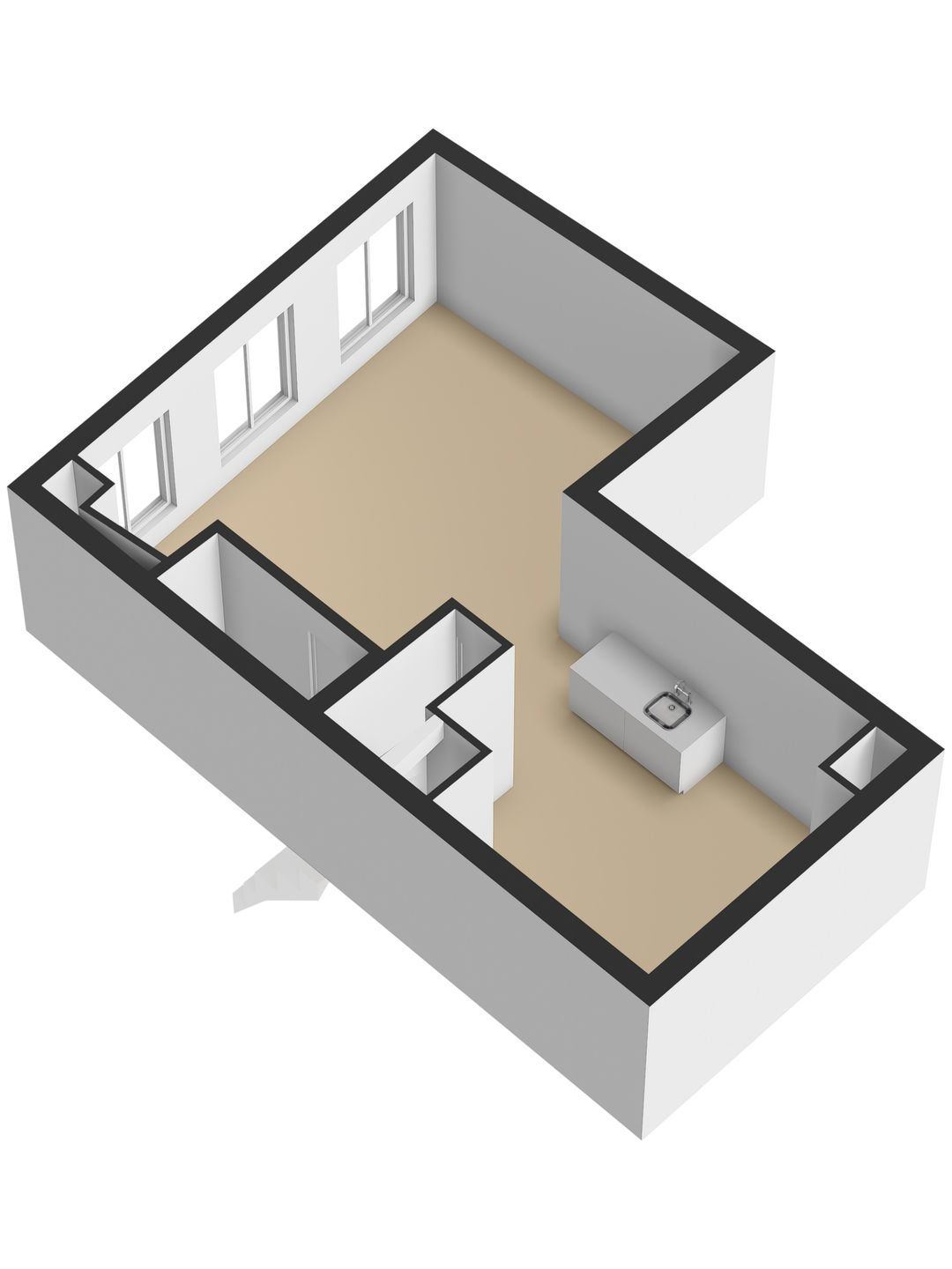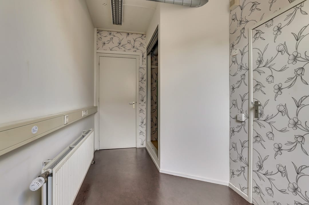 Aan de voorzijde bevindt zich de royale woonkamer. Dankzij de brede raampartijen aan de straatzijde geniet deze ruimte van een prettige lichtinval. De speelse vorm en diepte van de kamer bieden volop mogelijkheden voor een sfeervolle zitkamer of kantoorruimte.