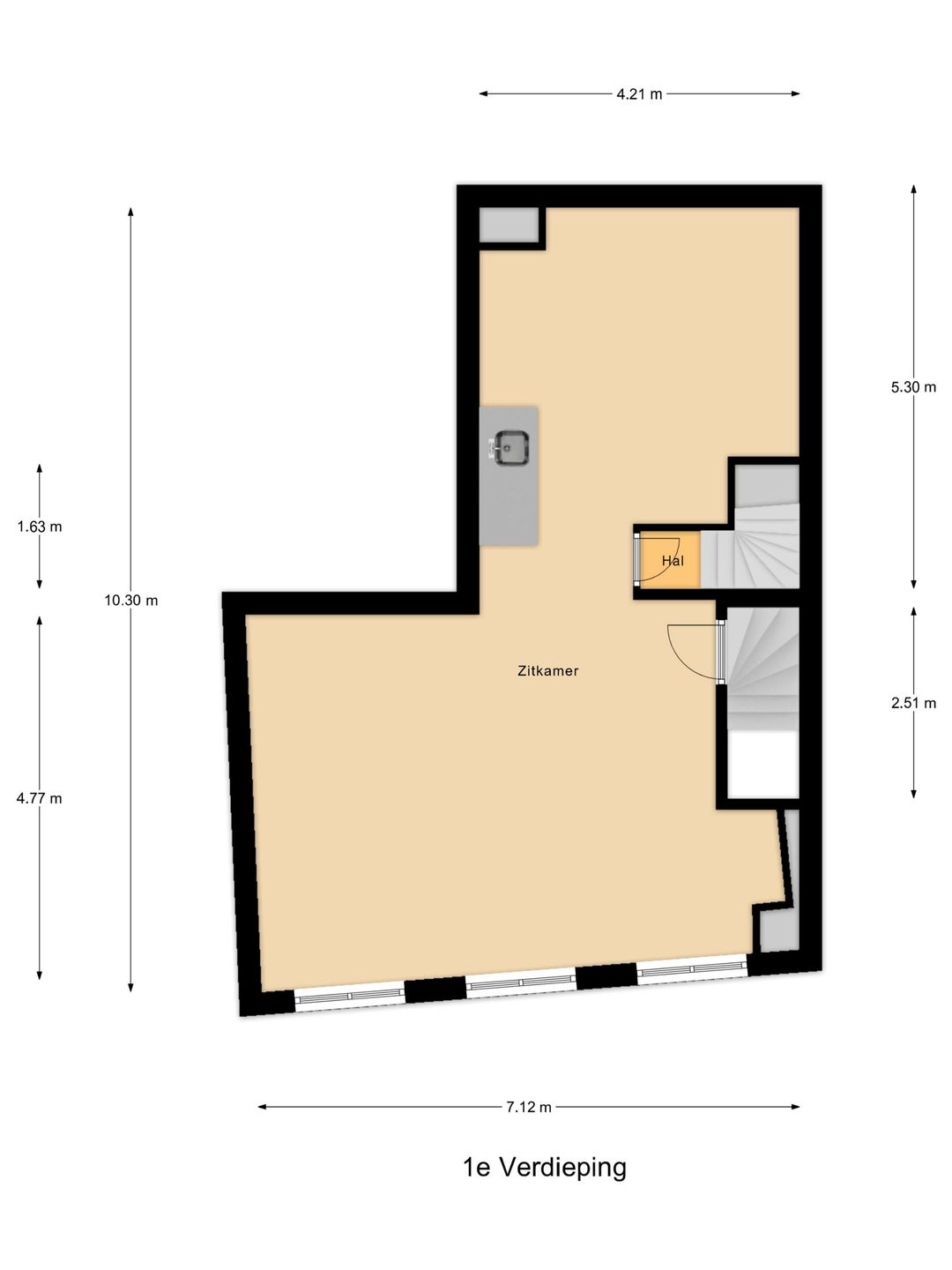 Op de eerste verdieping bevindt zich een ruime zitkamer met open karakter. Deze verdieping is uitermate geschikt als tweede woonkamer. De ruime verdieping biedt mogelijkheden om hier een comfortabele en lichte leef- of werkverdieping te realiseren. Hier is tevens al een rioolaansluiting voor een toilet aangelegd.