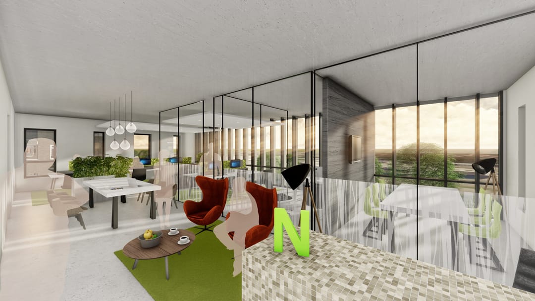 Ze vormen daarmee een goede harmonie met elkaar en de parkachtige omgeving. De grote gevelopeningen zorgen voor veel daglicht in het kantoor en een directe relatie met buiten.
