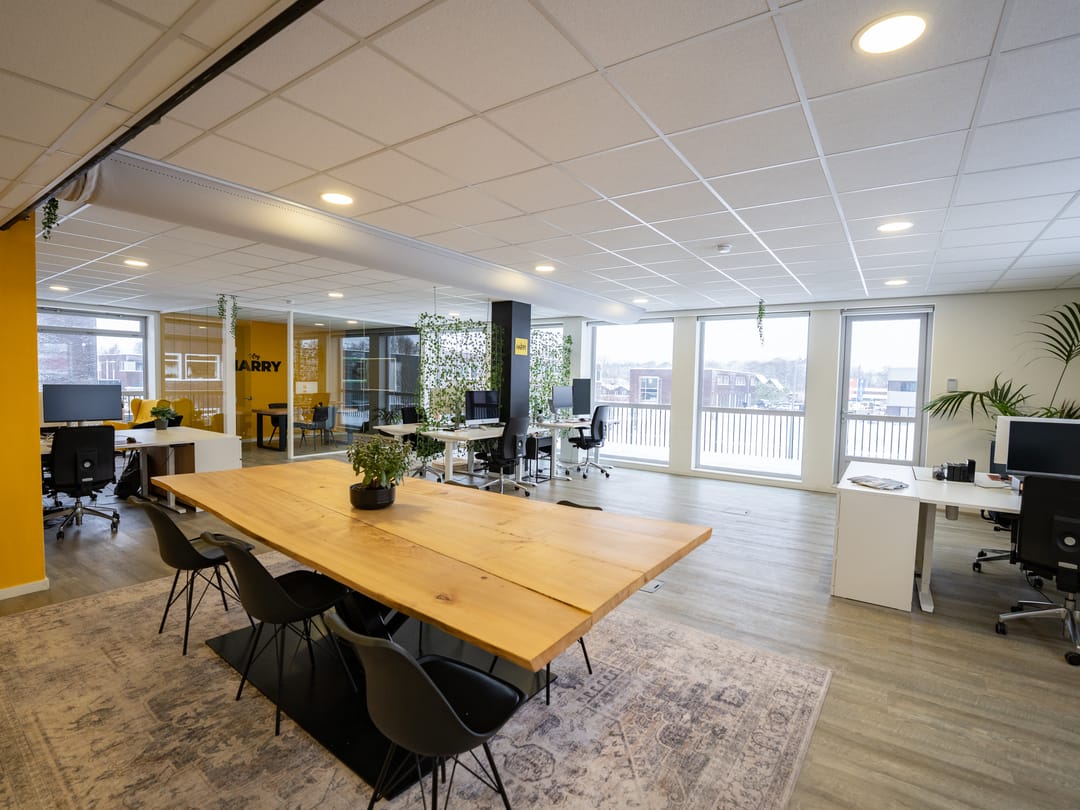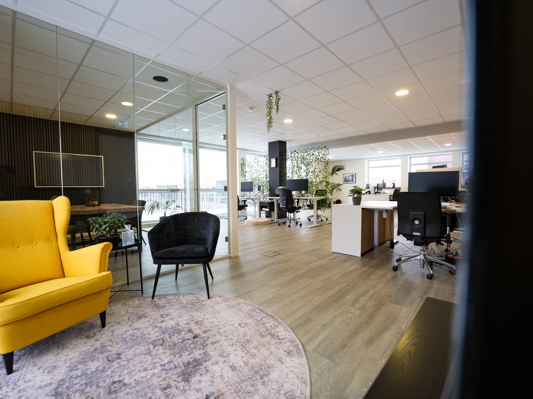 De lichte kantoorruimtes met veel glas zorgen voor een open karakter en bieden een prachtig uitzicht over de omliggende landerijen. De ruimte op de tweede verdieping voelt door het hoge plafond zeer ruimtelijk aan en combineert privacy en rust met betrokkenheid.