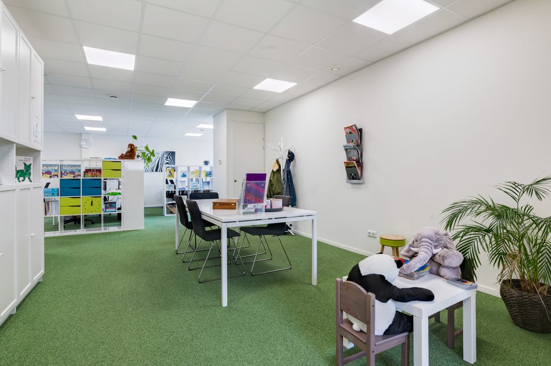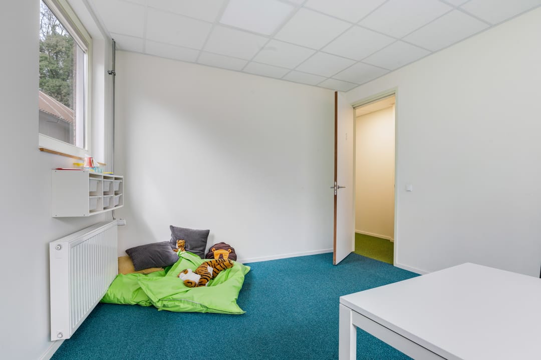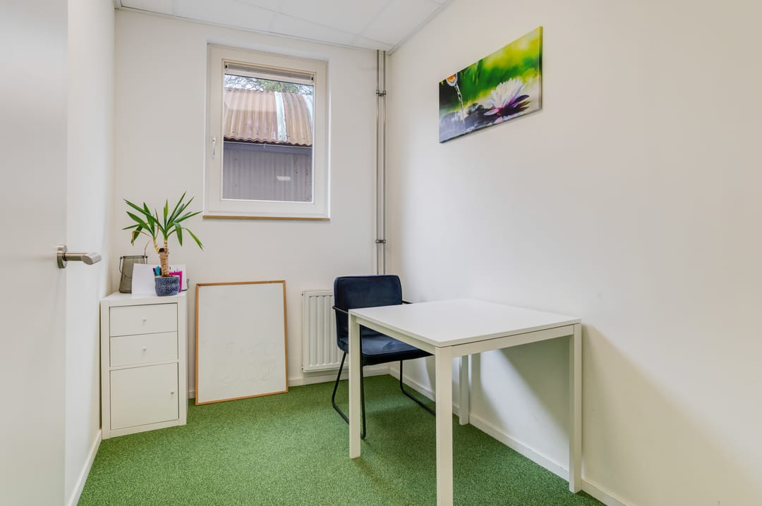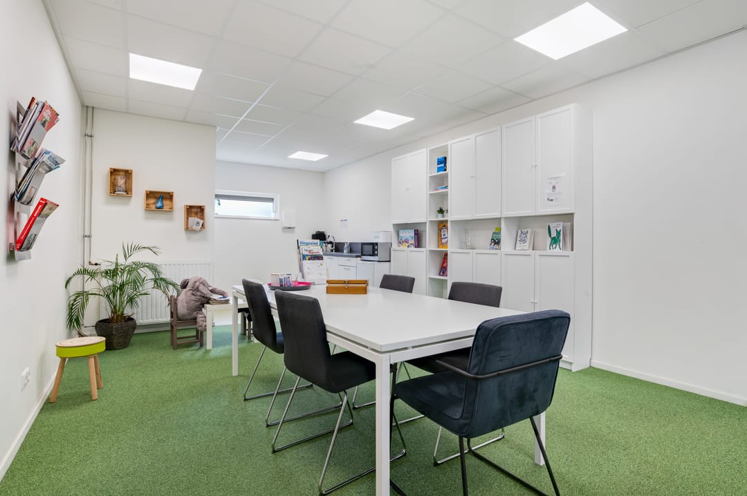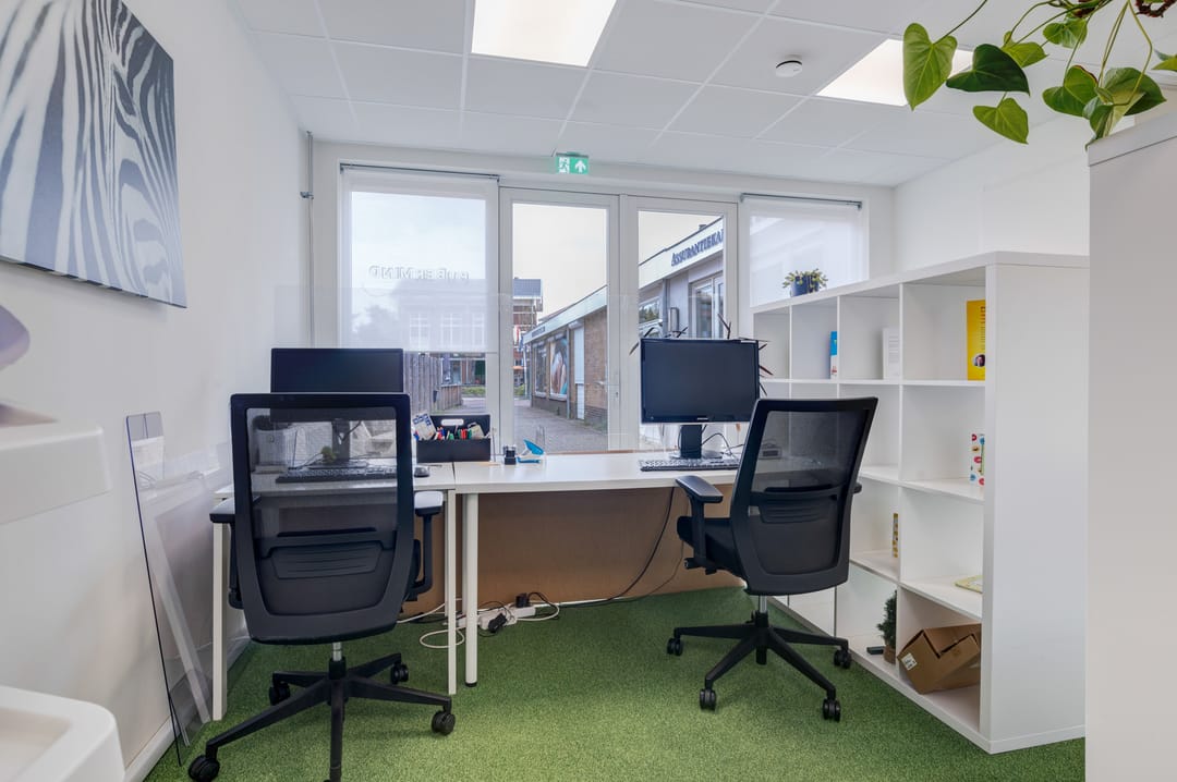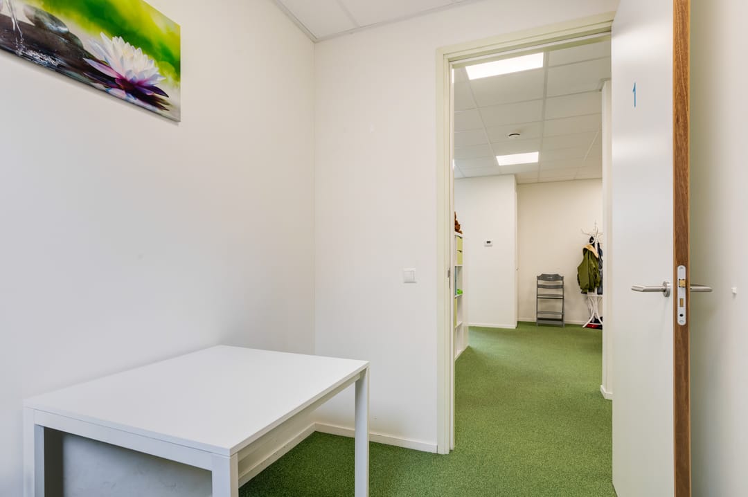 Entree aan de voorzijde middels openslaande deuren, een ruime ontvangst waar diverse mogelijkheden voor te bedenken zijn. Denk bijvoorbeeld aan het creëren van een ontvangst en diverse werkplekken. Daarnaast treft u hier een drietal, in afmeting variërend, aparte ruimtes (kantoorruimtes/ gespreksruimtes/ behandelruimtes) met extra geïsoleerde wanden.